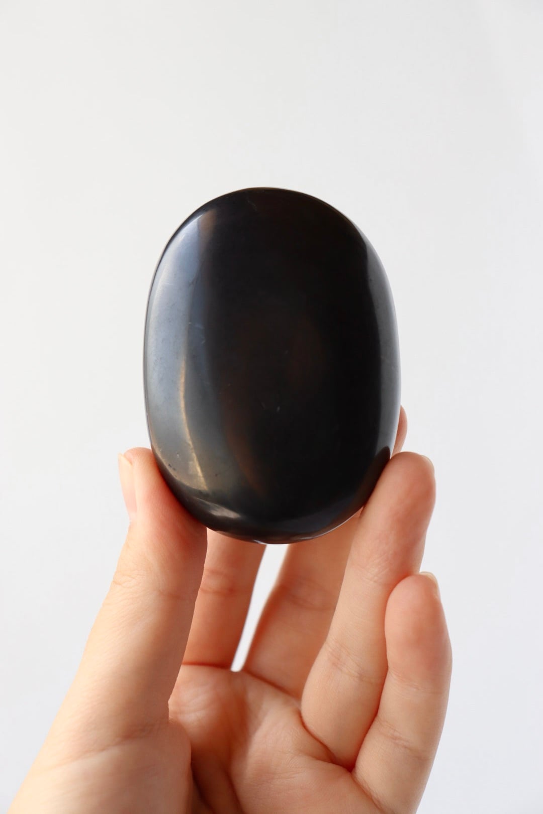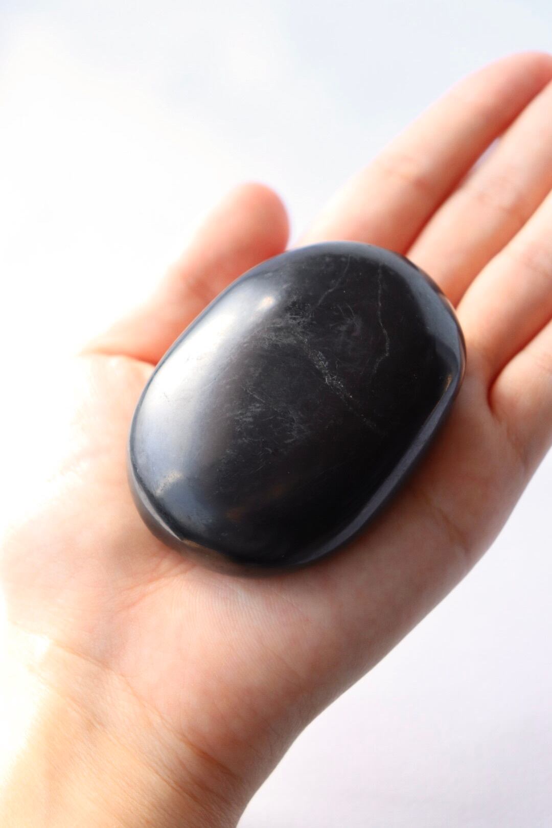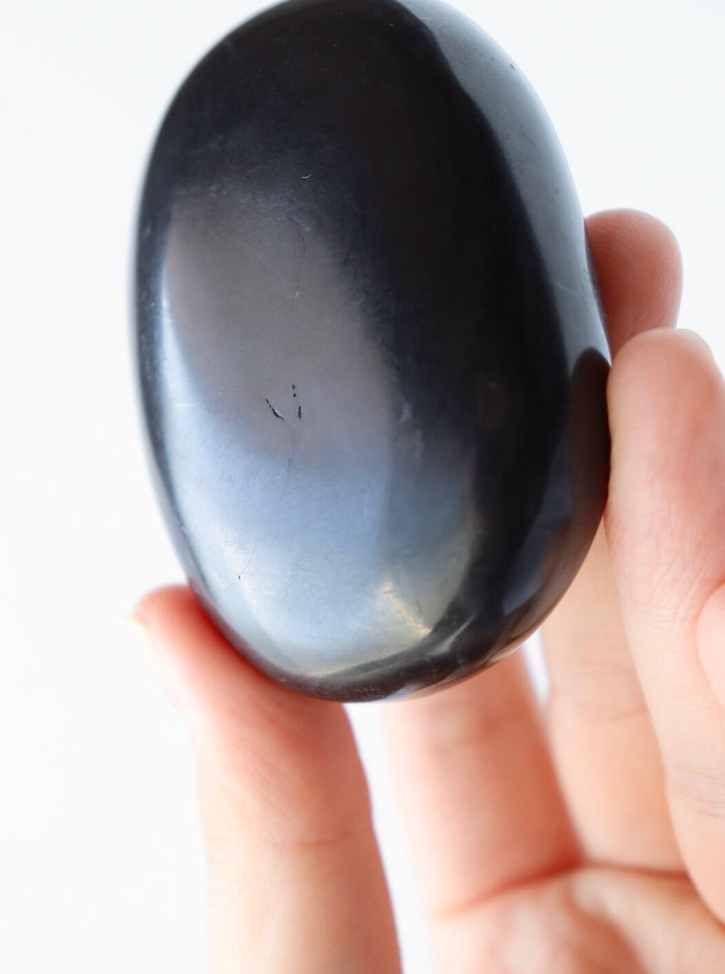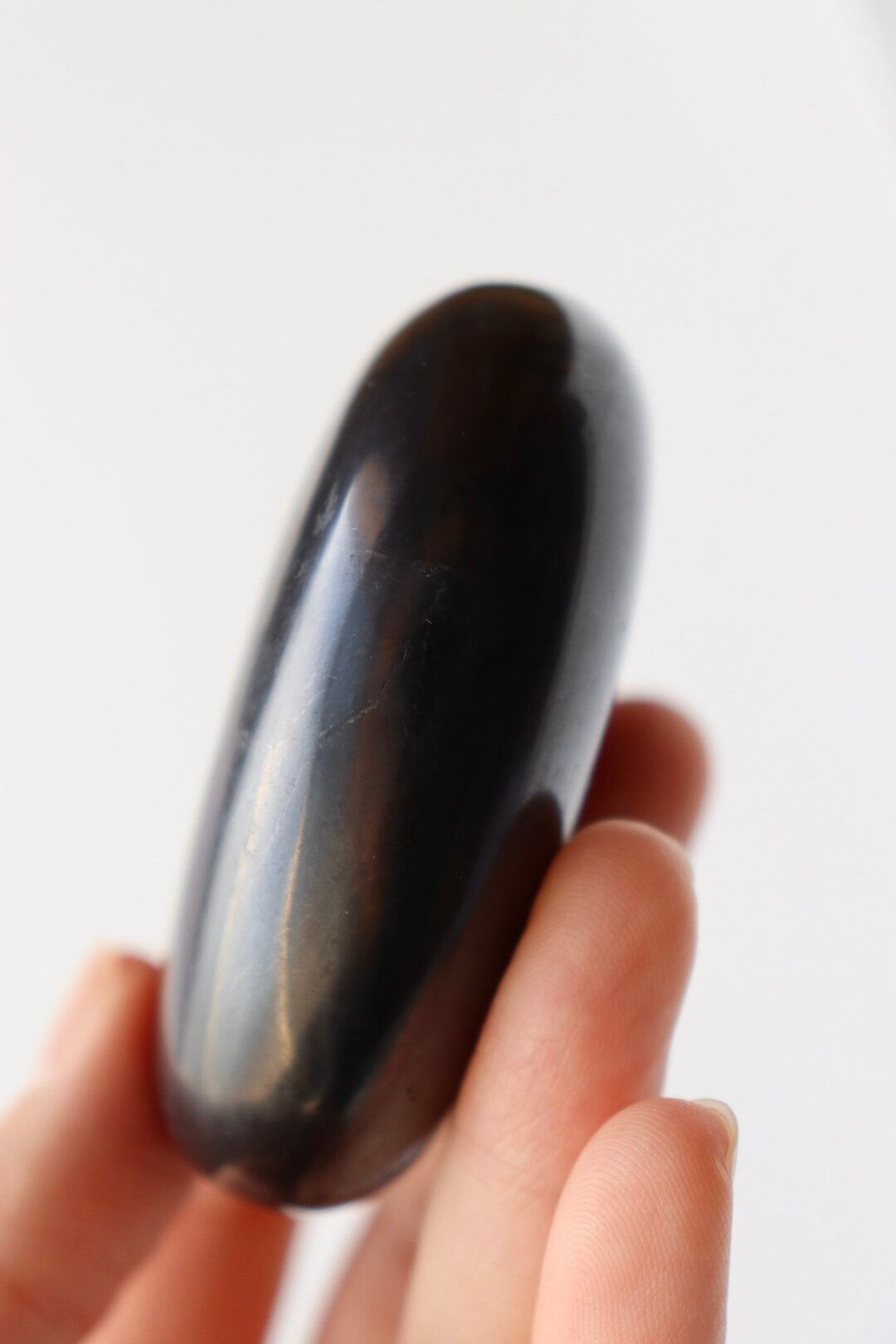 こちらは、艶のある美しいブラックカラーがつるりと磨かれたシュンガイトの握り石。