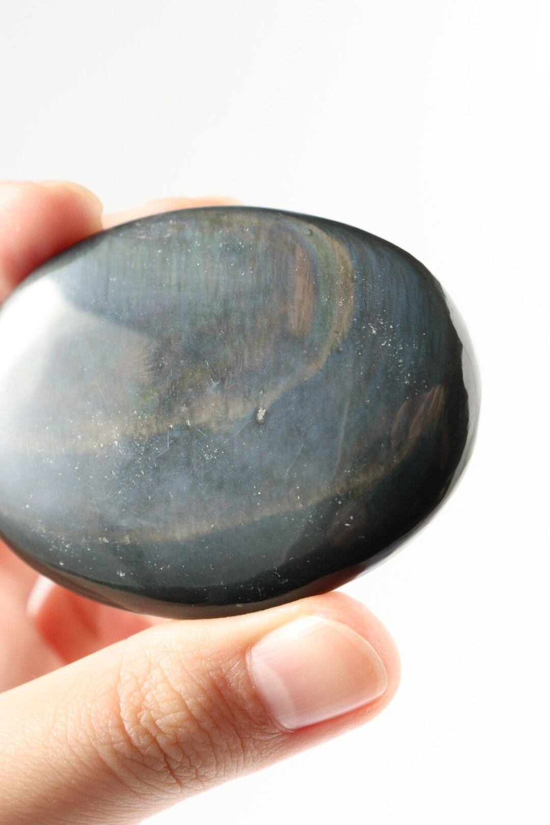 こちらは、美しい色彩が層を越えてやわらかく混ざりあった、レインボーオブシディアンの握り石。