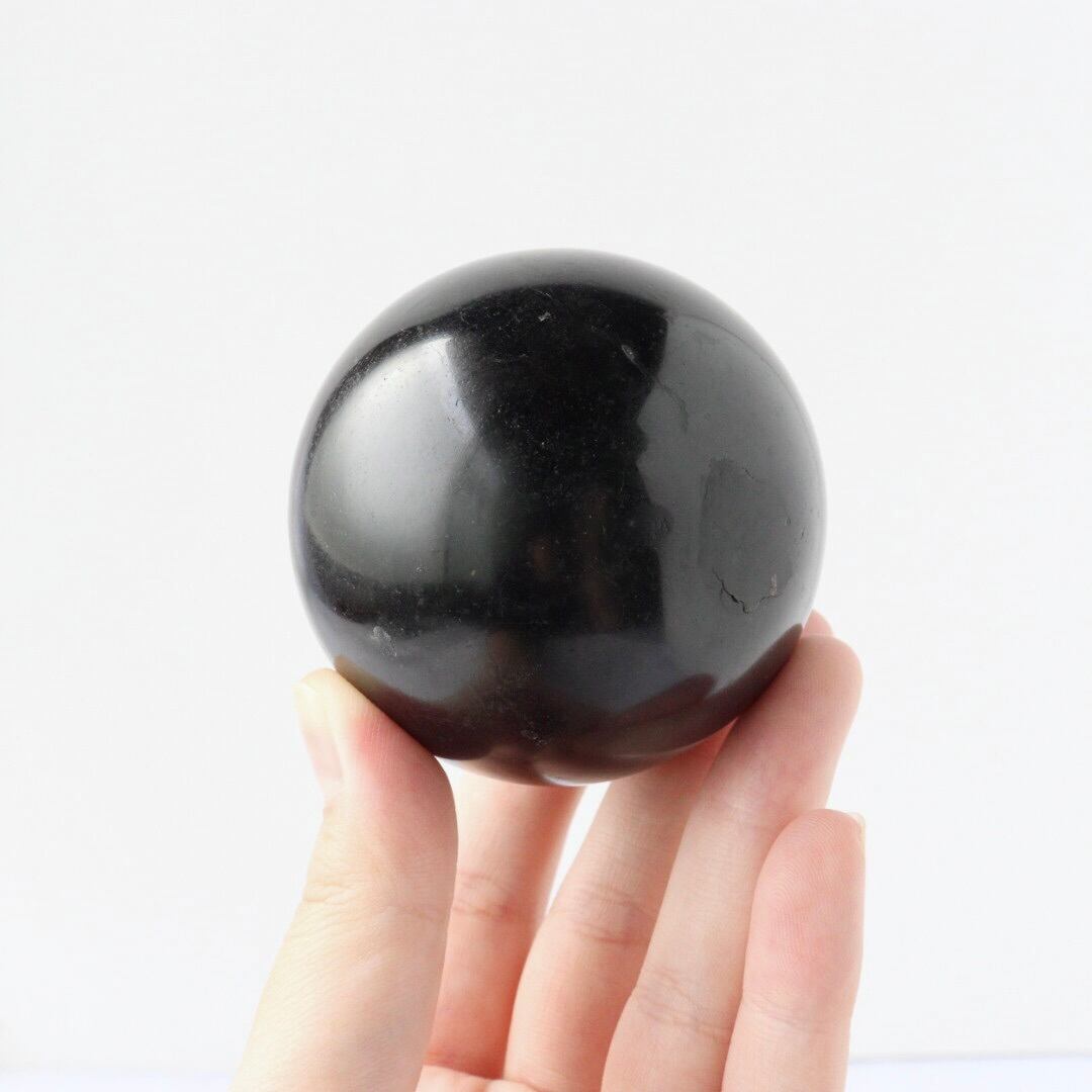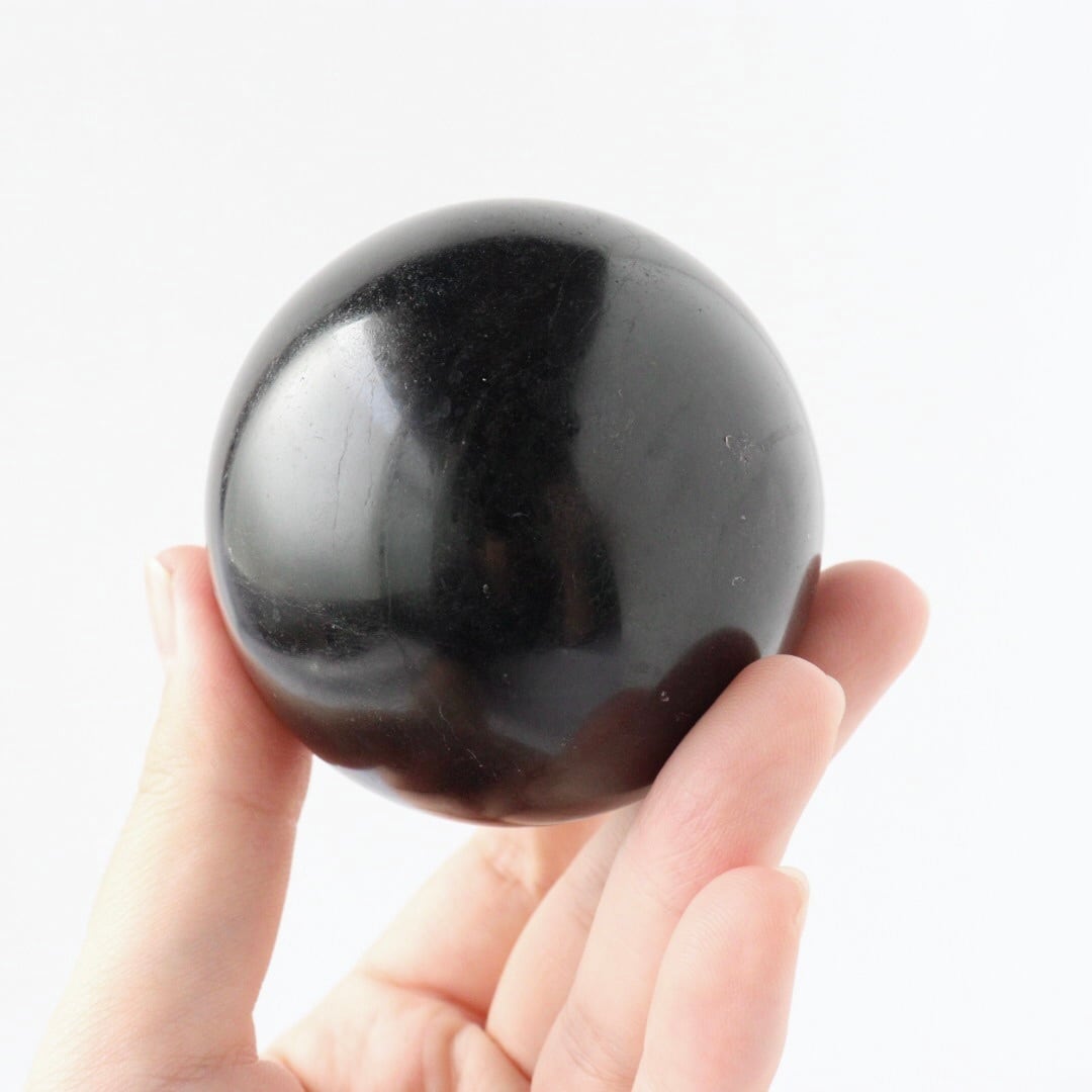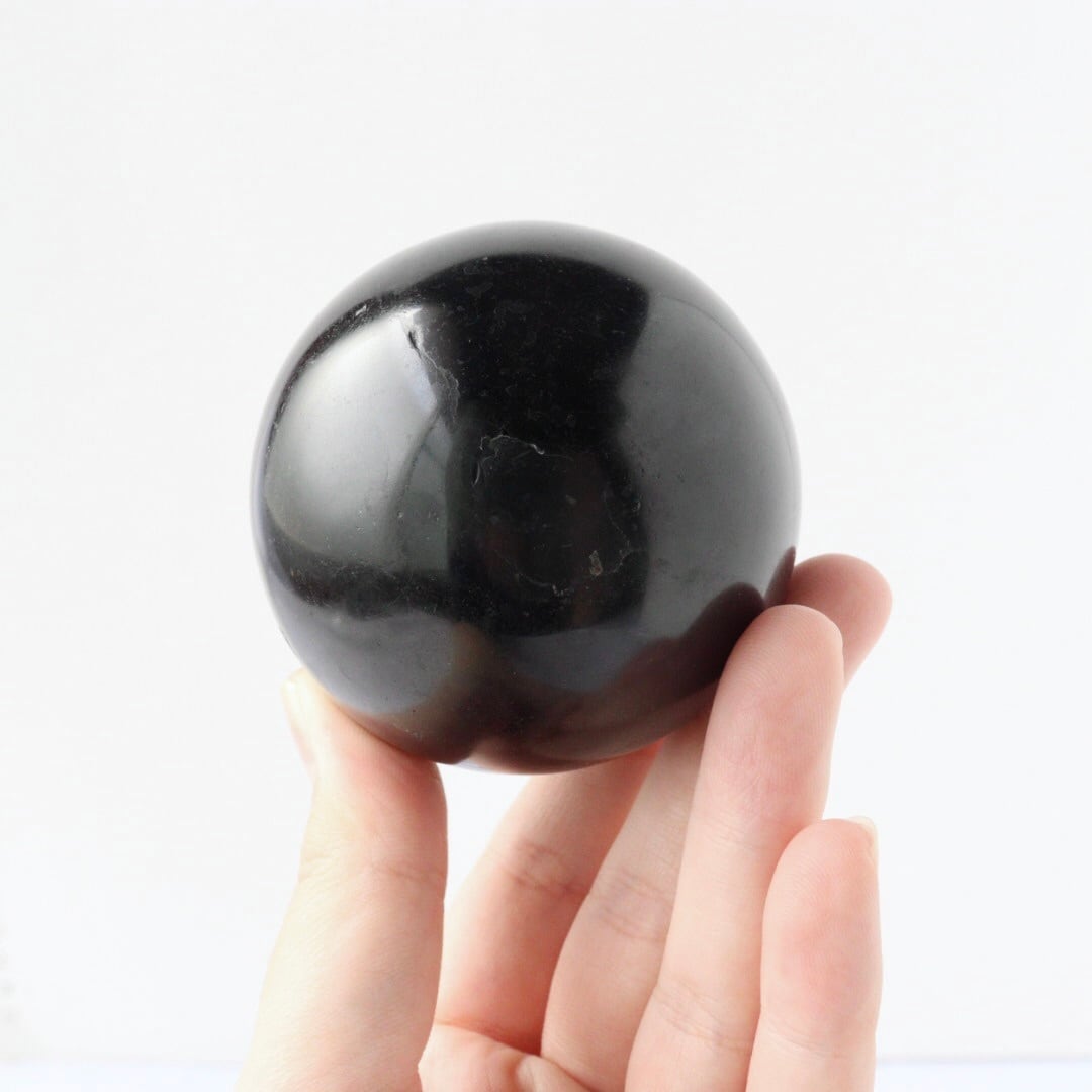 金属のような艶をまとい、深く包み込む夜のような輝きを放つブラックトルマリンのスフィア。