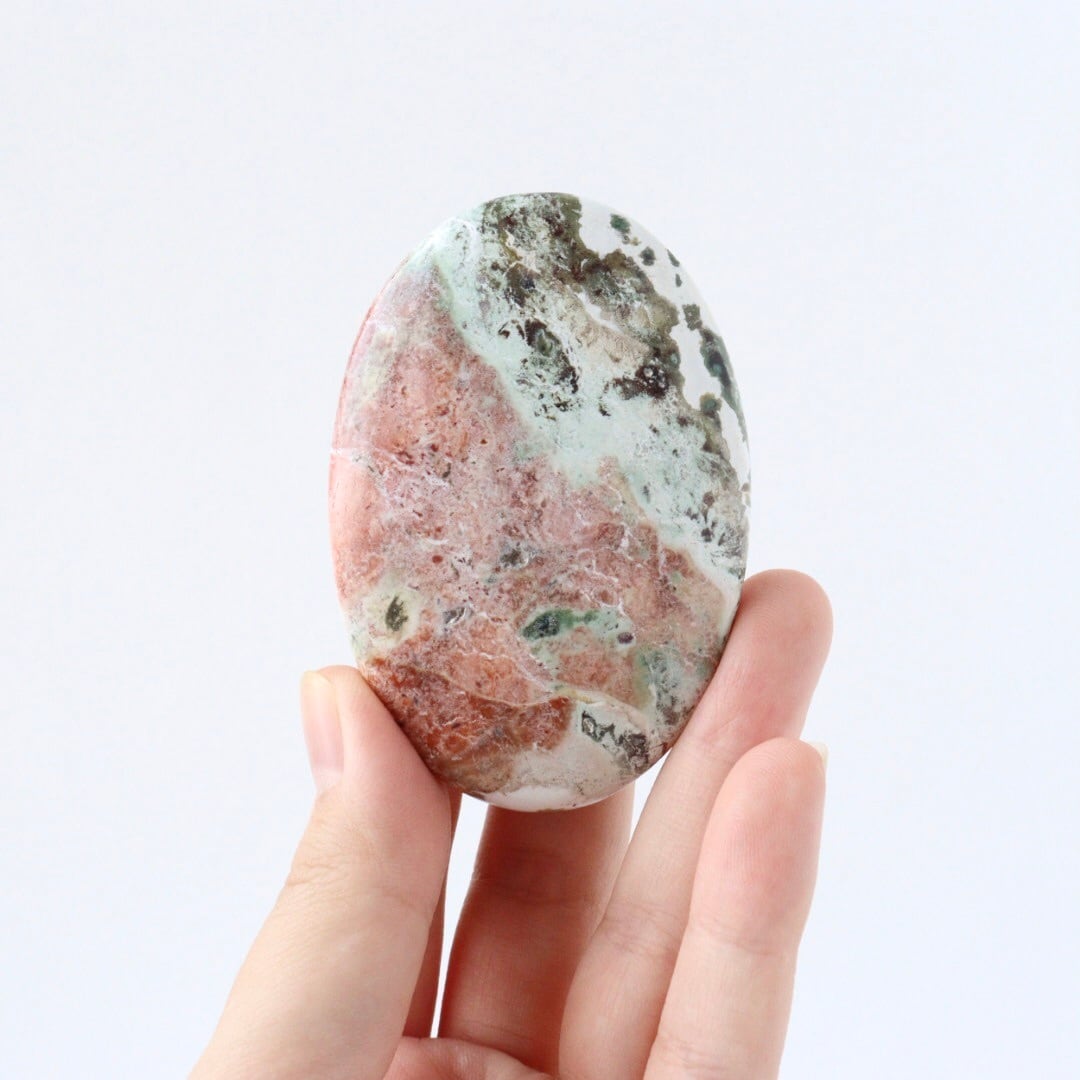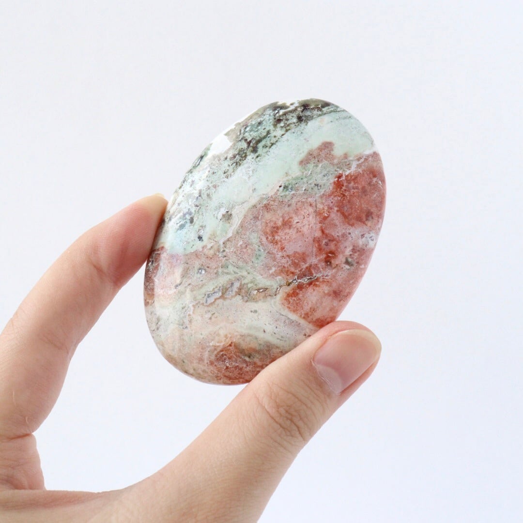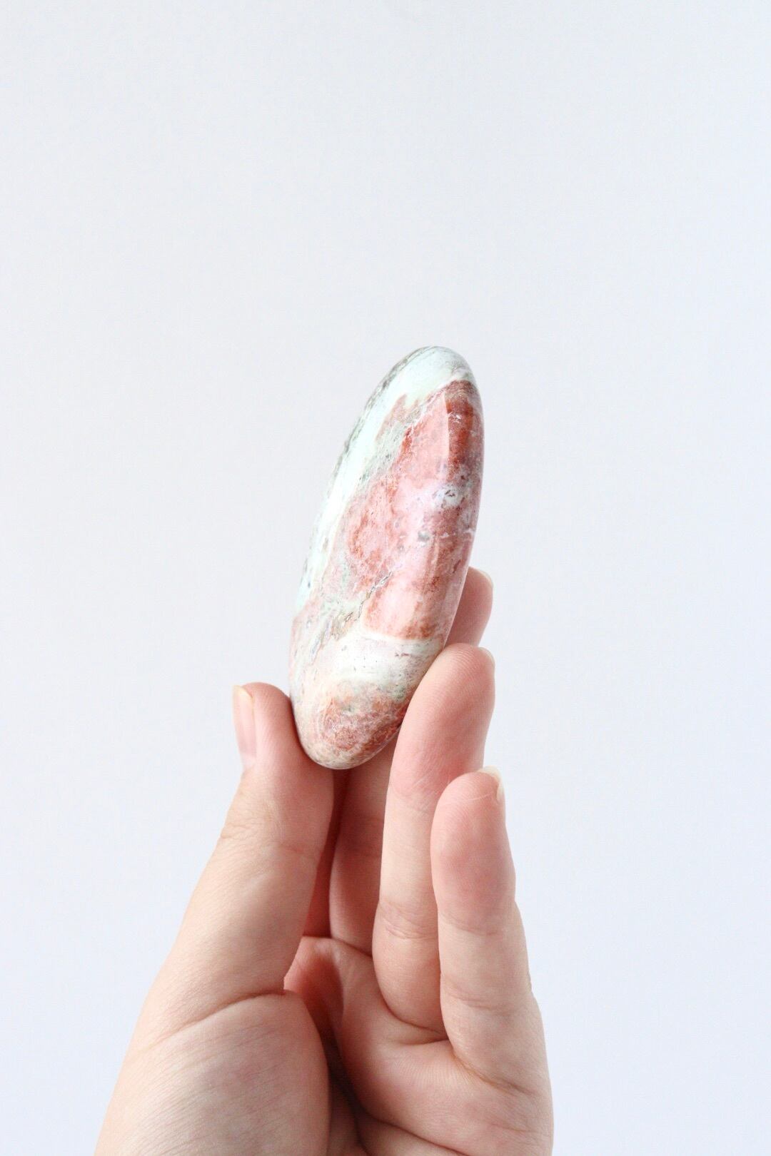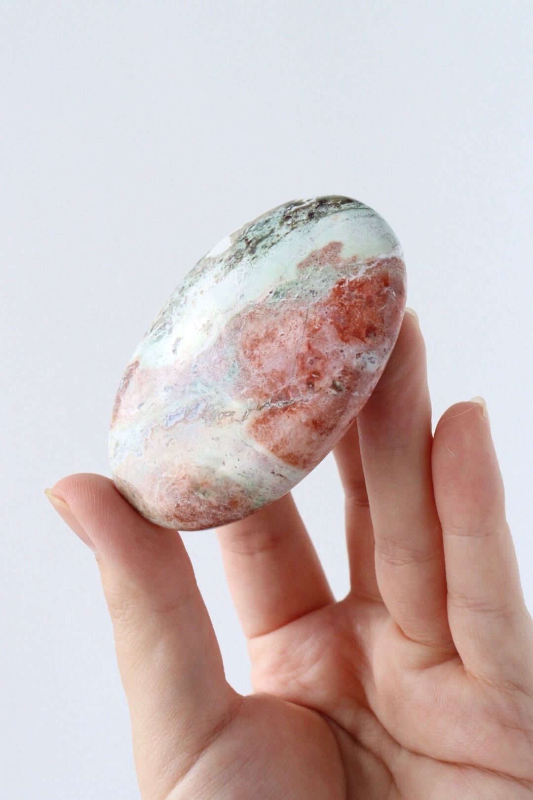 こちらは、花が咲くようなレッドピンクに、淡いグリーンとホワイトが重なり合うユニコーンジャスパーの握り石。