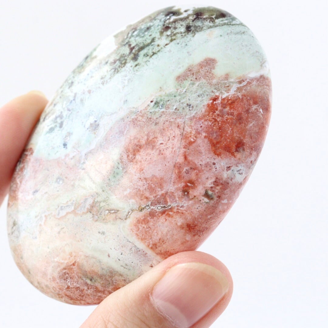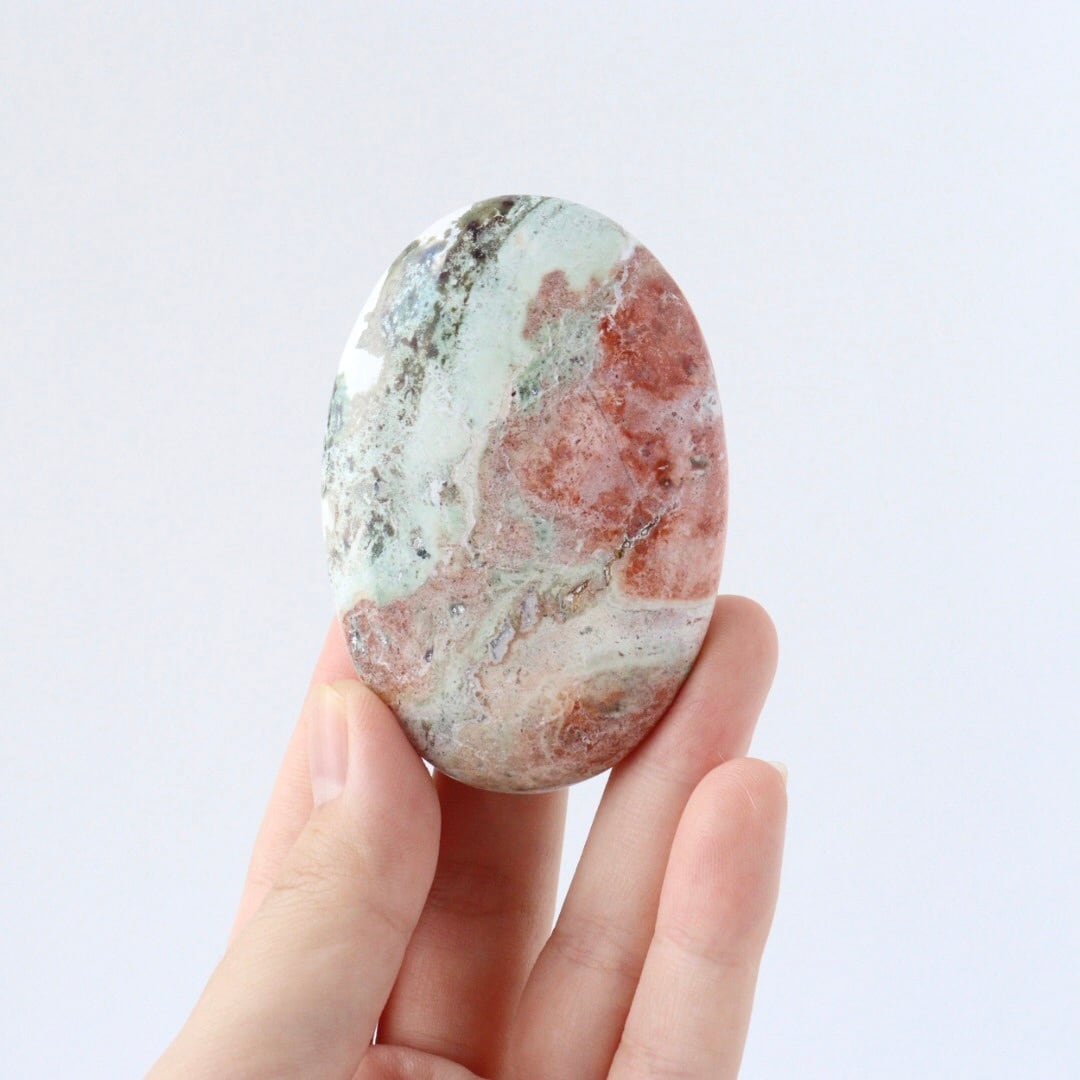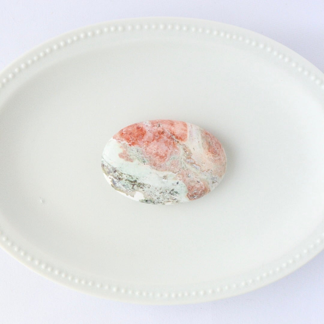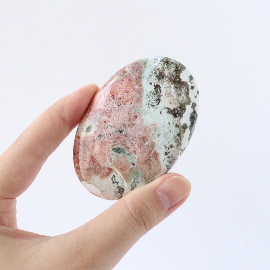 こちらは、花が咲くようなレッドピンクに、淡いグリーンとホワイトが重なり合うユニコーンジャスパーの握り石。