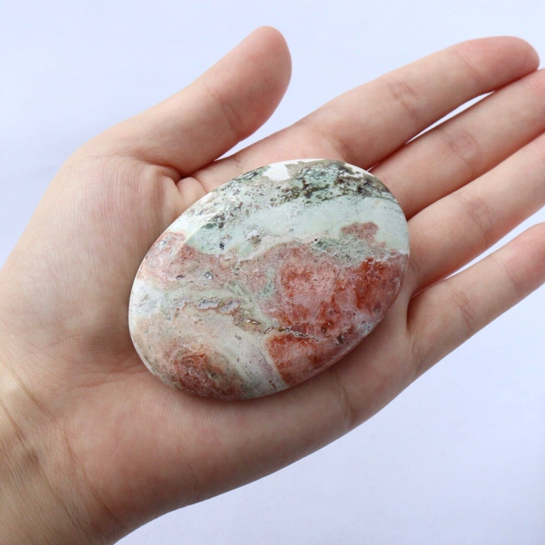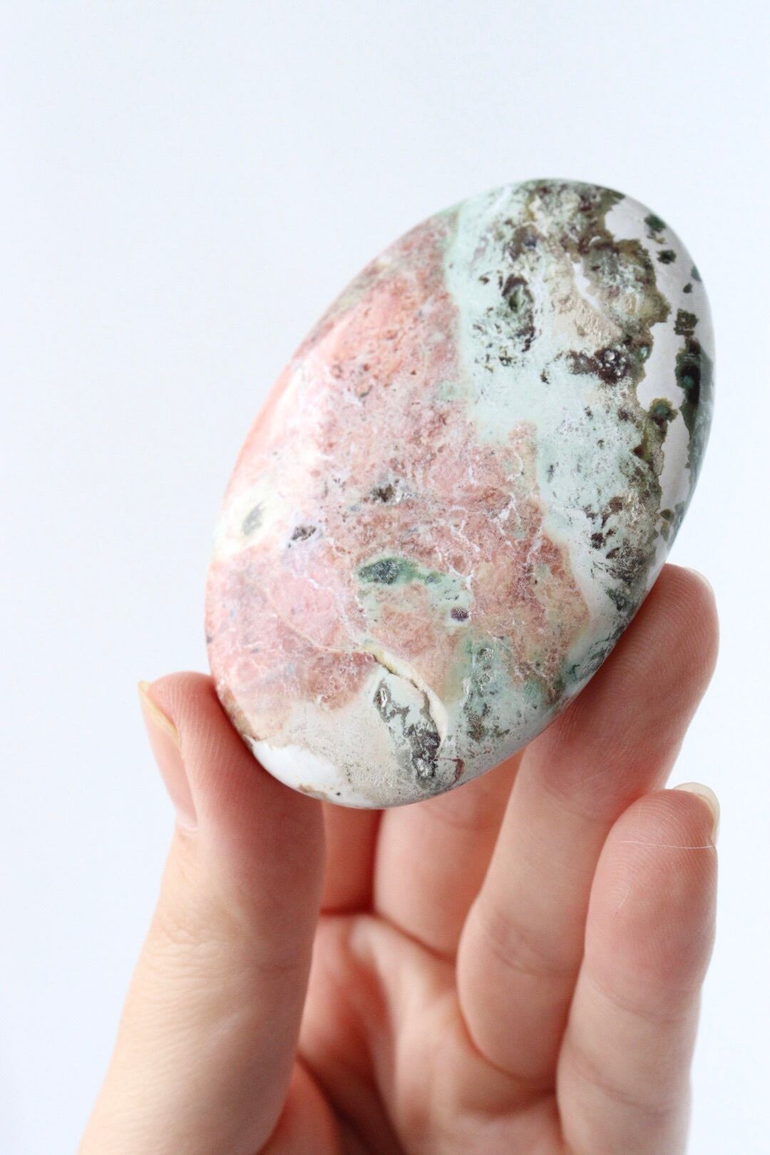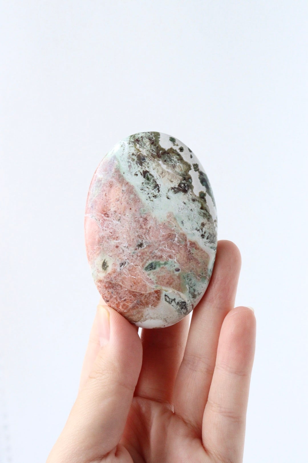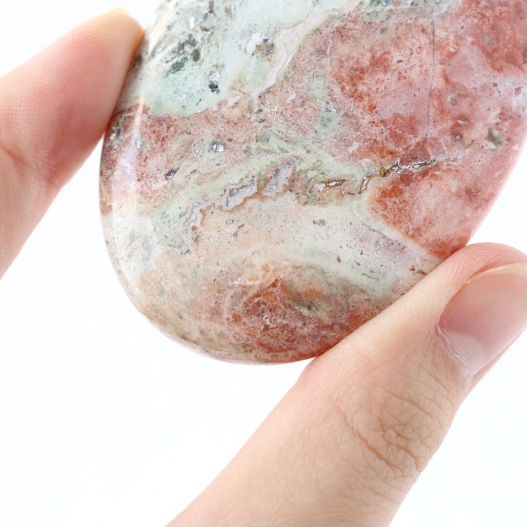 こちらは、花が咲くようなレッドピンクに、淡いグリーンとホワイトが重なり合うユニコーンジャスパーの握り石。