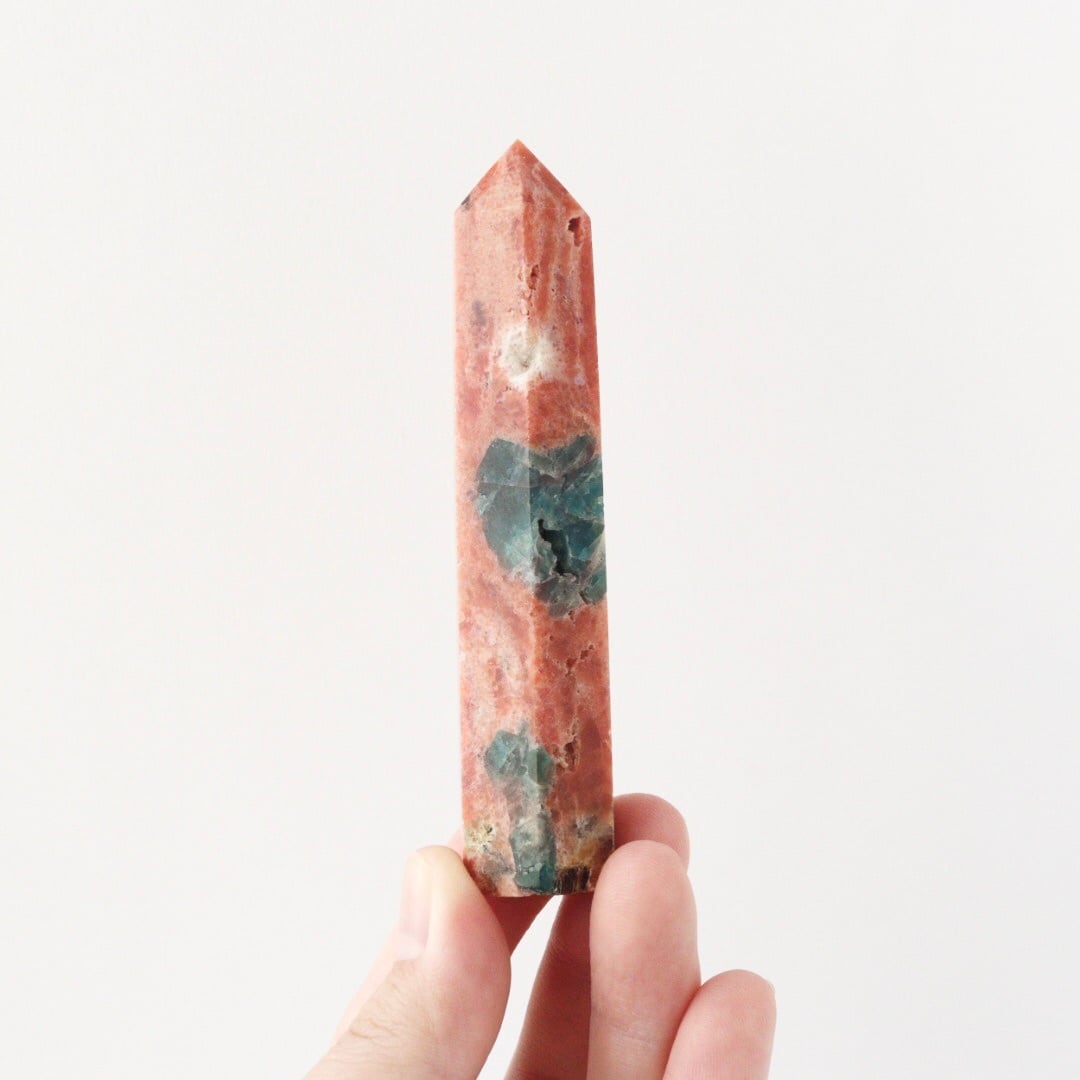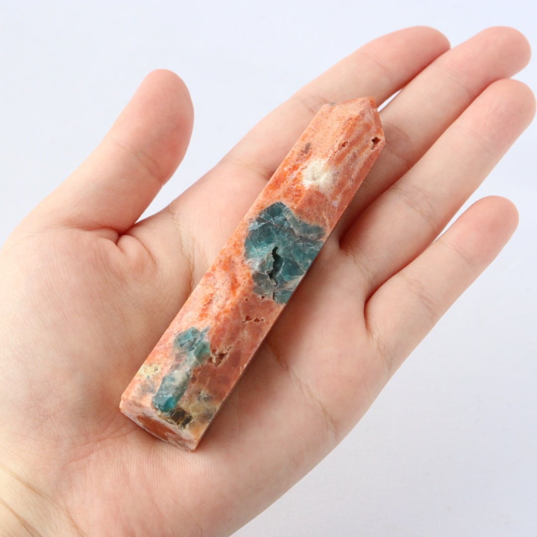 こちらは、ブルーアパタイトとサンストーンが共生した珍しいタワー。