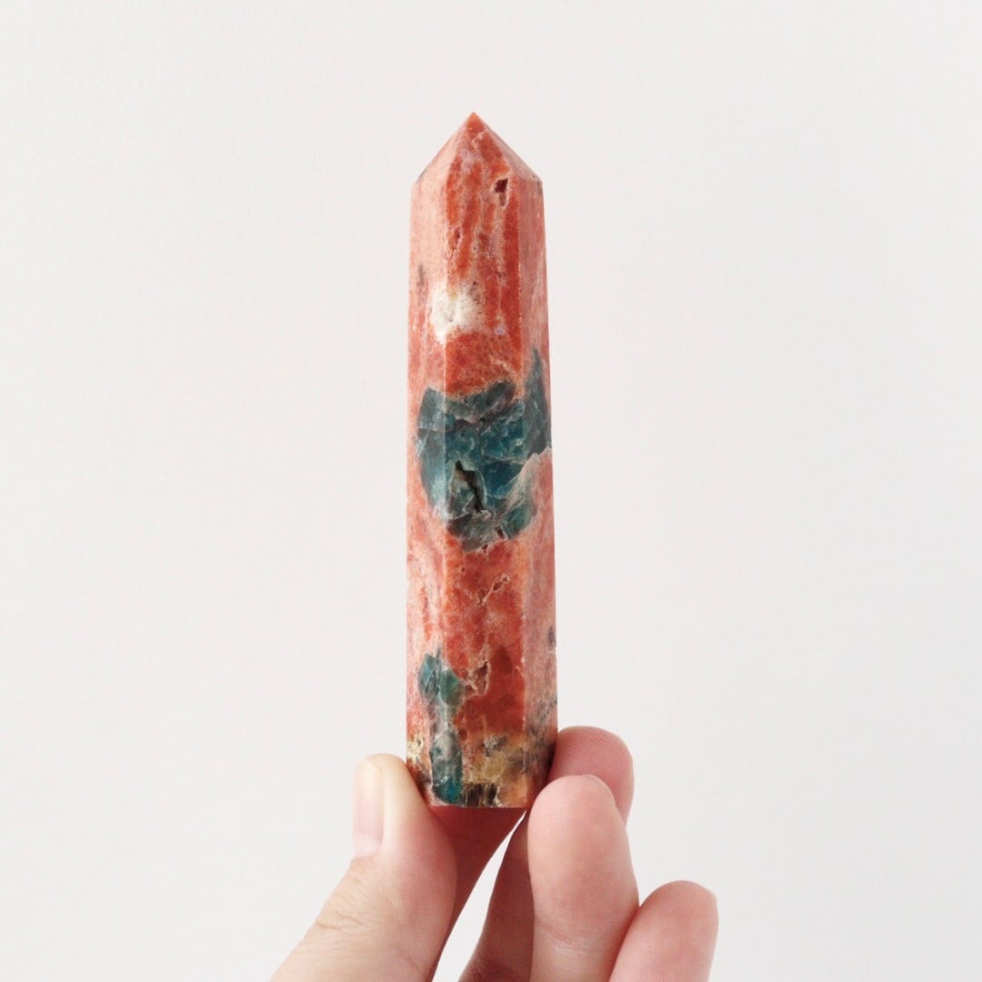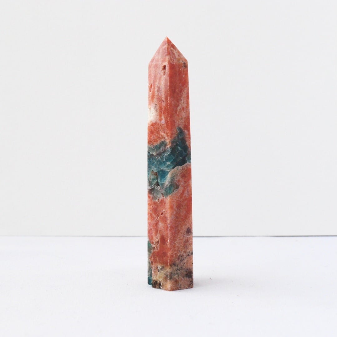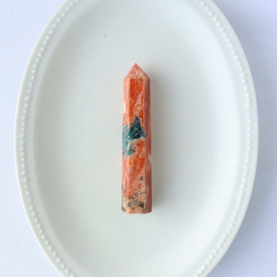 オレンジとブルーのコントラストが見事なサンストーンアパタイトのタワー。
