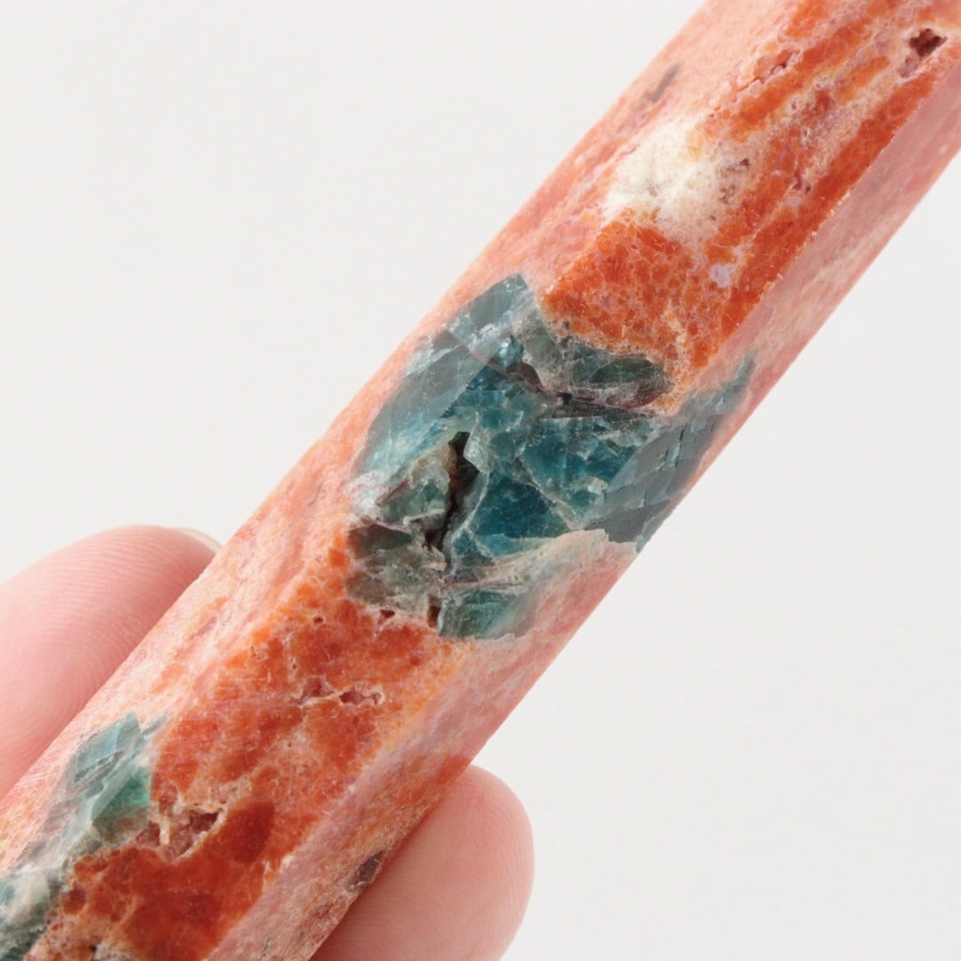 深みのあるオレンジのサンストーンとブルーカラーのアパタイトが共生した、大変珍しいピースです。