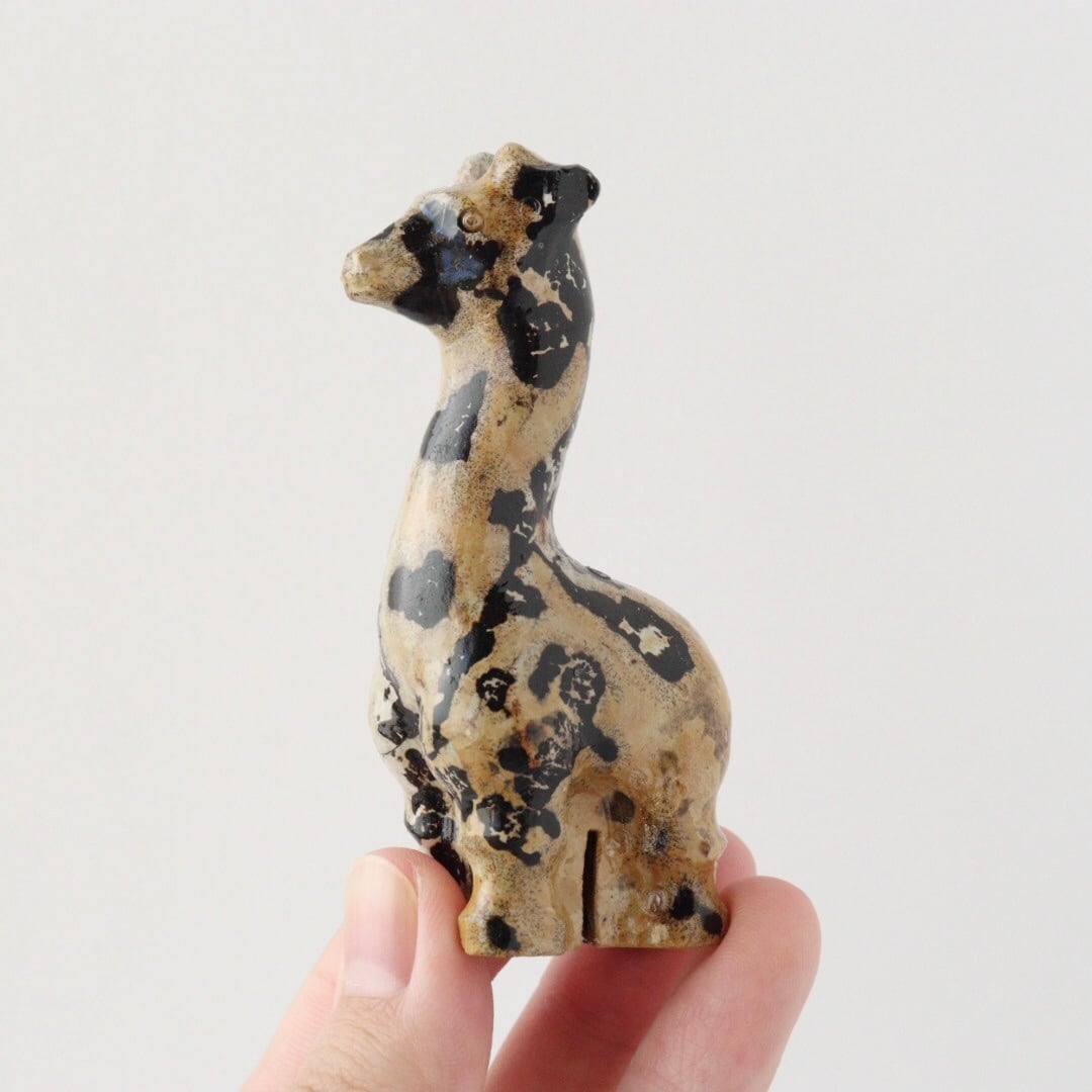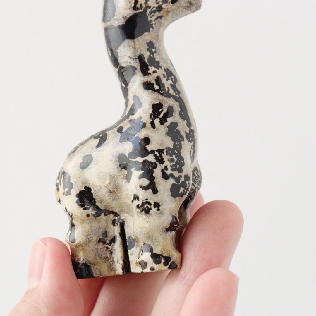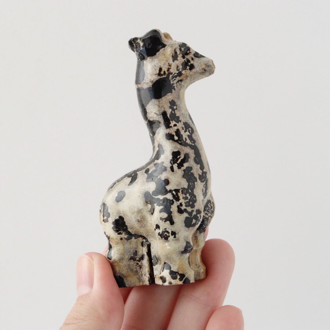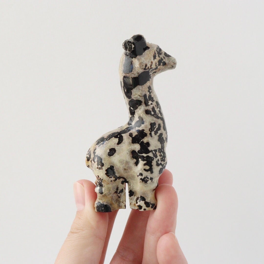 ナチュラルブラウンの素地に、自然で美しいブラックの斑点模様が広がるピクチャージャスパーのキリン。