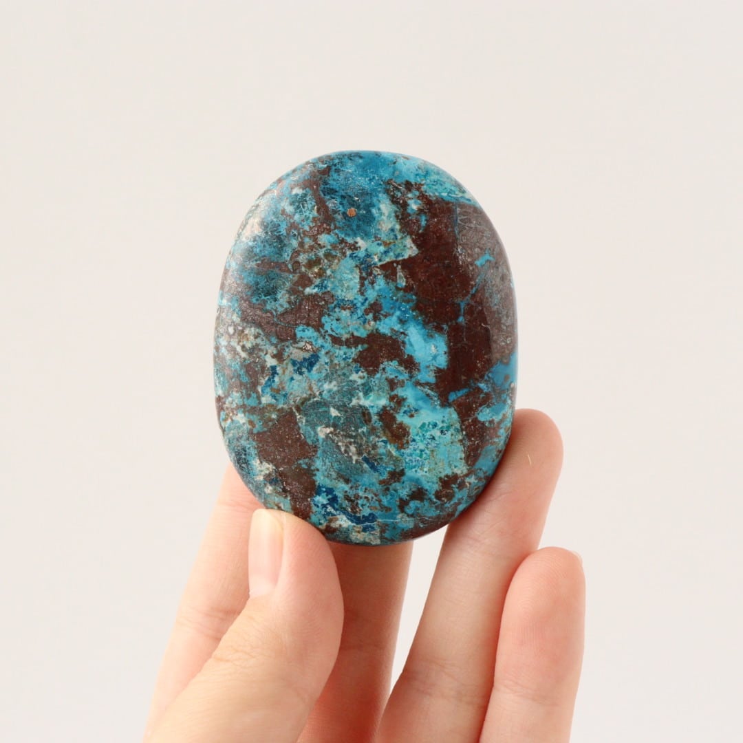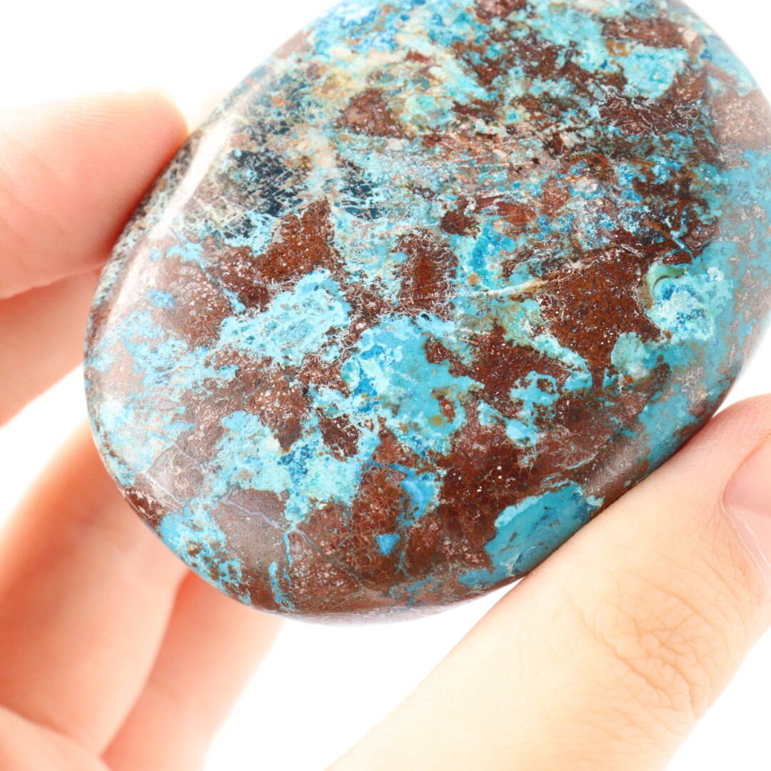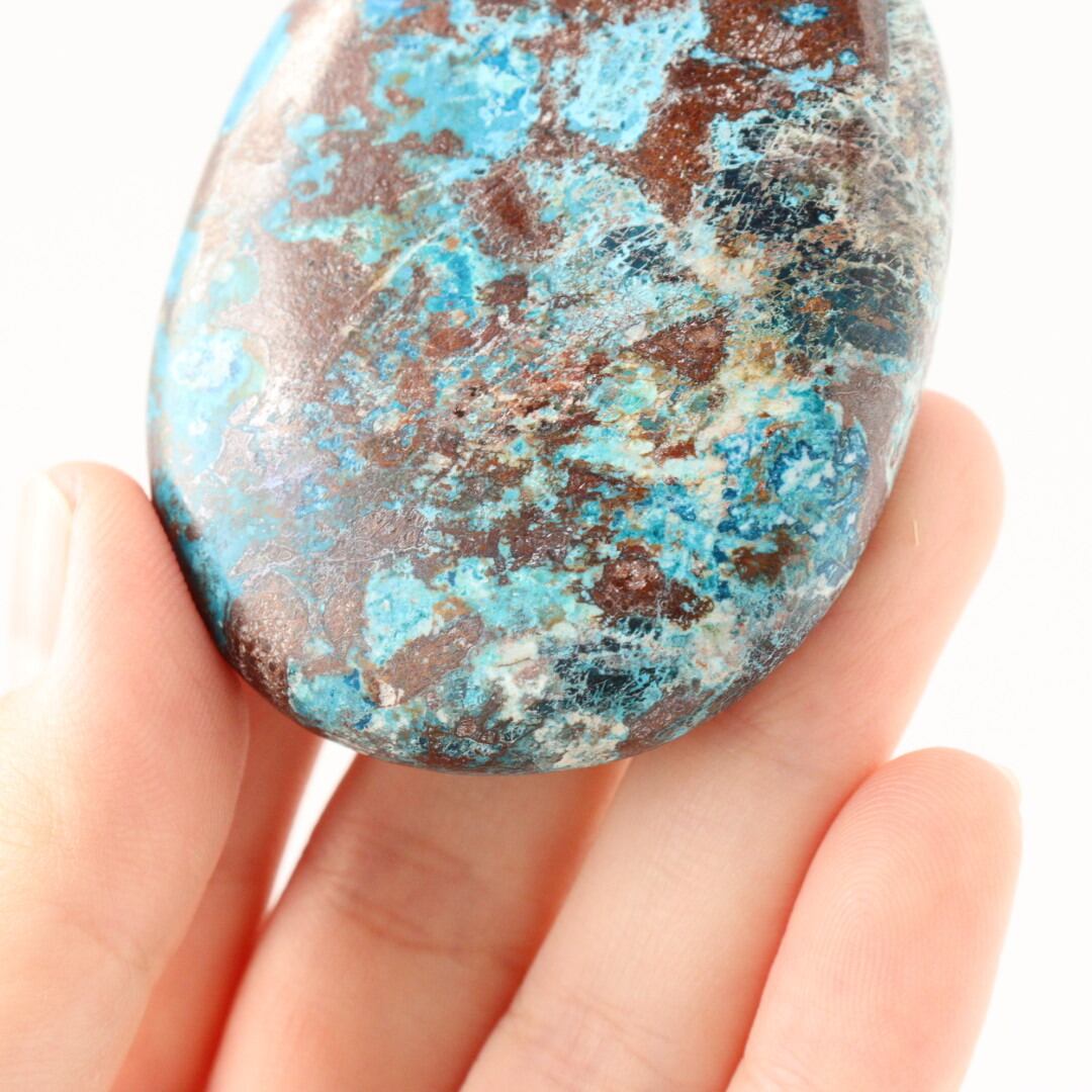 同じく銅を含むクリソコラやアズライト、マラカイトと共生することが多く、銅の含有量や酸化状態によって、青や緑、そして褐色を帯びた独特の模様を見せます。