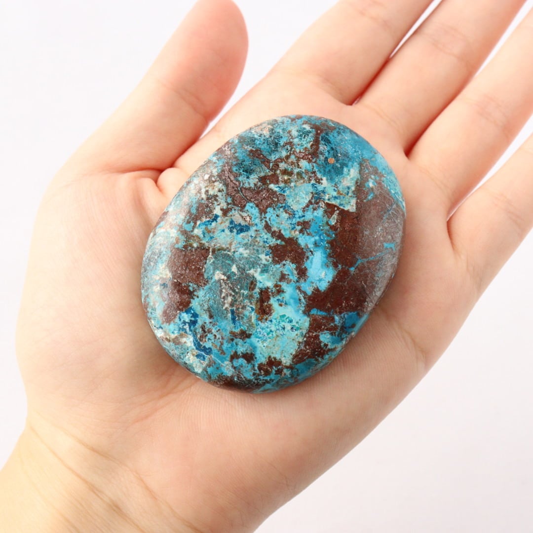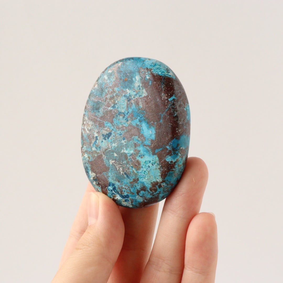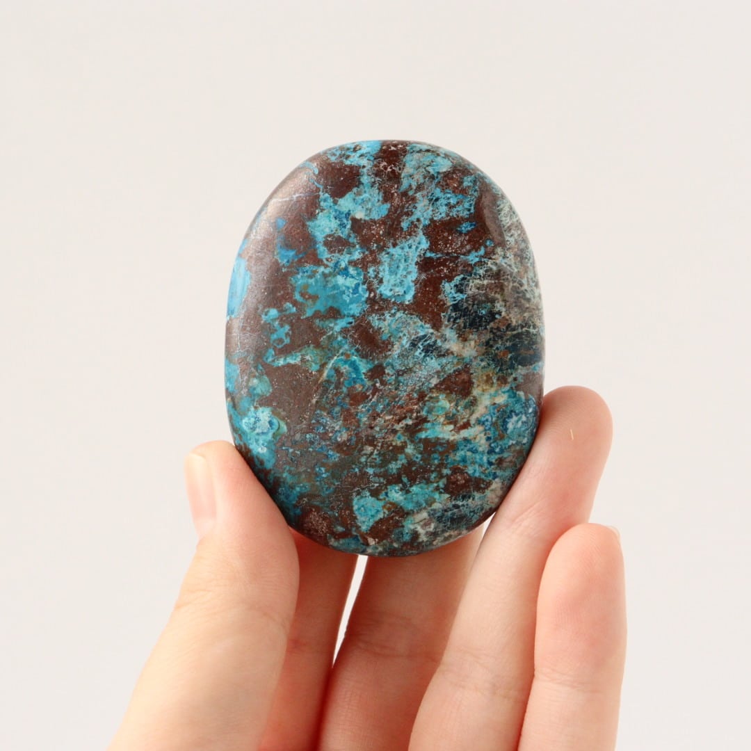 同じく銅を含むクリソコラやアズライト、マラカイトと共生することが多く、銅の含有量や酸化状態によって、青や緑、そして褐色を帯びた独特の模様を見せます。