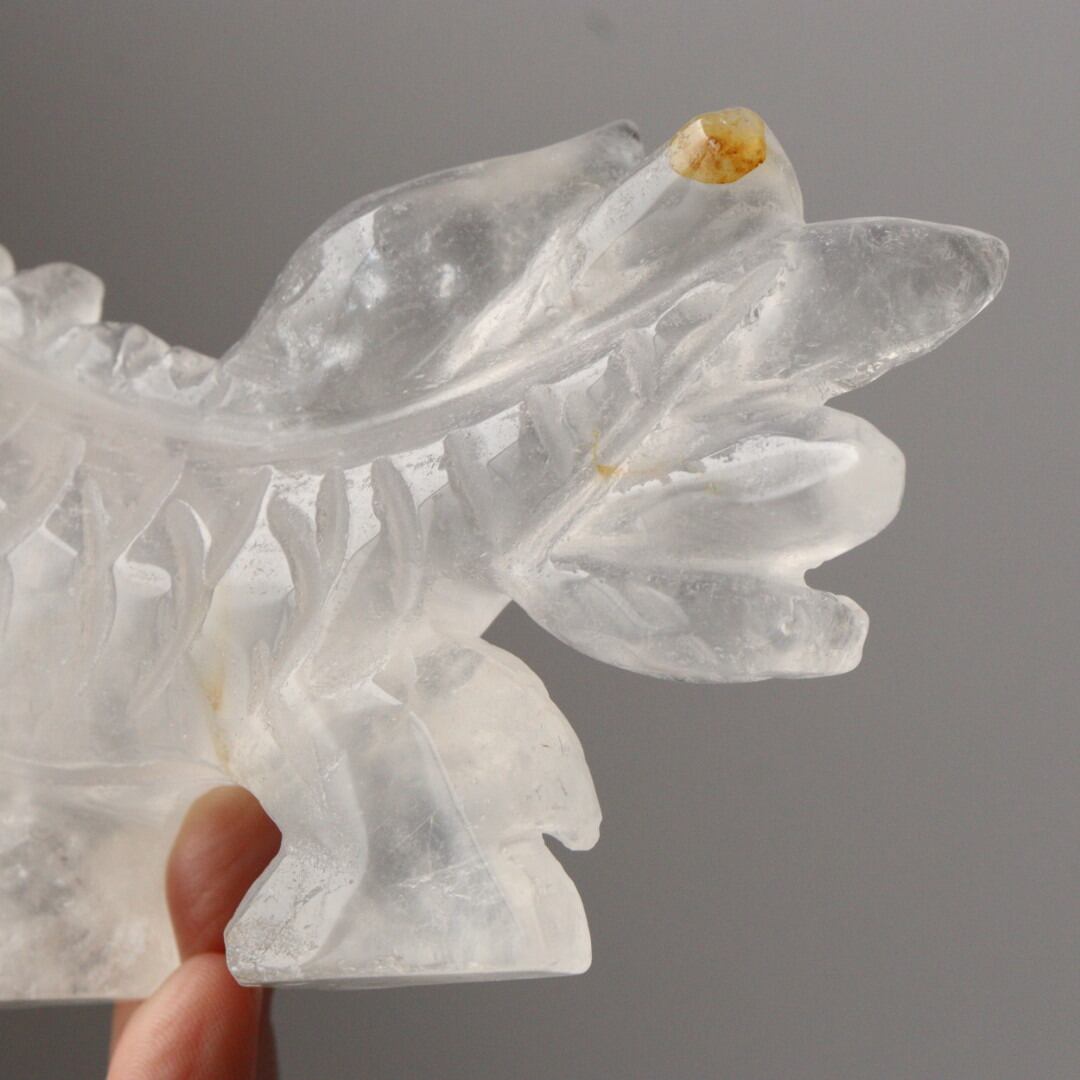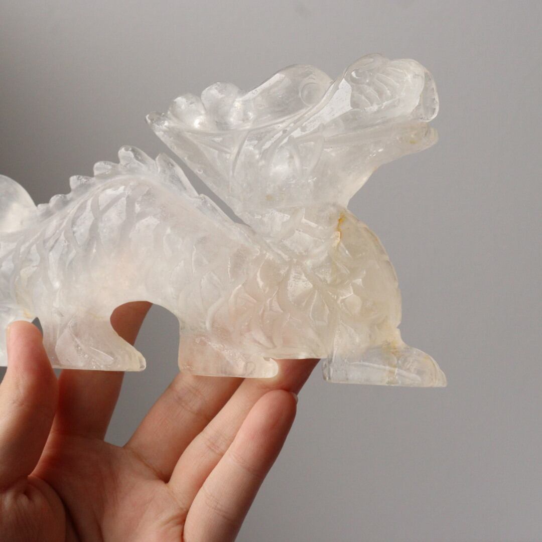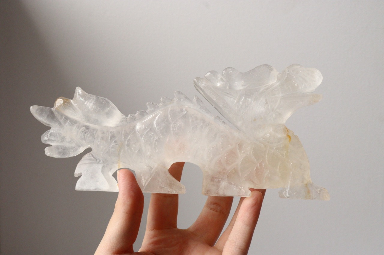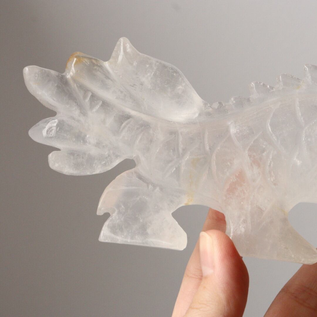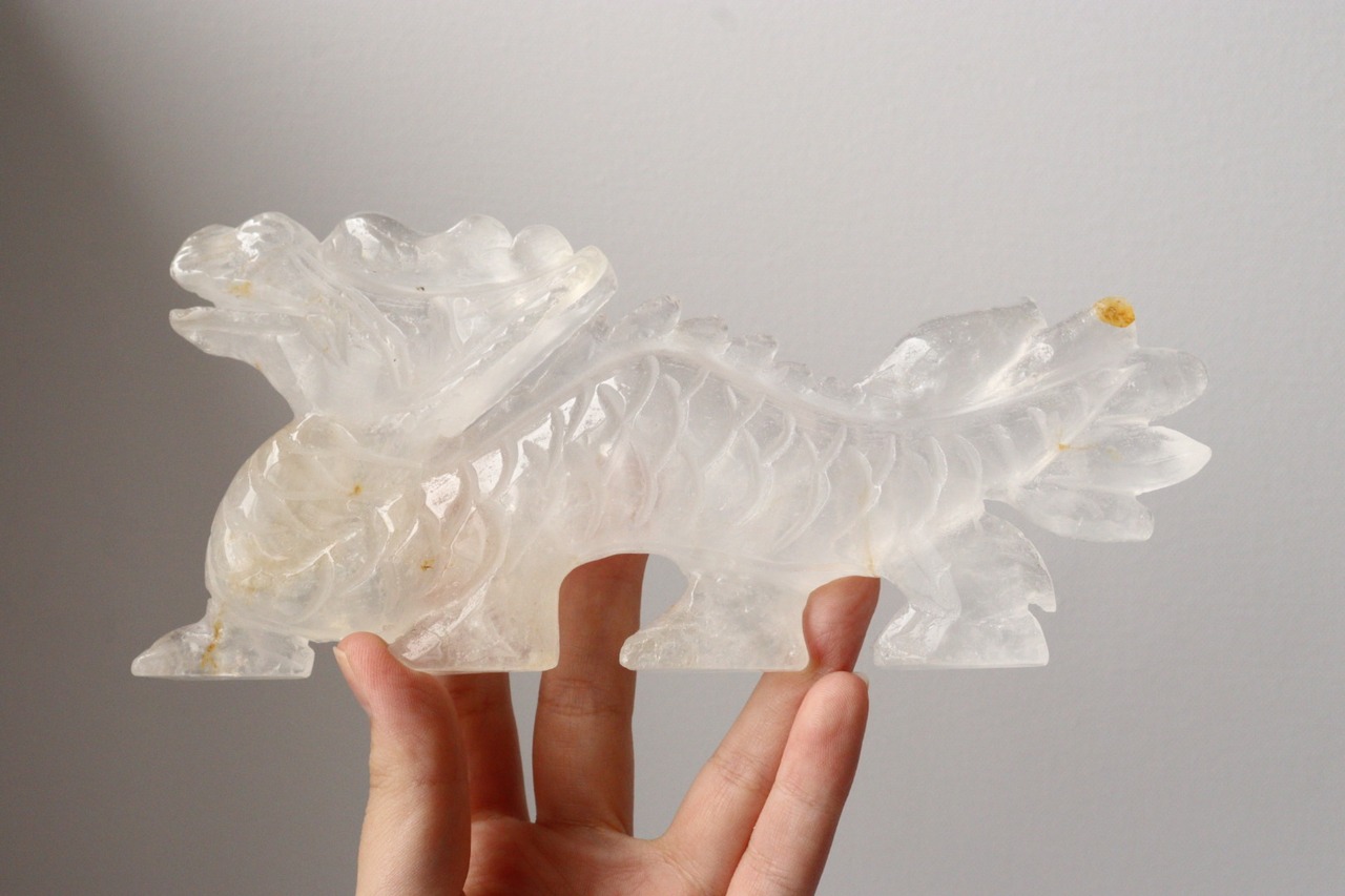 この大きなクリアクォーツの龍は、迫力ある造形と自然の美しさが融合した特別に大きなピース。