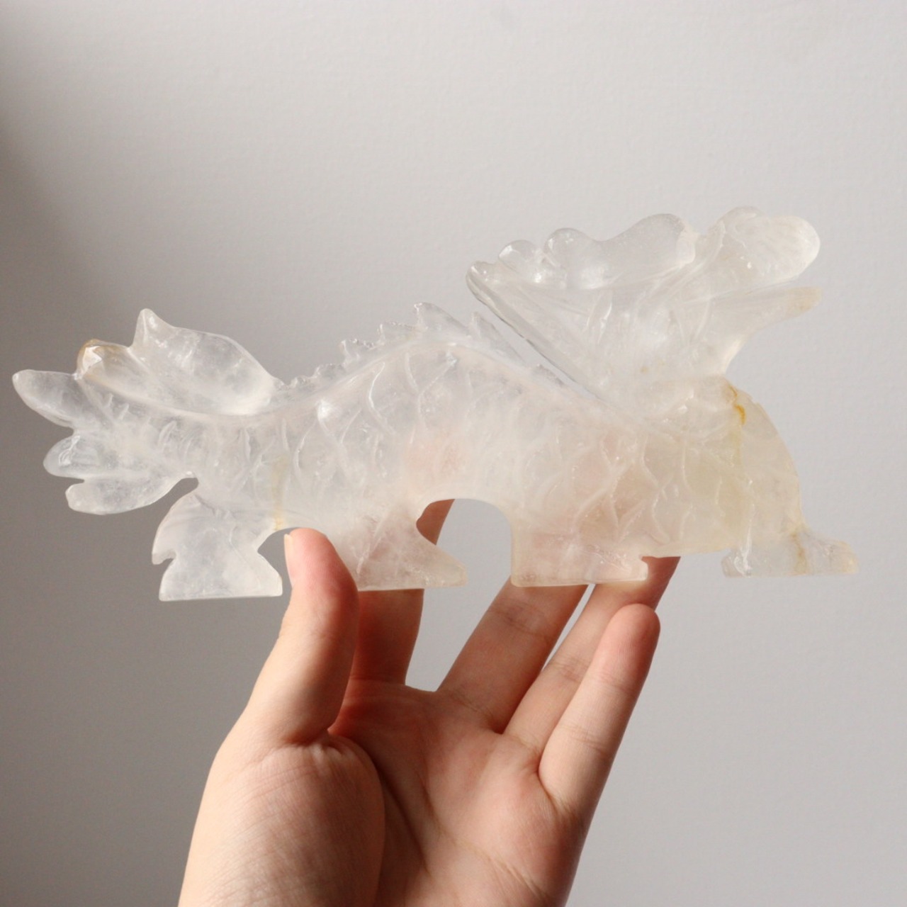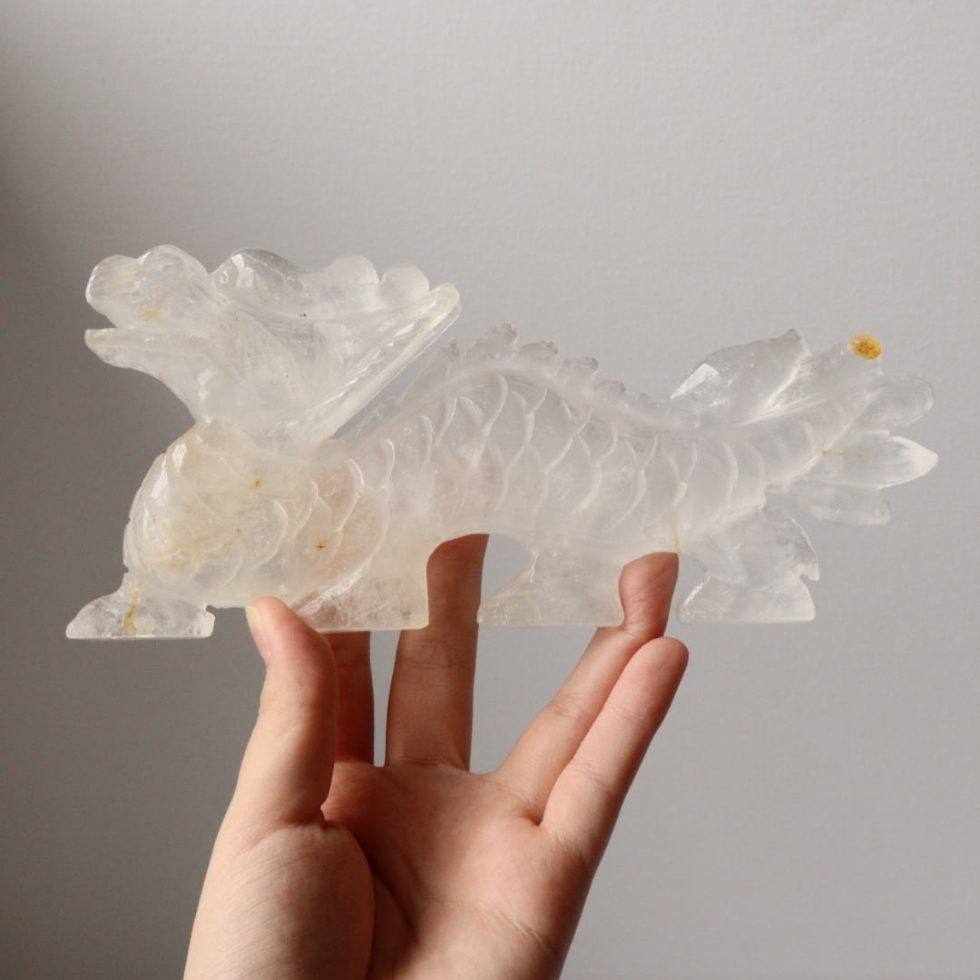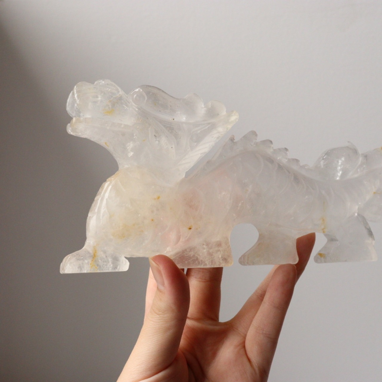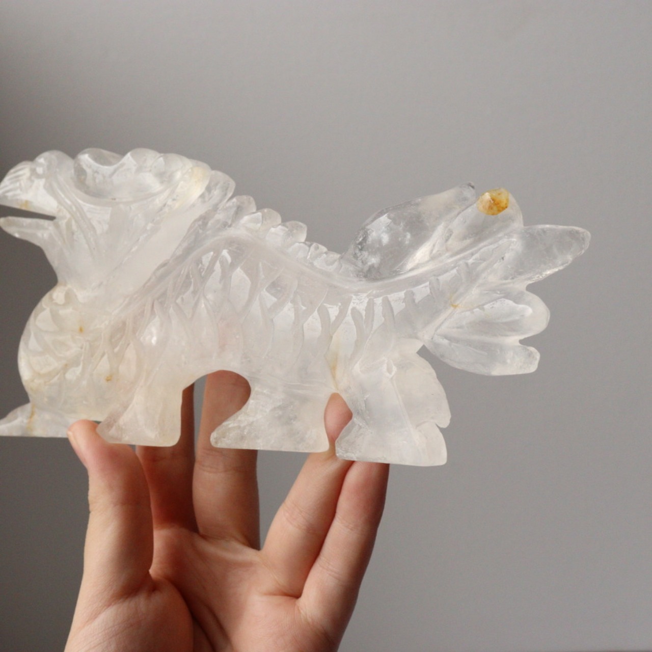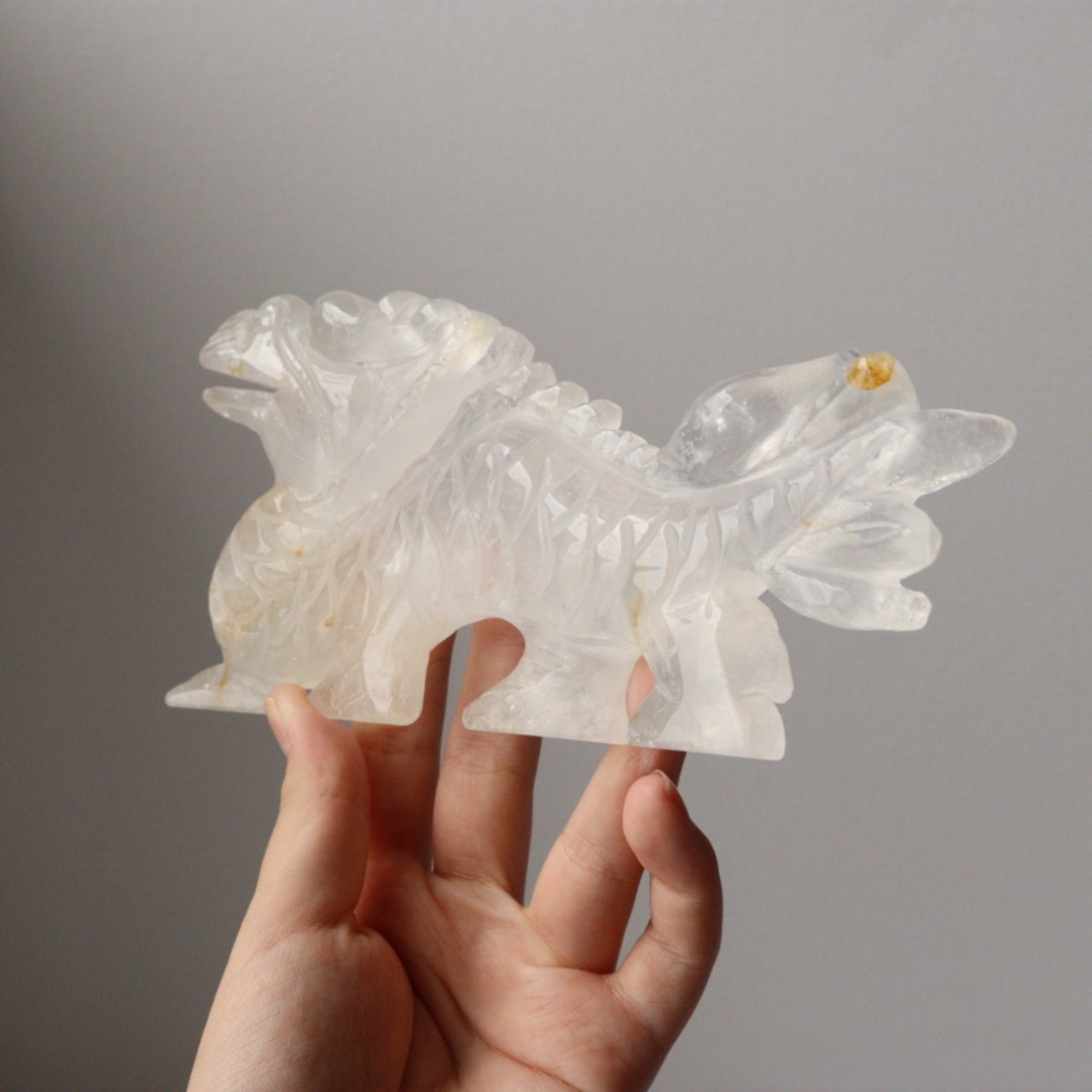 この大きなクリアクォーツの龍は、迫力ある造形と自然の美しさが融合した特別に大きなピース。