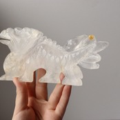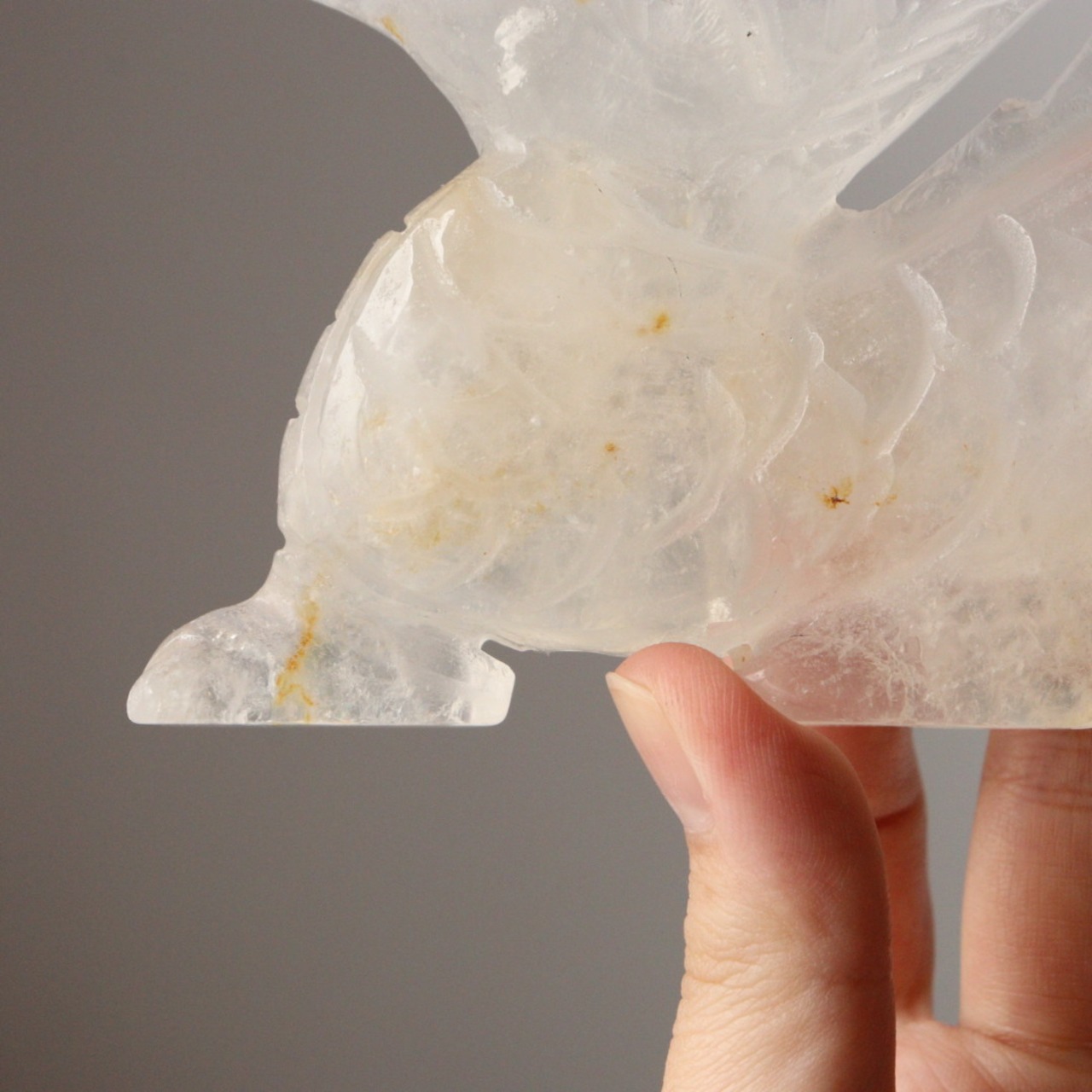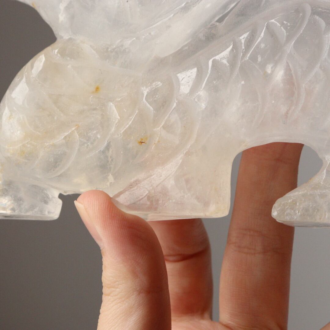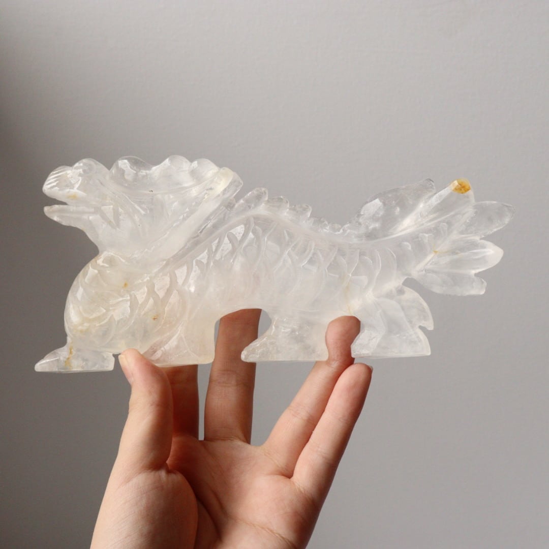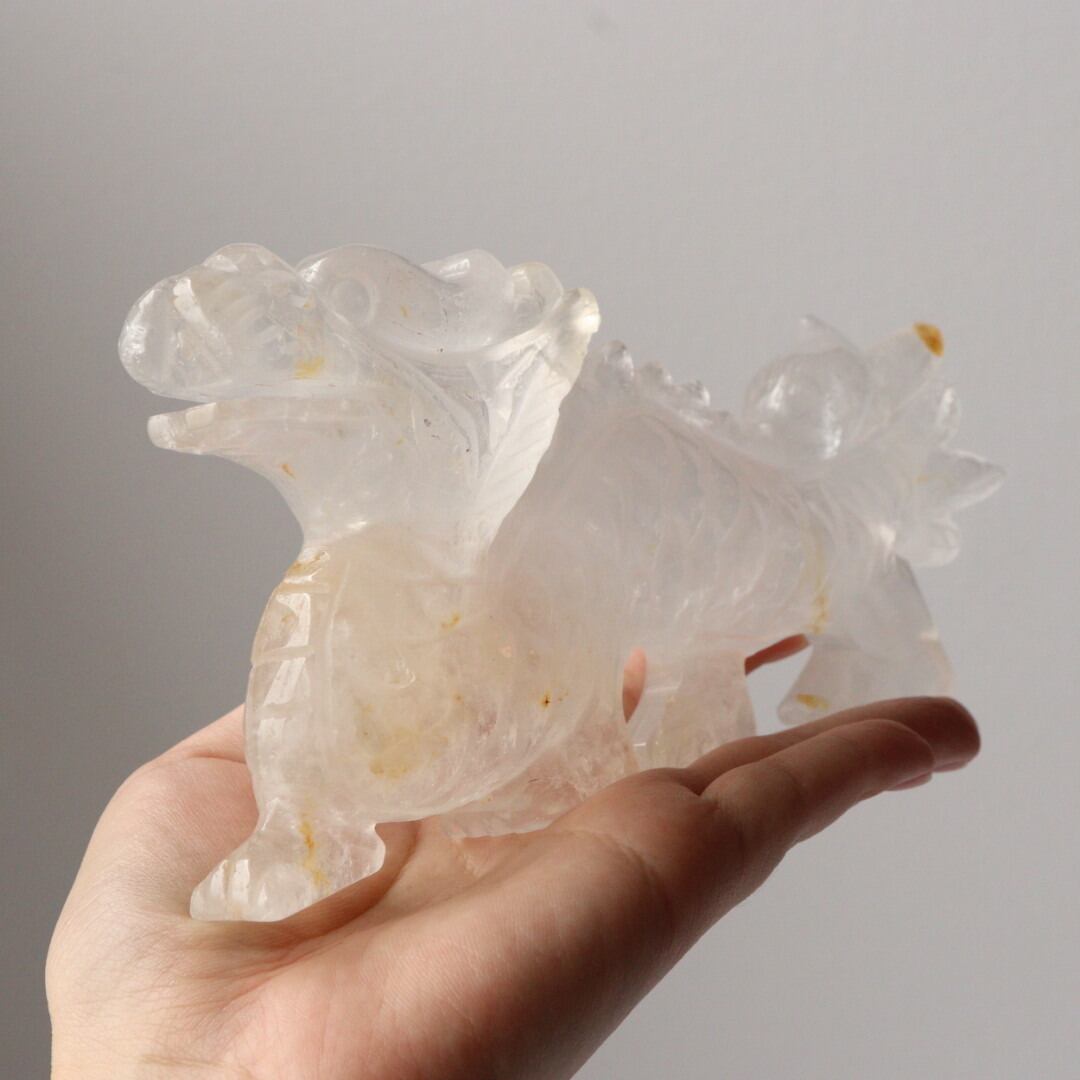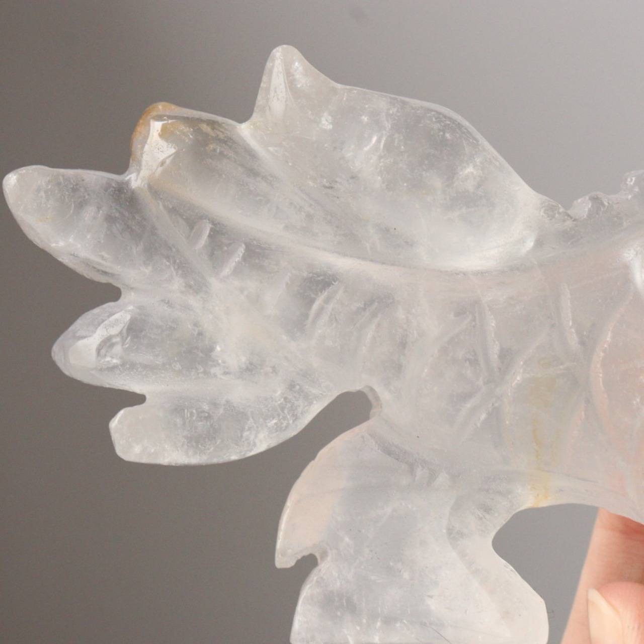 この大きなクリアクォーツの龍は、迫力ある造形と自然の美しさが融合した特別に大きなピース。