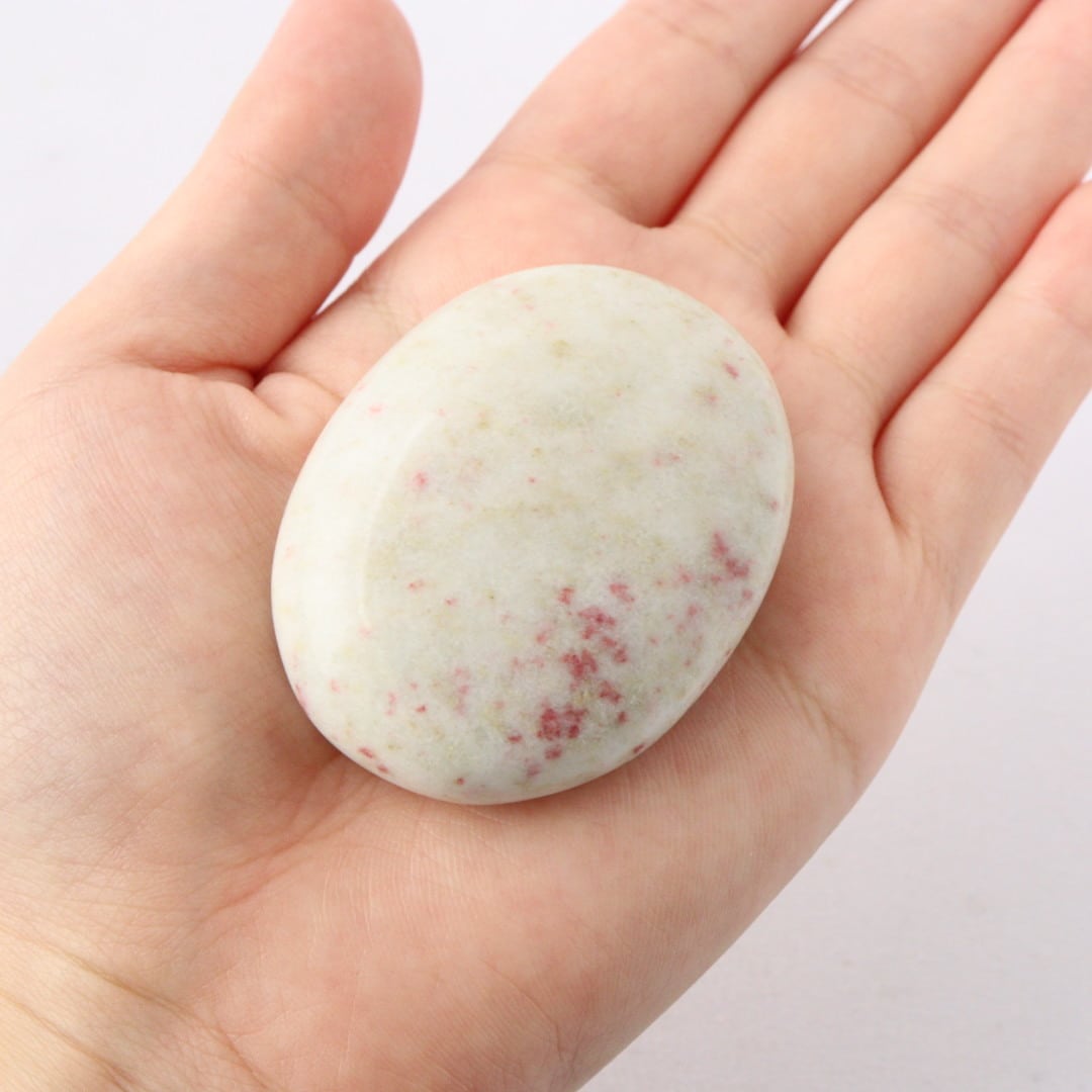 ほの白い中に、淡いレッドピンクがそっと舞い上がるシナバーインクォーツの握り石。