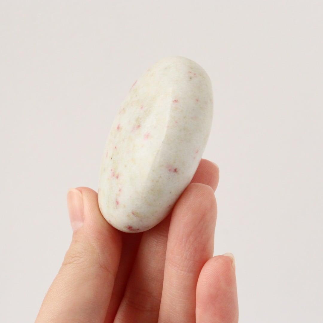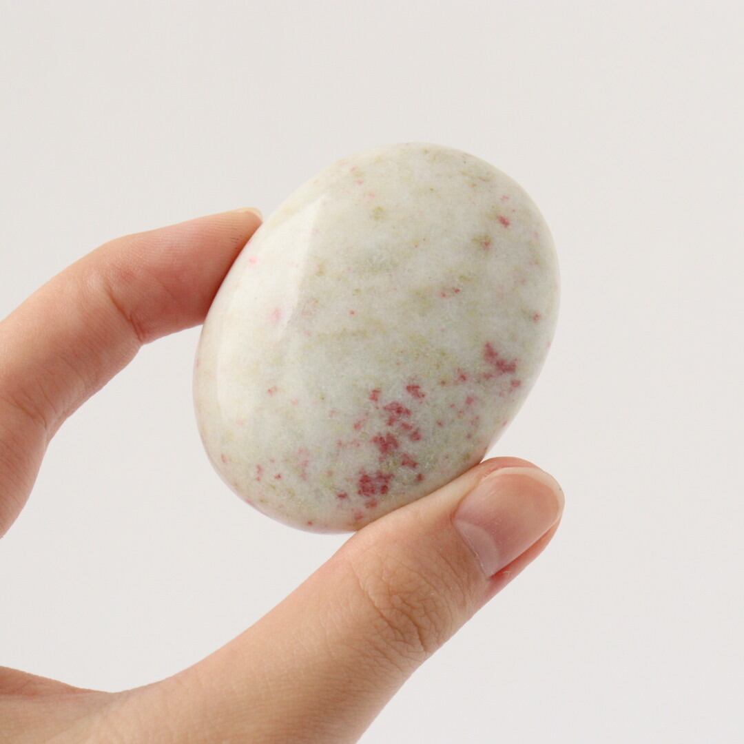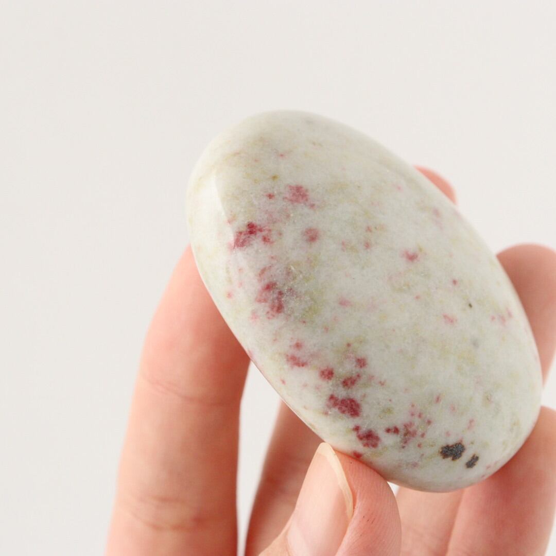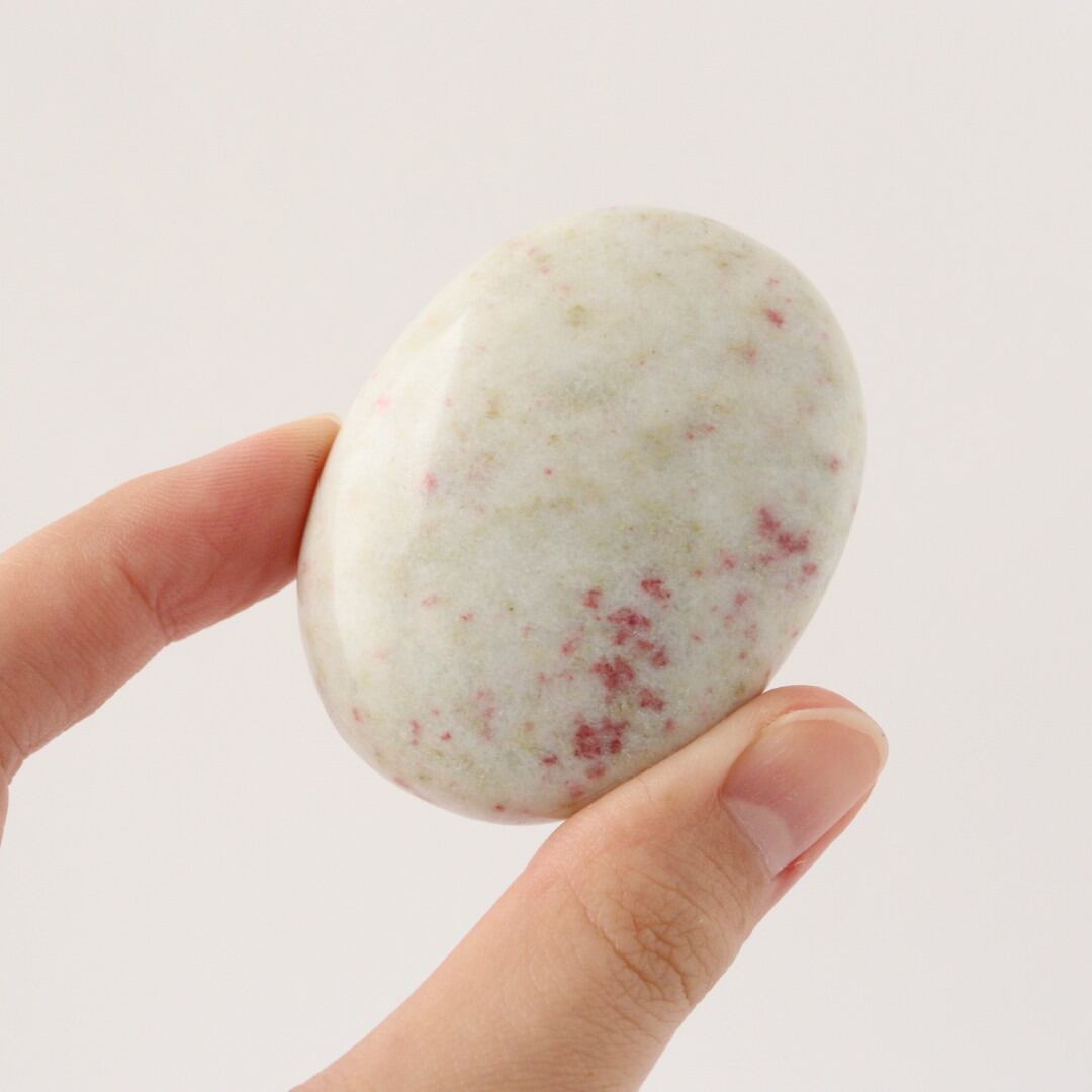 こちらは、柔らかなホワイトクォーツの中に、レッドピンクのシナバーがぽつぽつと現れ、まるで宙を漂う粒子がふんわりと舞い上がるような模様が現れた握り石。
