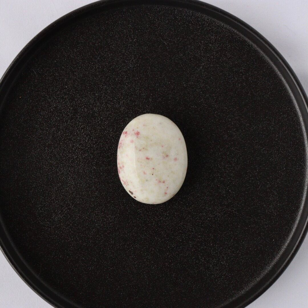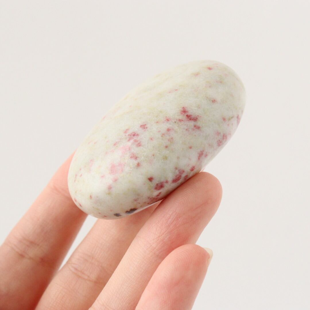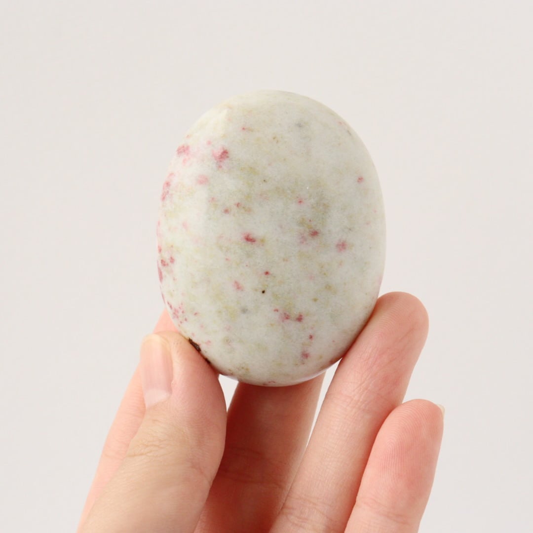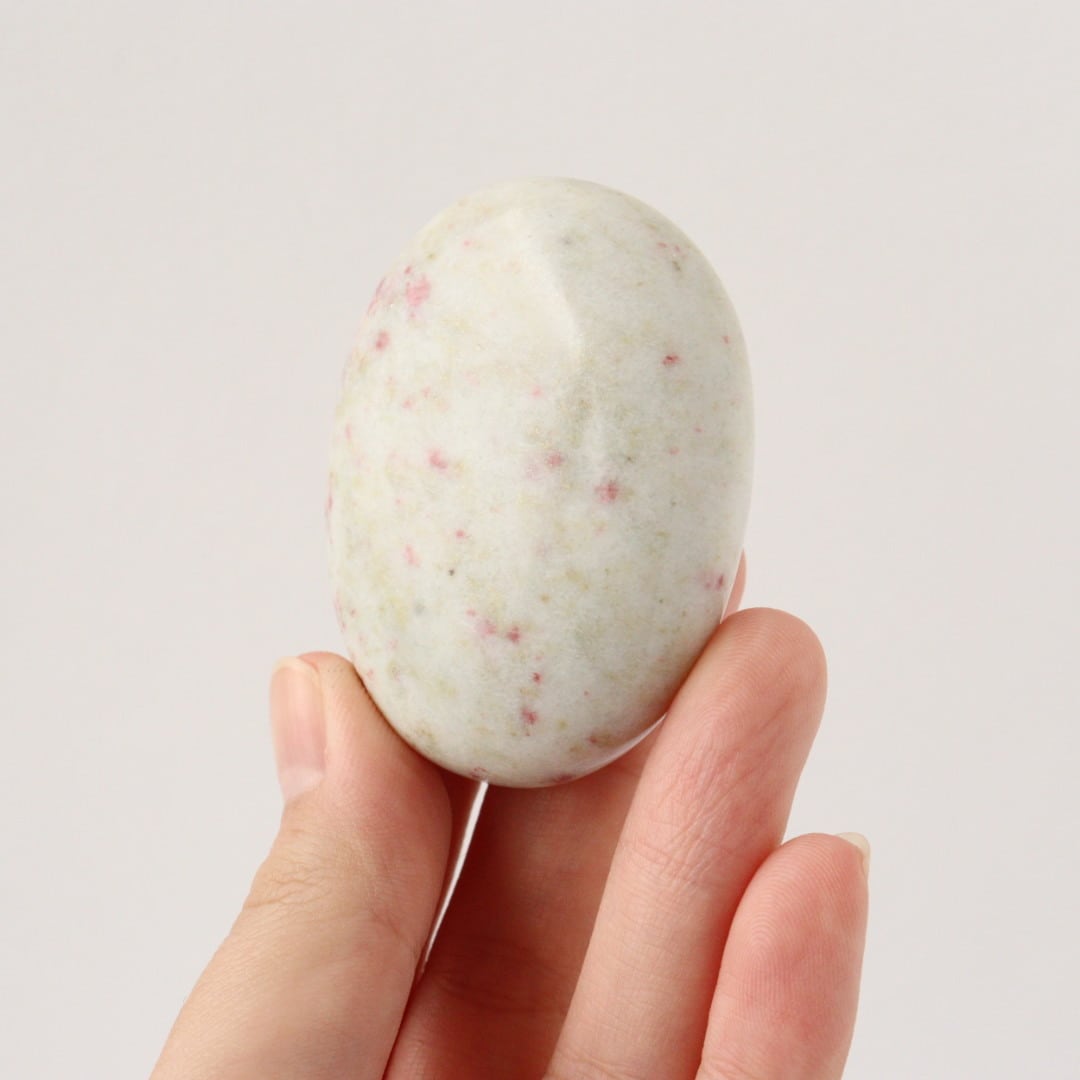 こちらは、柔らかなホワイトクォーツの中に、レッドピンクのシナバーがぽつぽつと現れ、まるで宙を漂う粒子がふんわりと舞い上がるような模様が現れた握り石。