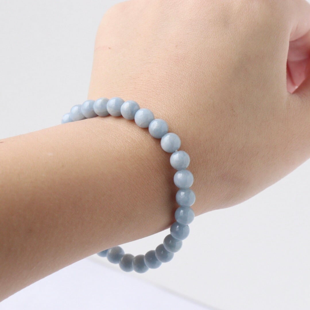 こちらは、明るく柔らかいブルーを湛えたビーズが均一に並ぶ、エンジェライトのブレスレット。穏やかで整った印象を手元に届けてくれるブレスレットです。