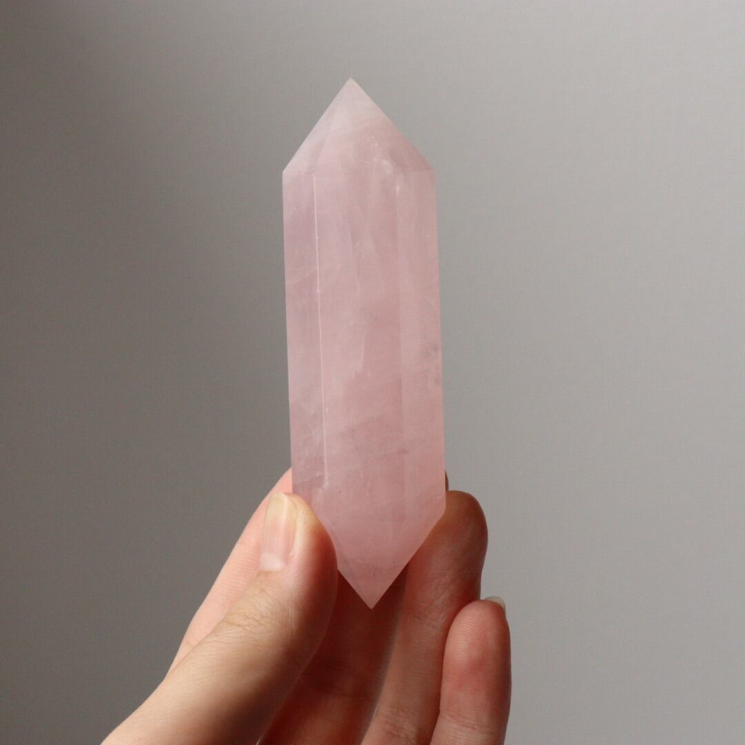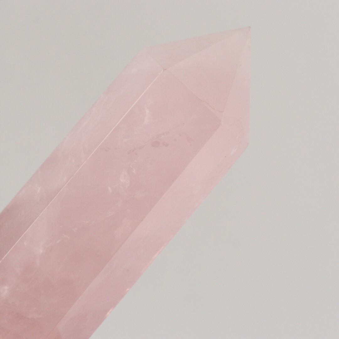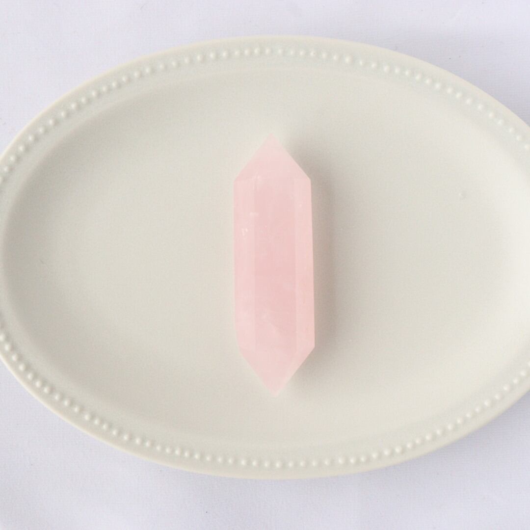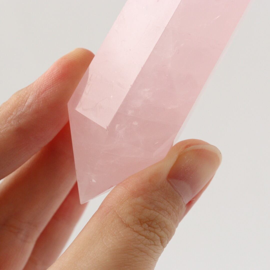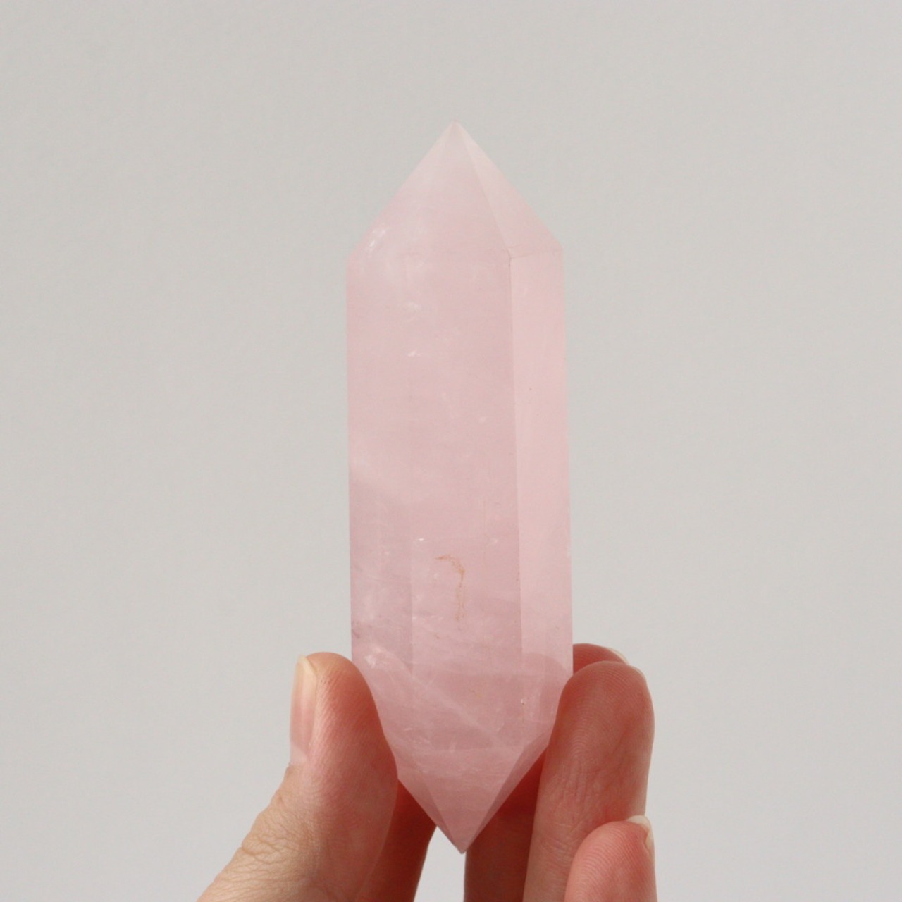 こちらは、両端が尖ったダブルポイントの形に磨かれたローズクォーツ。
