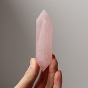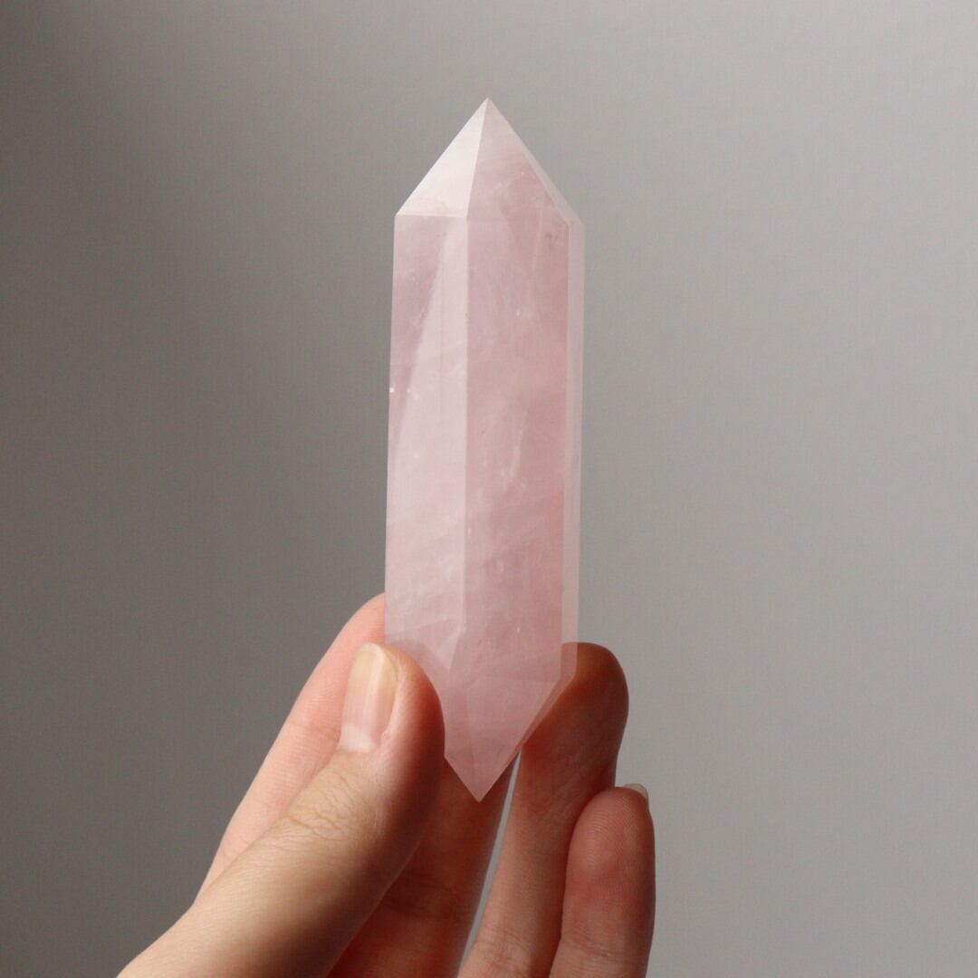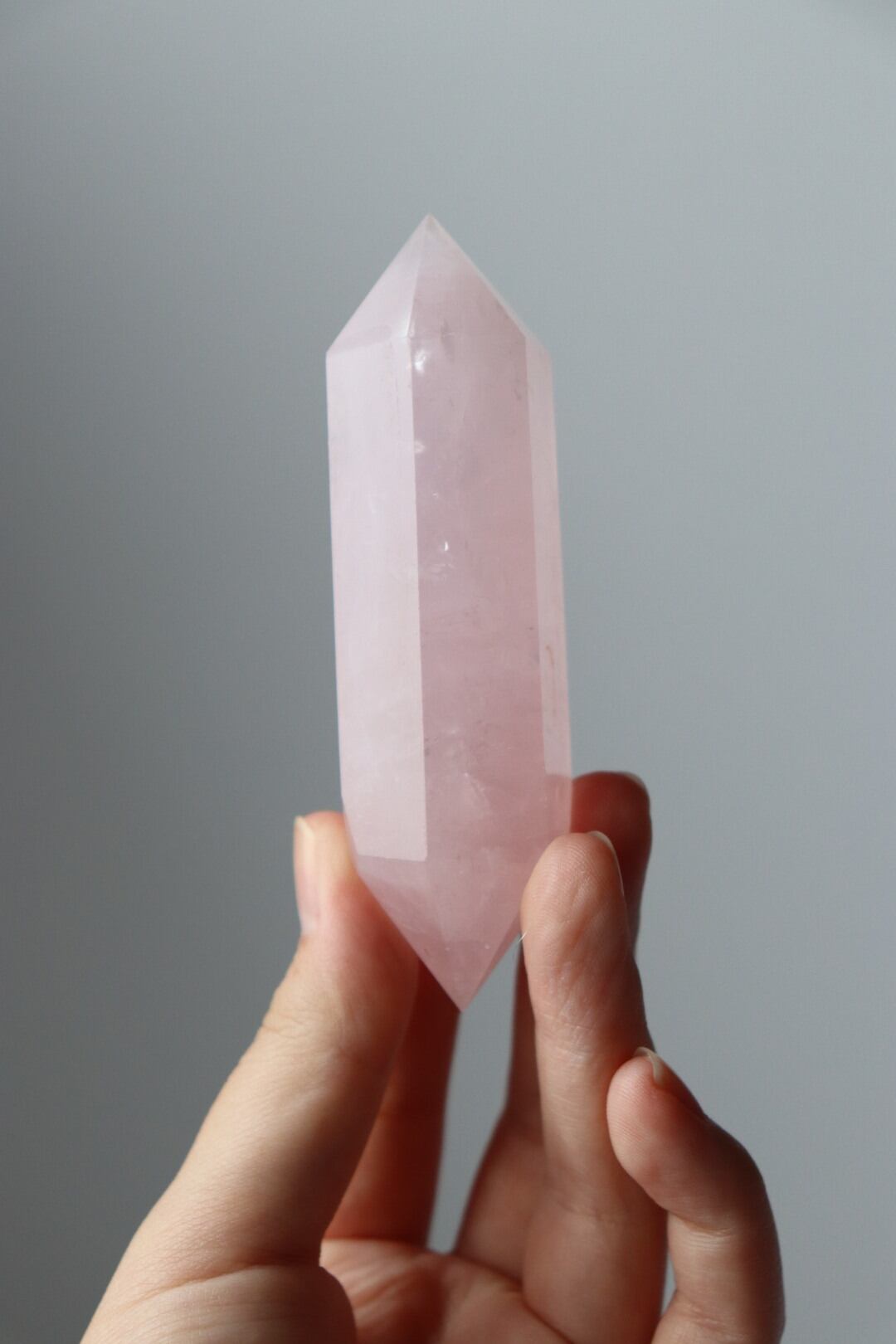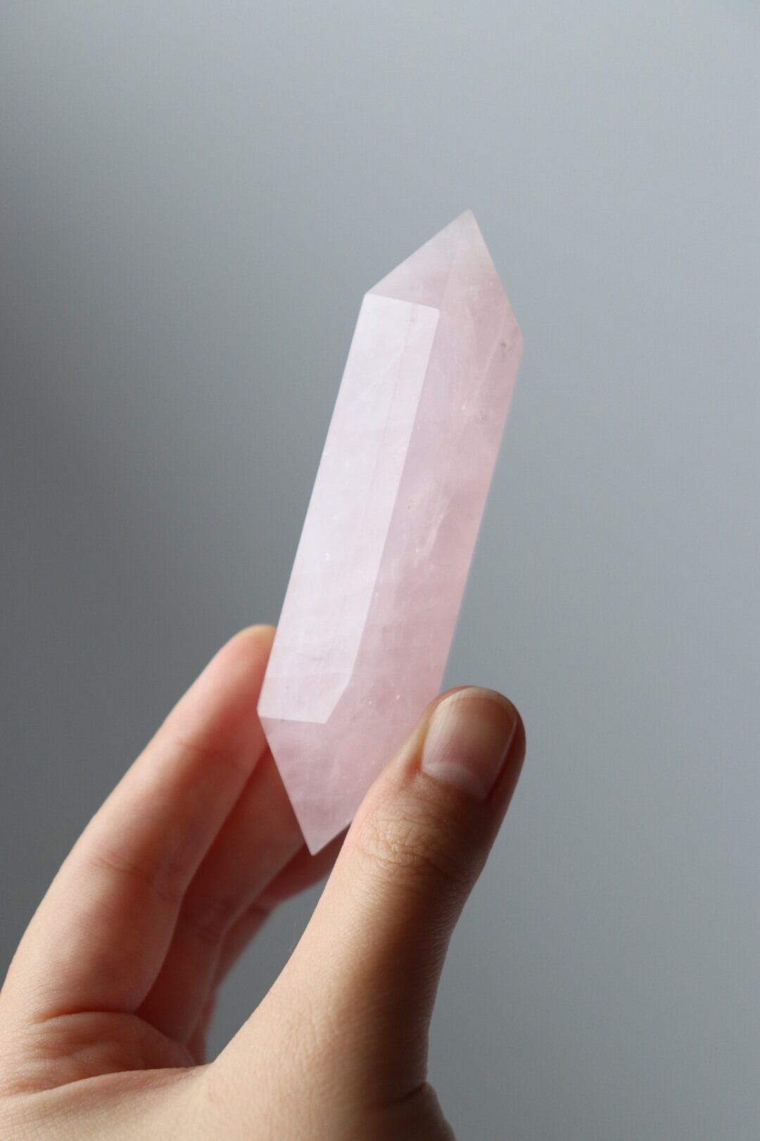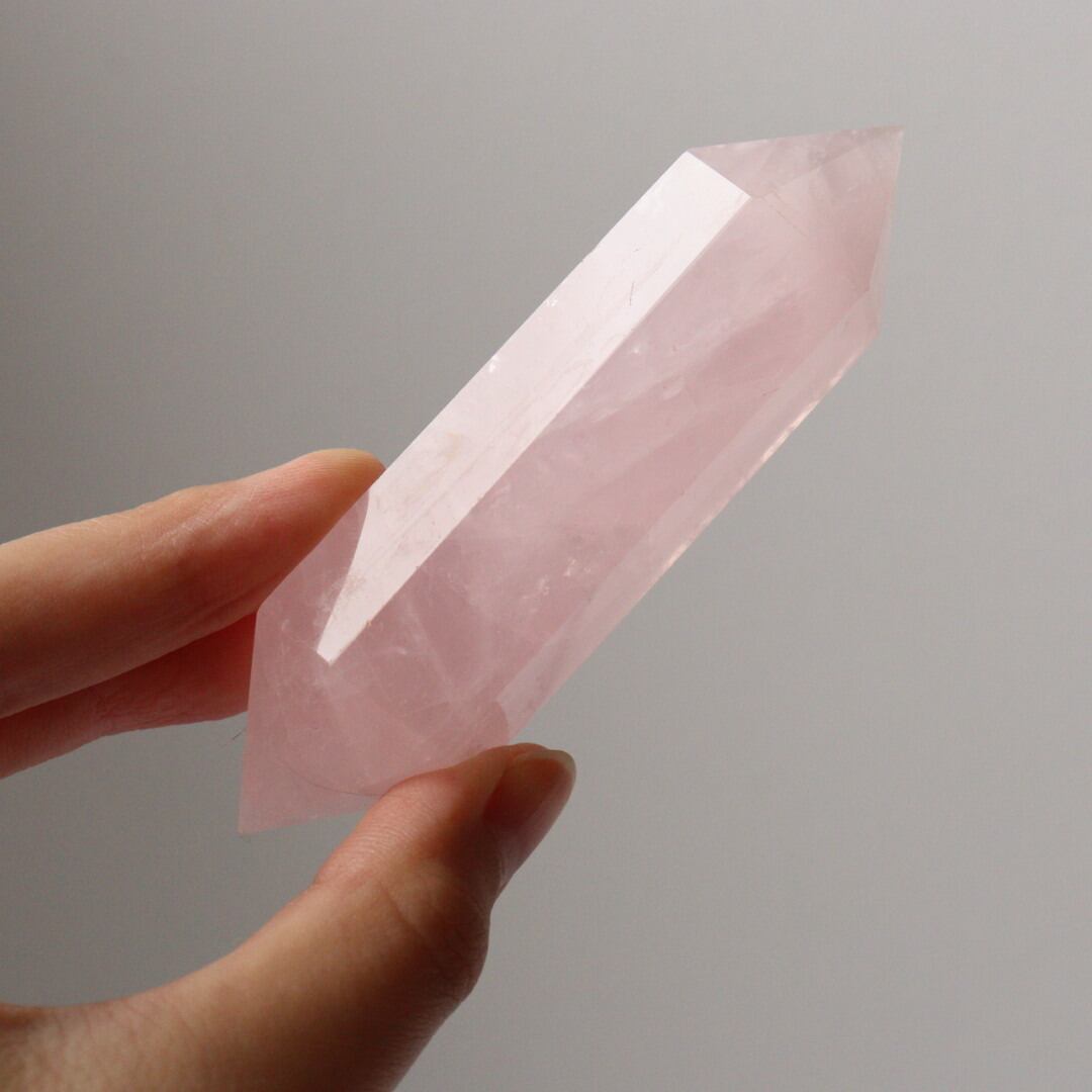 こちらは、両端が尖ったダブルポイントの形に磨かれたローズクォーツ。