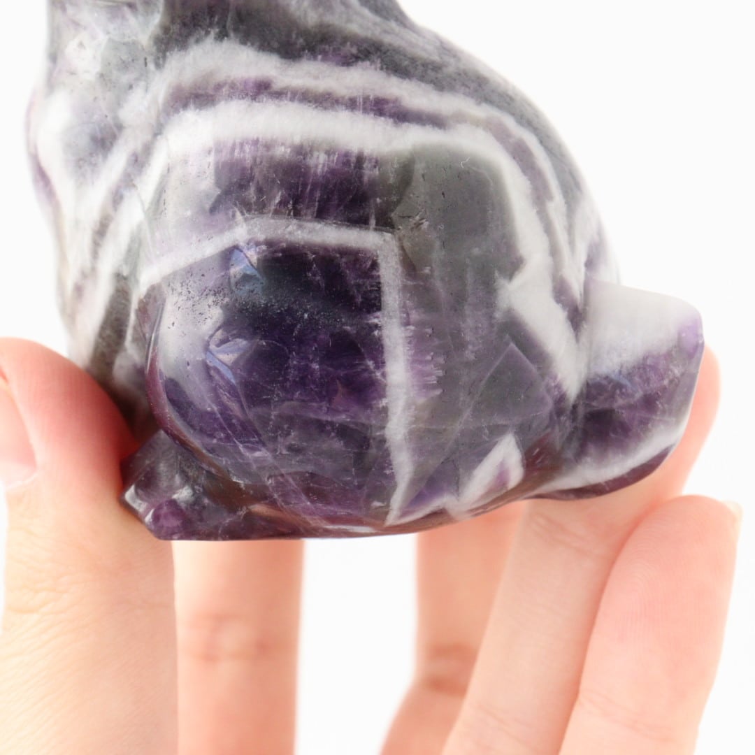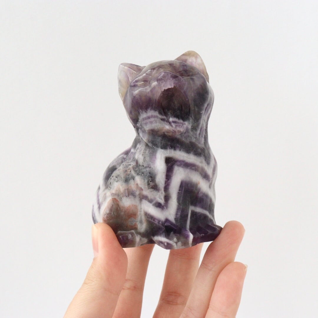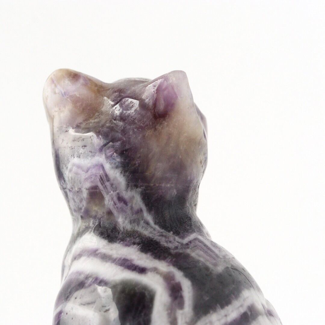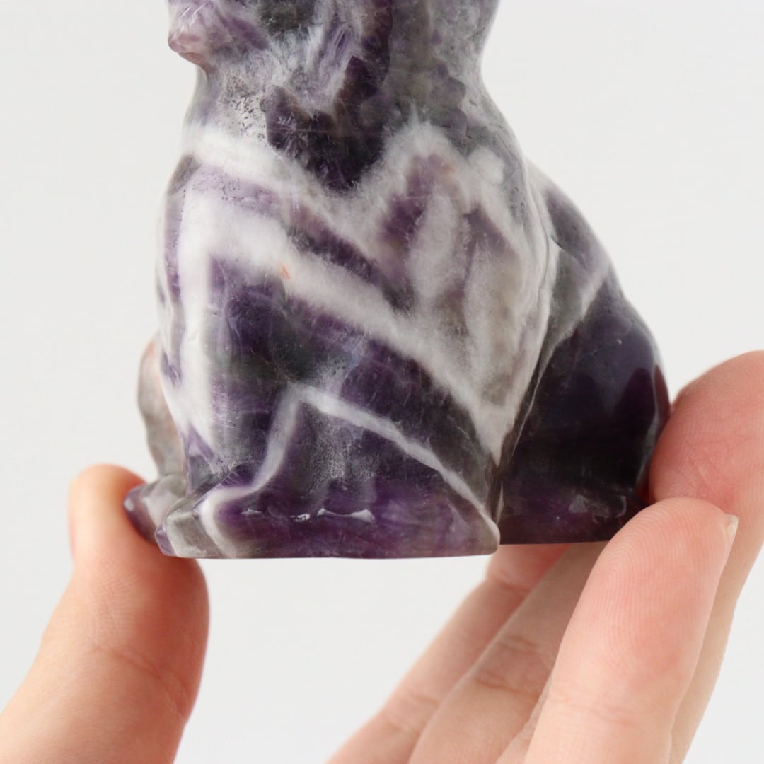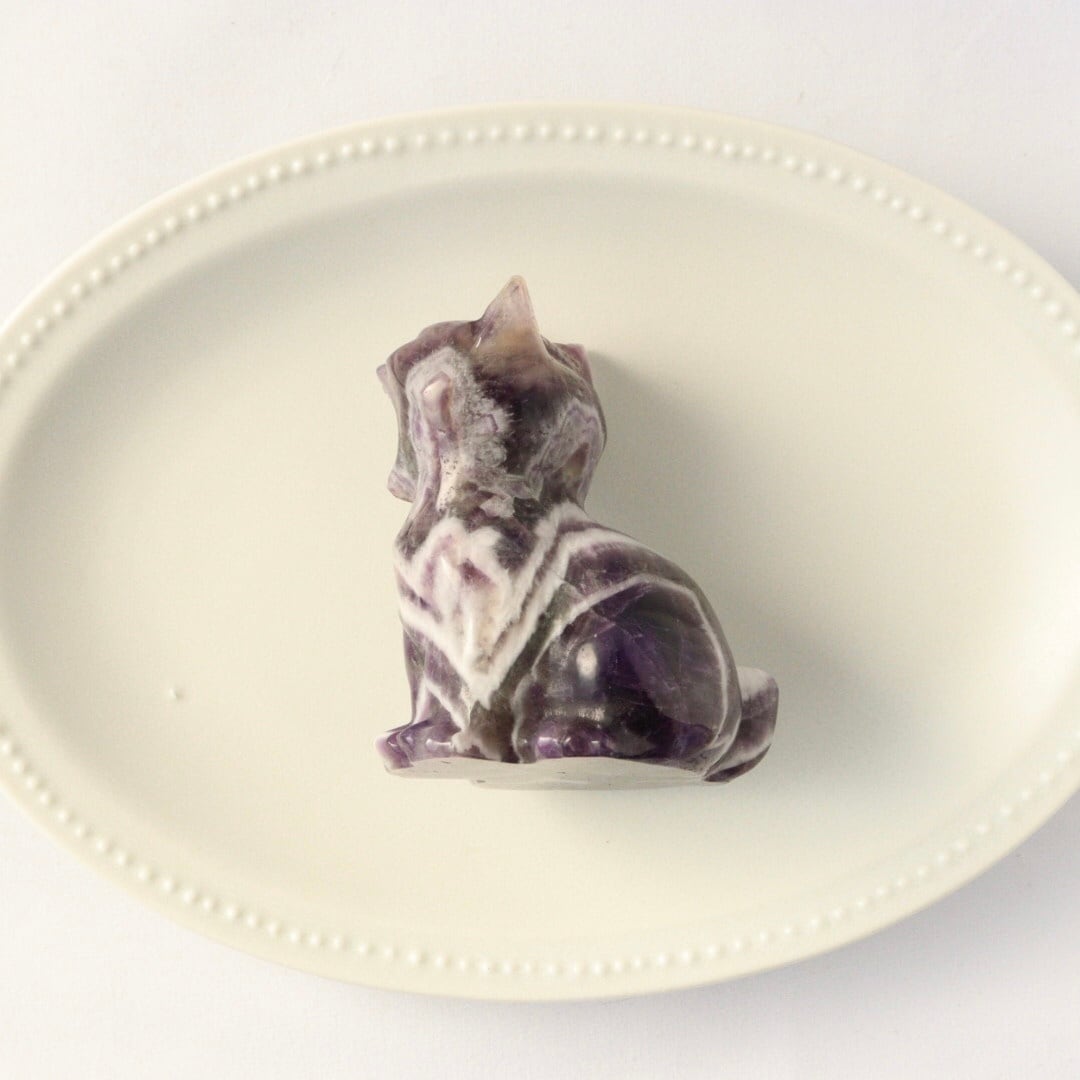 濃いパープルにホワイトの幾何学模様が浮かぶシェブロンアメジストでカービングされた、ちょこんと座るねこ。
