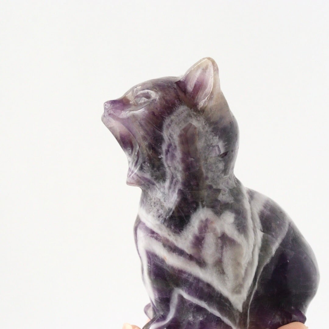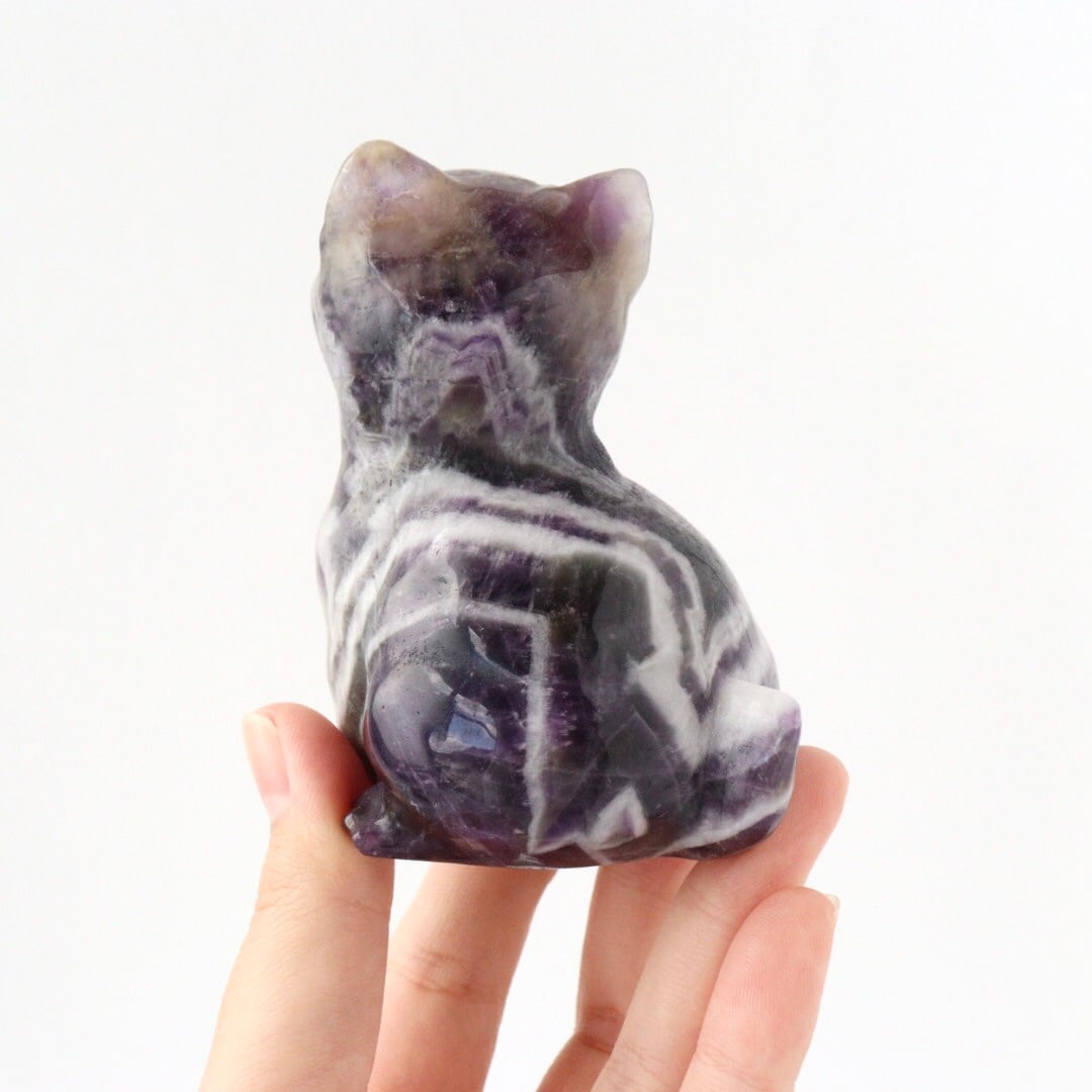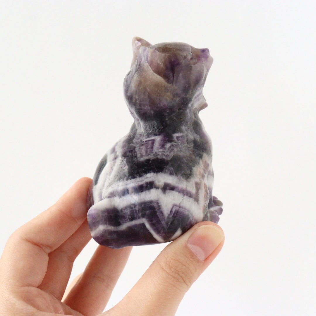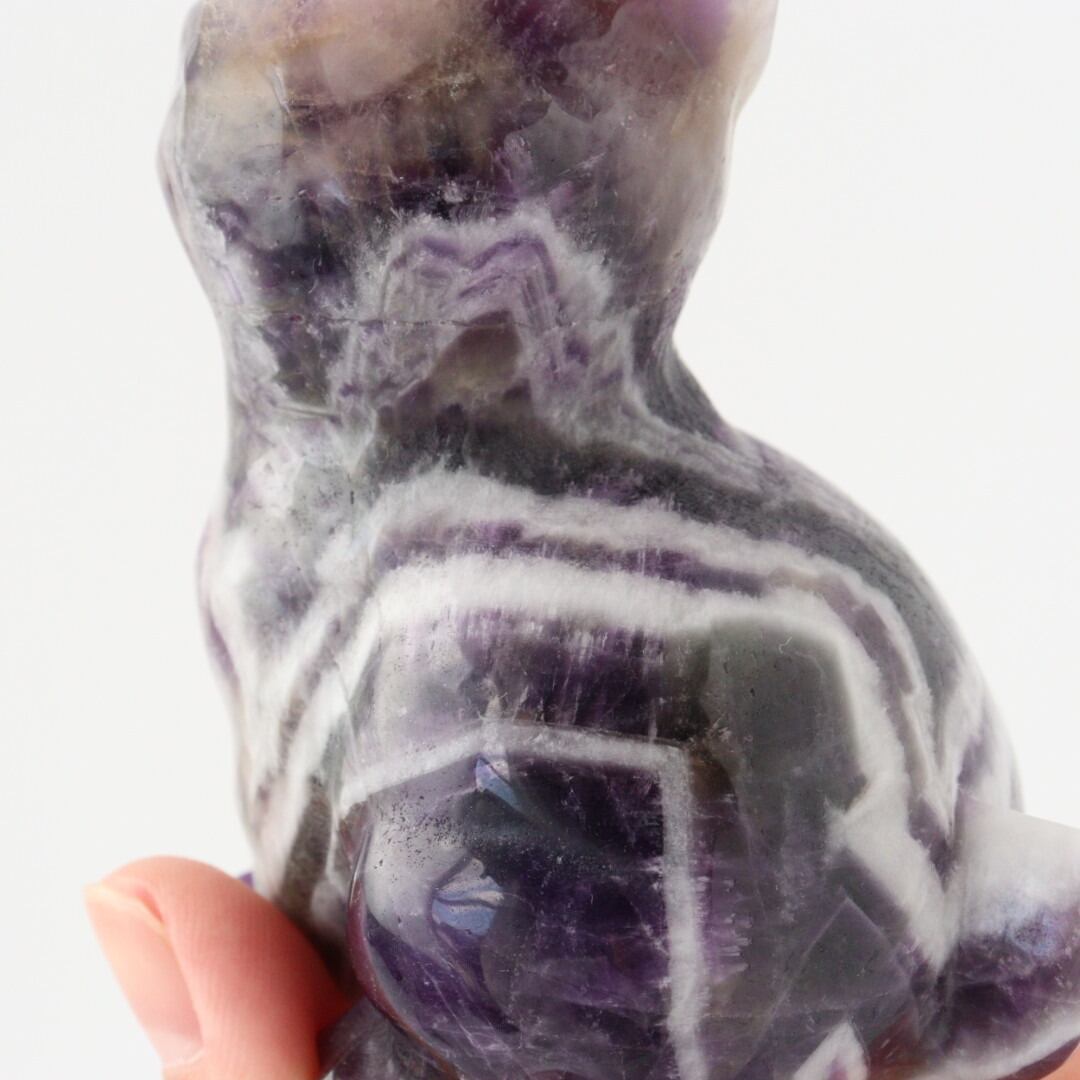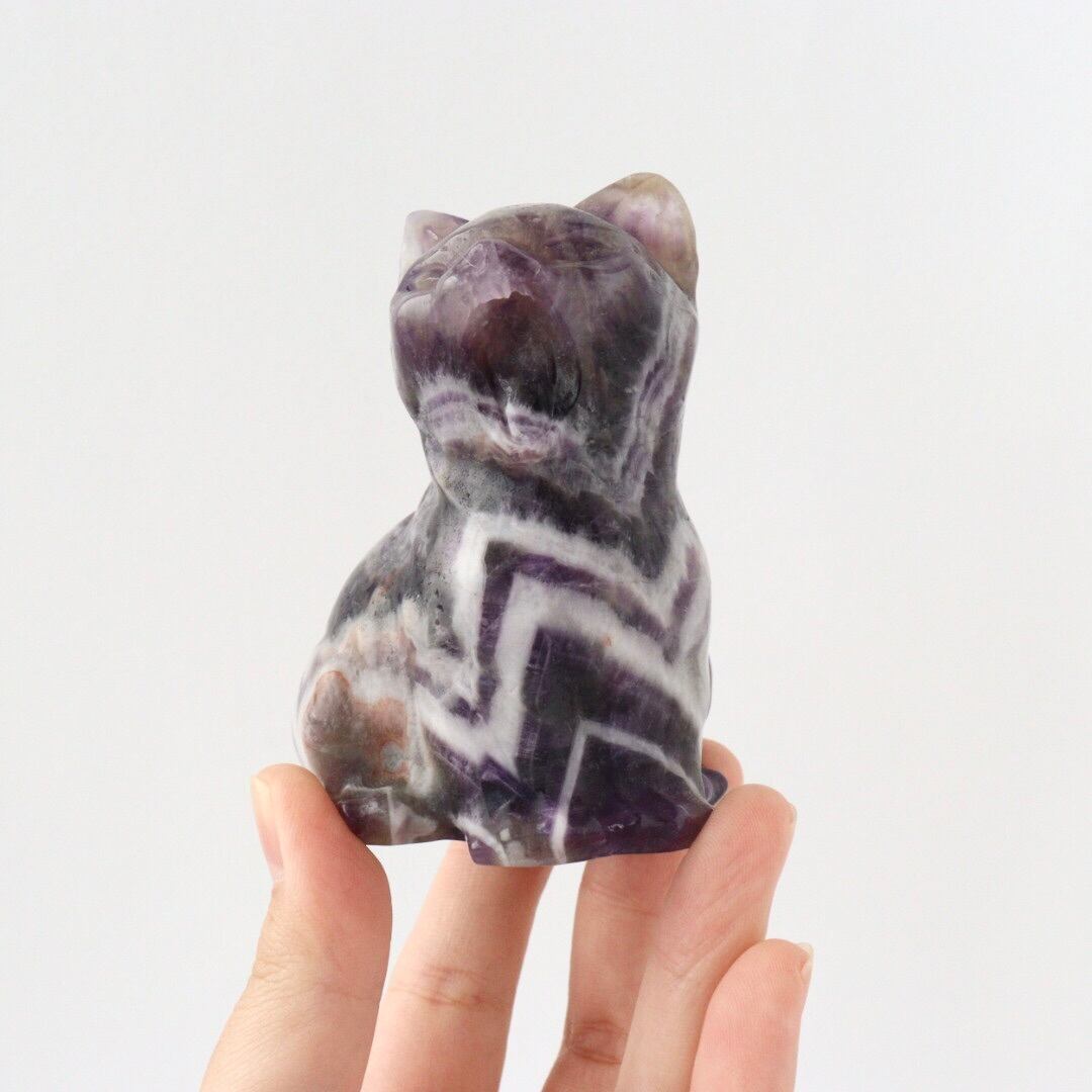 濃いパープルにホワイトの幾何学模様が浮かぶシェブロンアメジストでカービングされた、ちょこんと座るねこ。