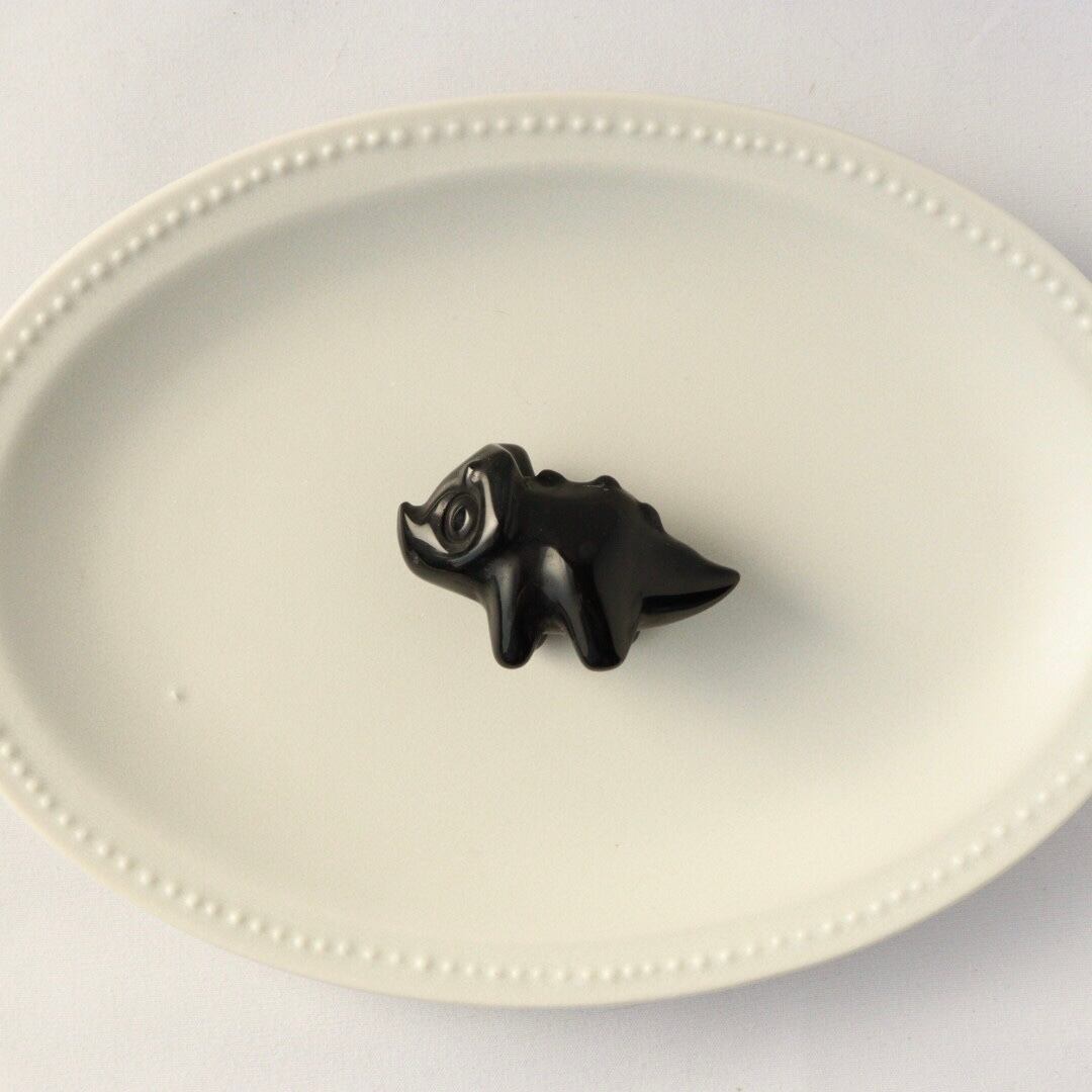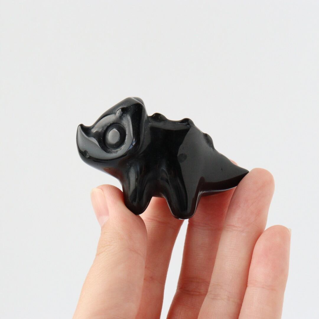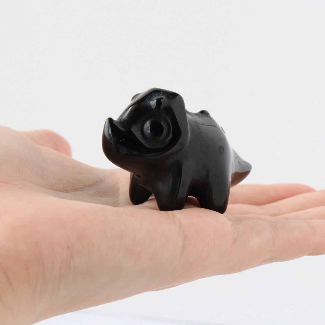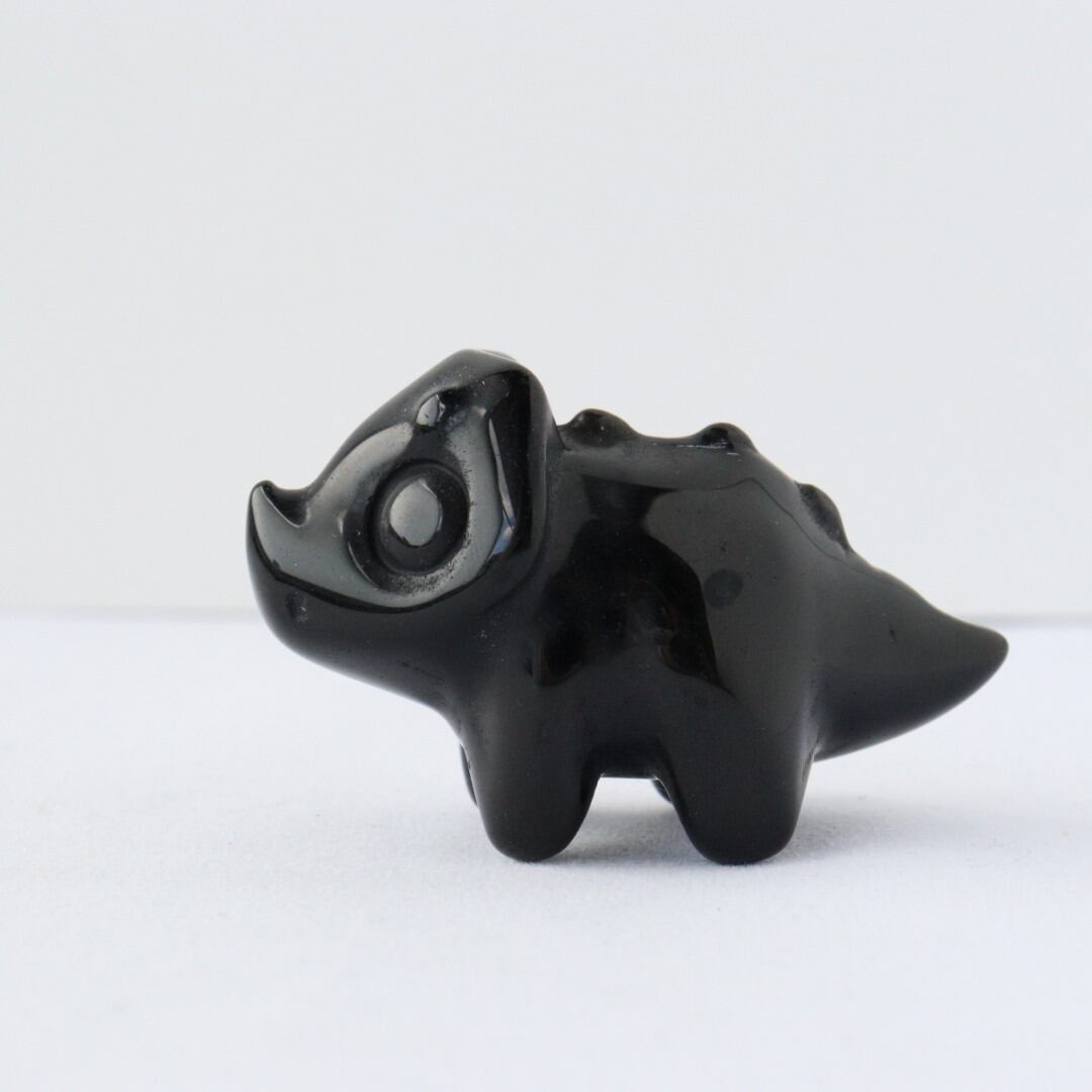 こちらは、丸みのあるフォルムと大きな瞳が印象的なブラックオブシディアンのトリケラトプス。角度によって光沢が艶やかな表情が変化し、可愛らしさと石の力強さが同時に楽しめます。
