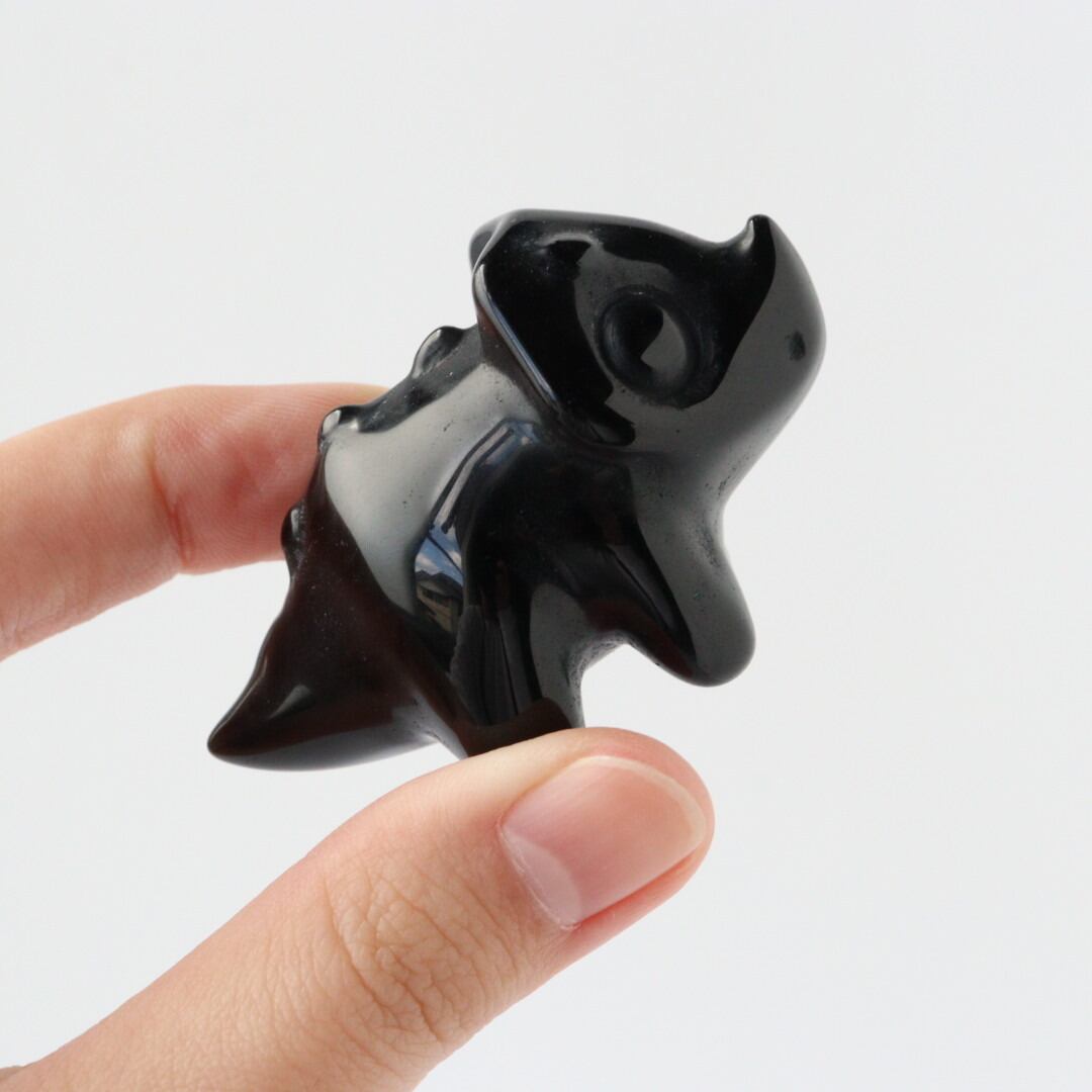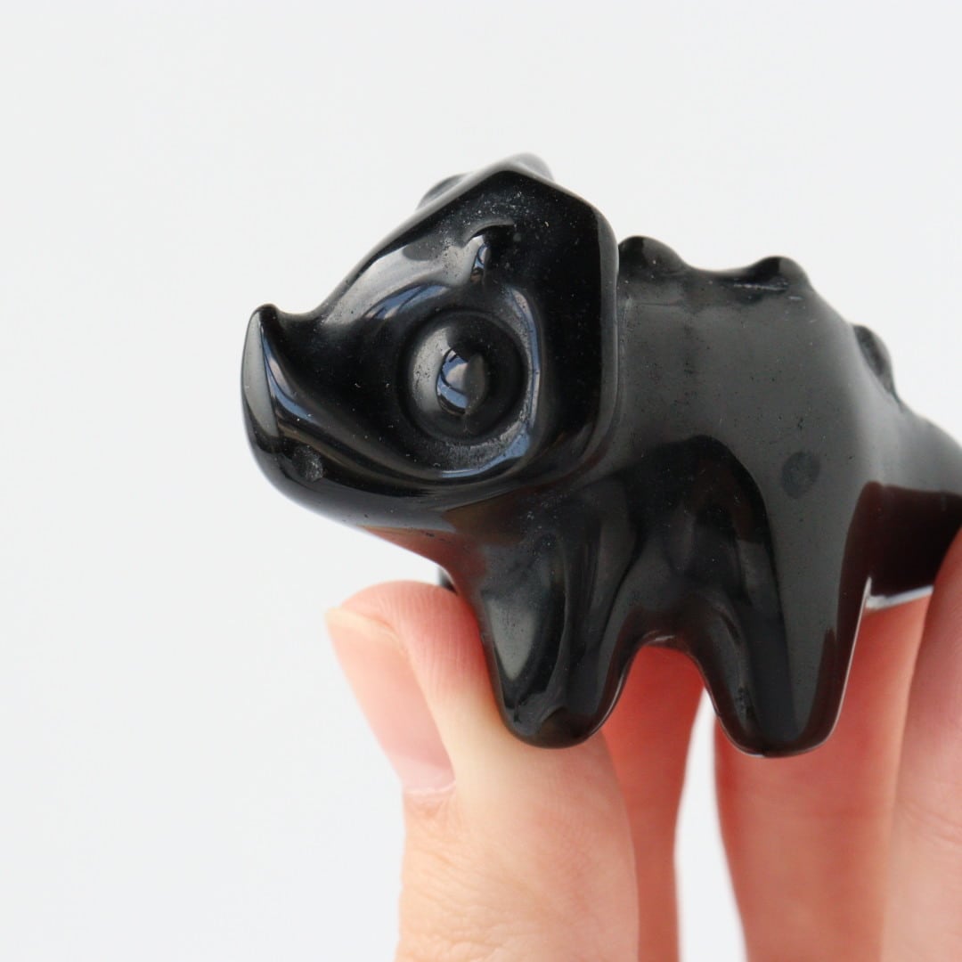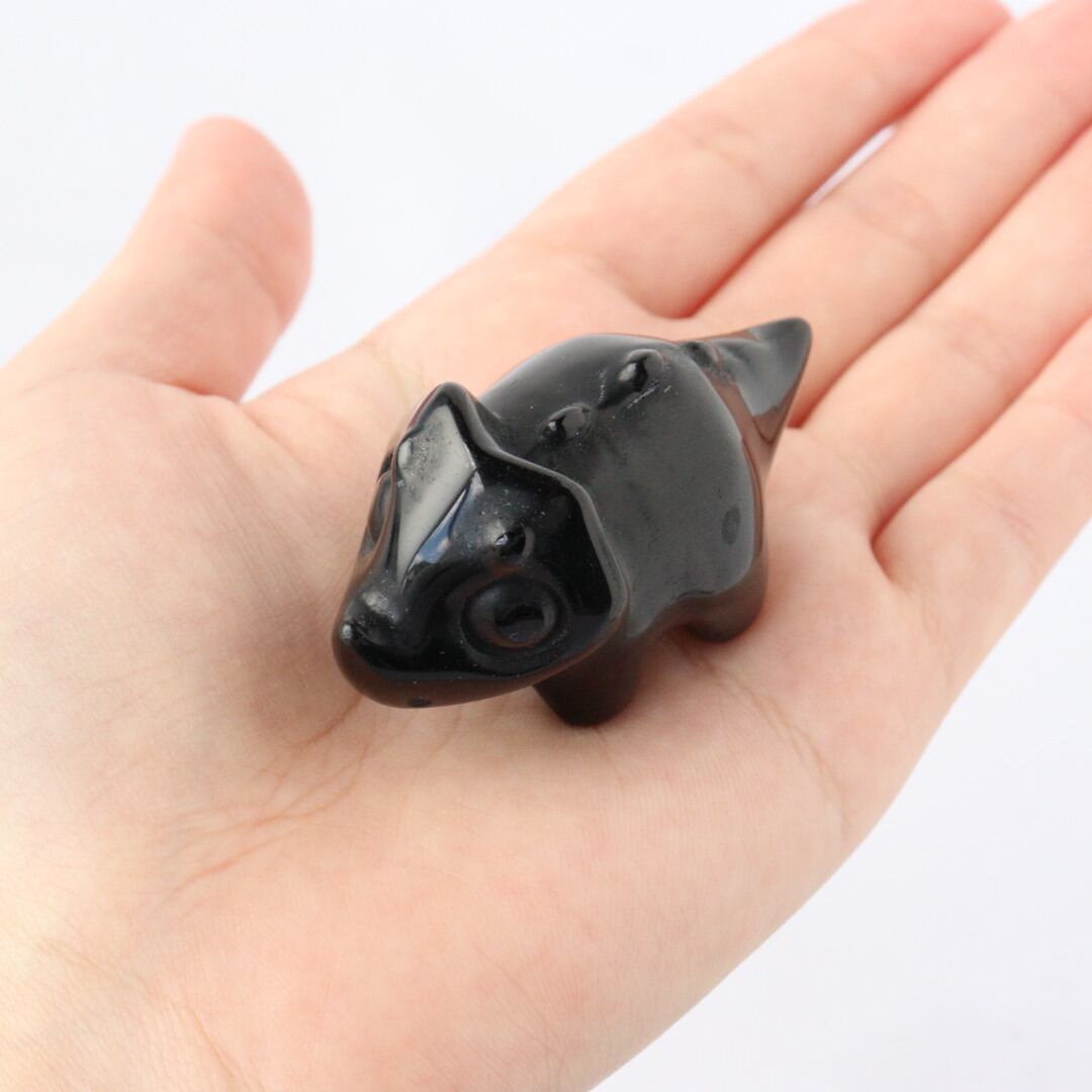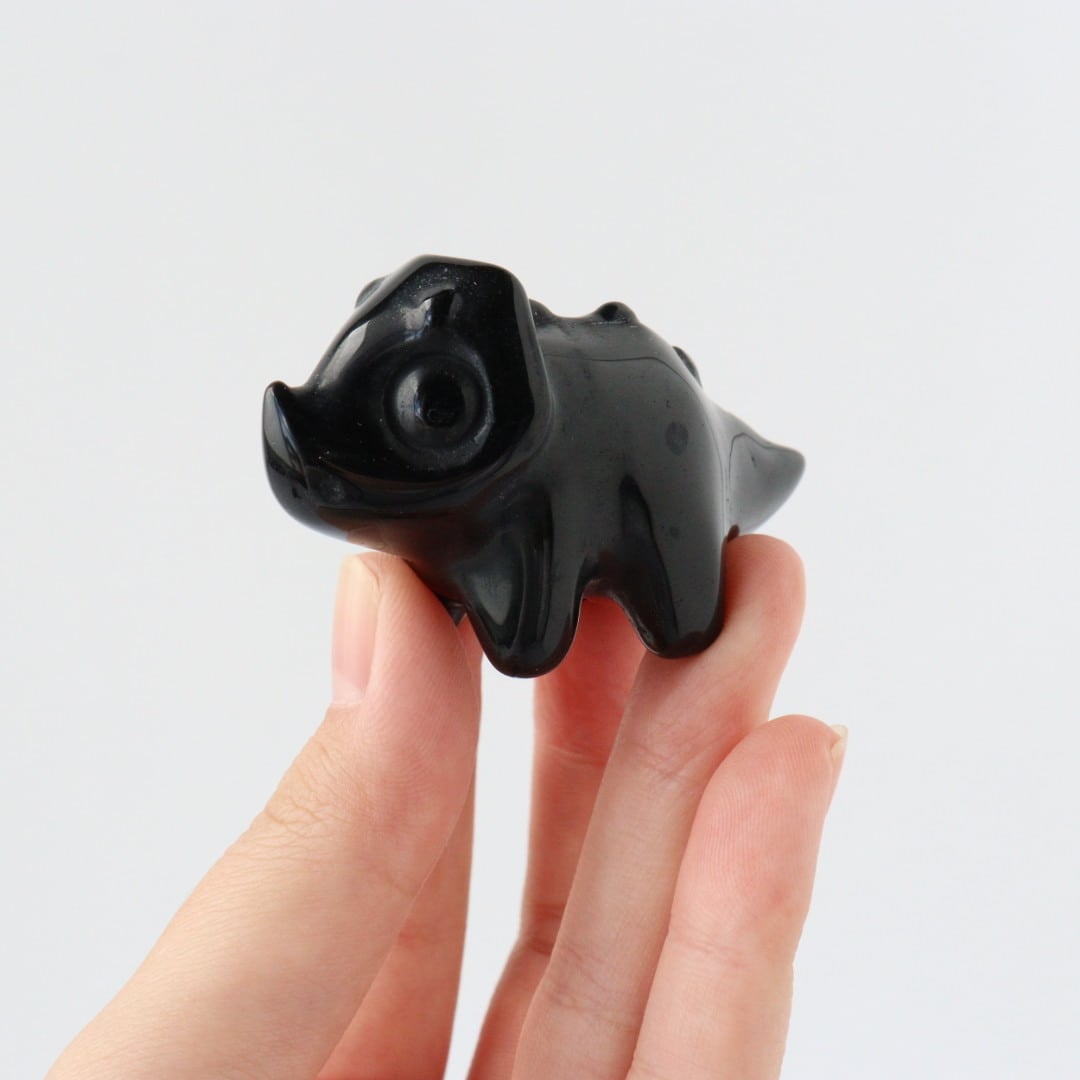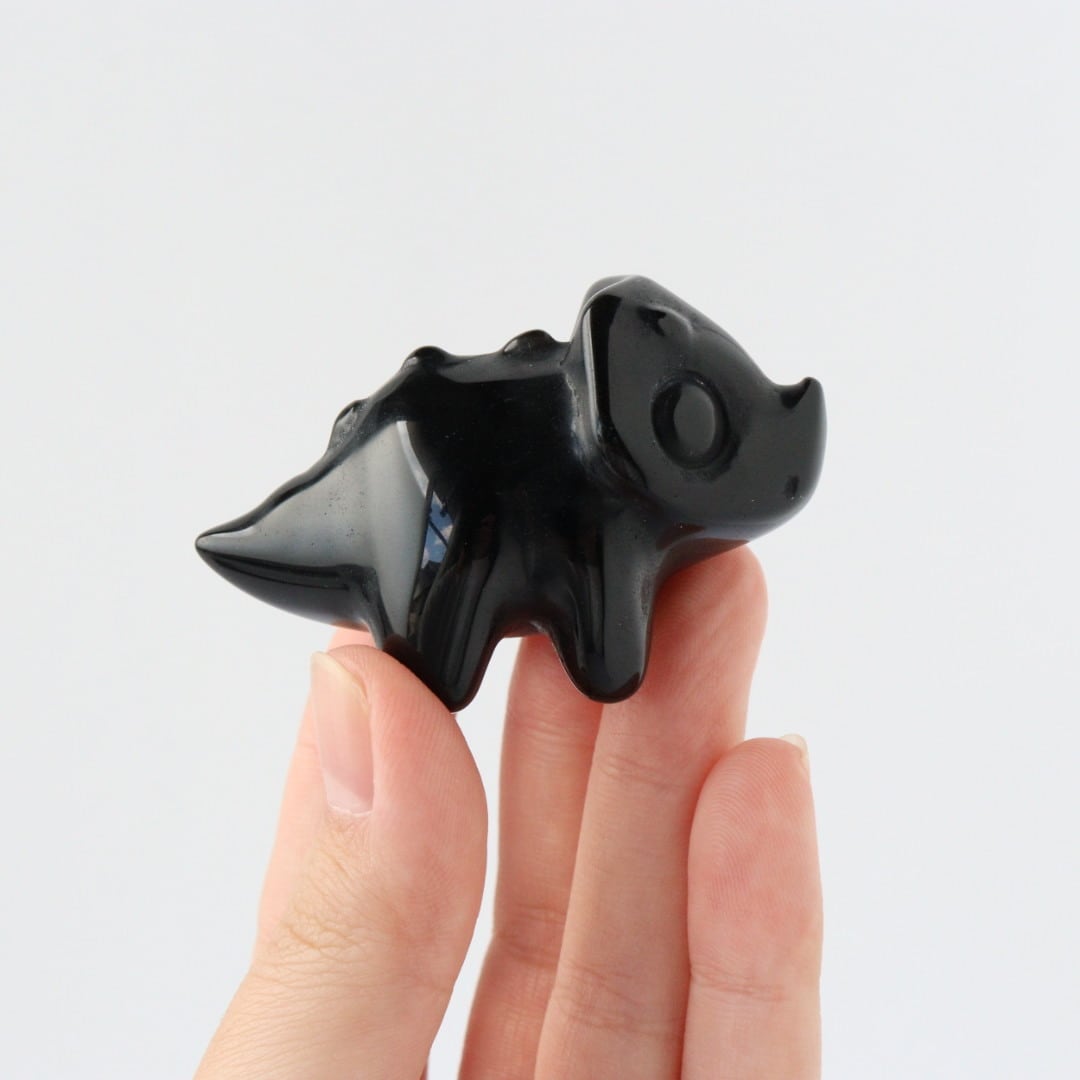 こちらは、丸みのあるフォルムと大きな瞳が印象的なブラックオブシディアンのトリケラトプス。角度によって光沢が艶やかな表情が変化し、可愛らしさと石の力強さが同時に楽しめます。