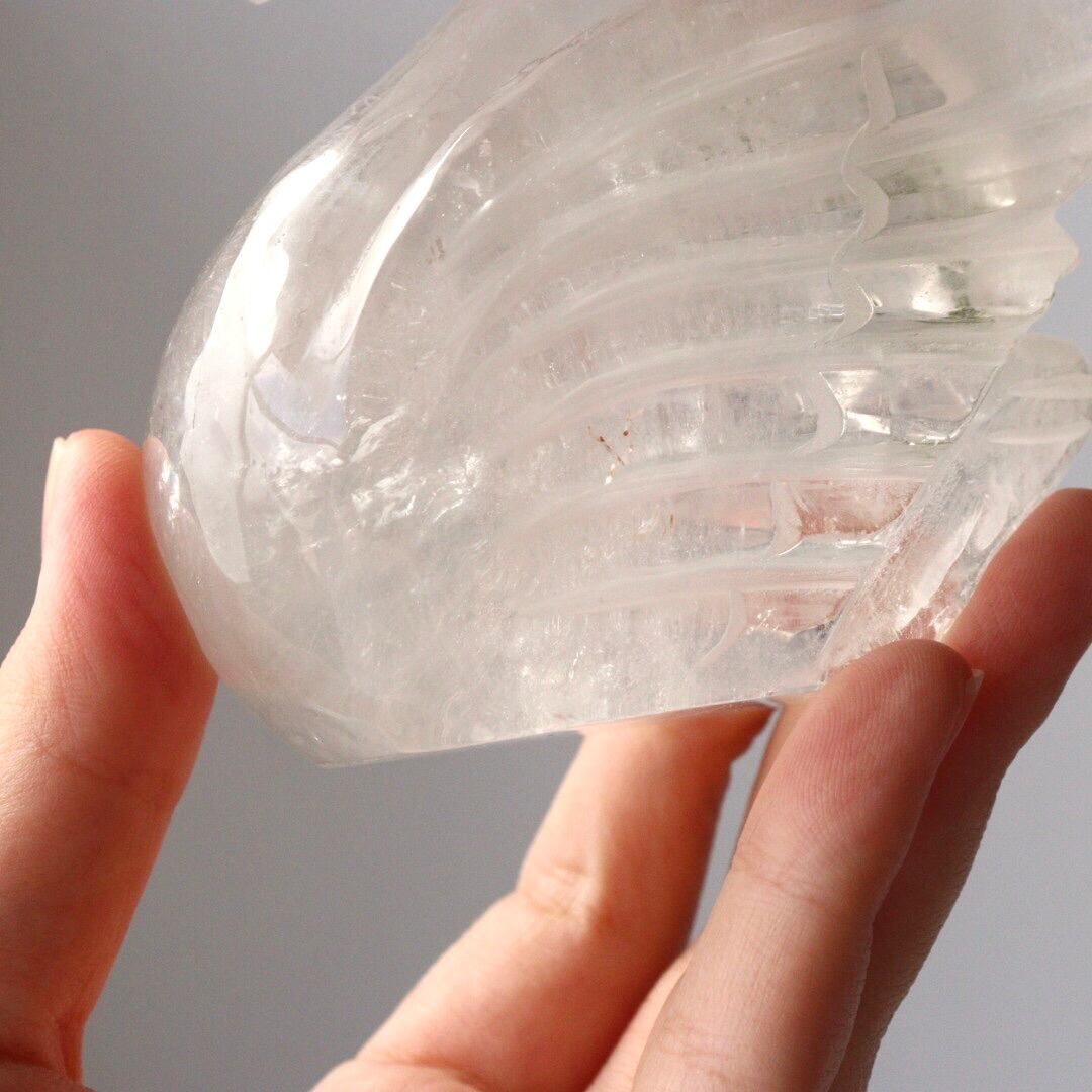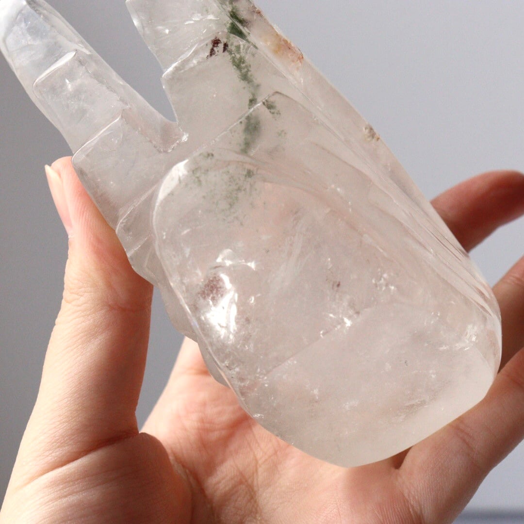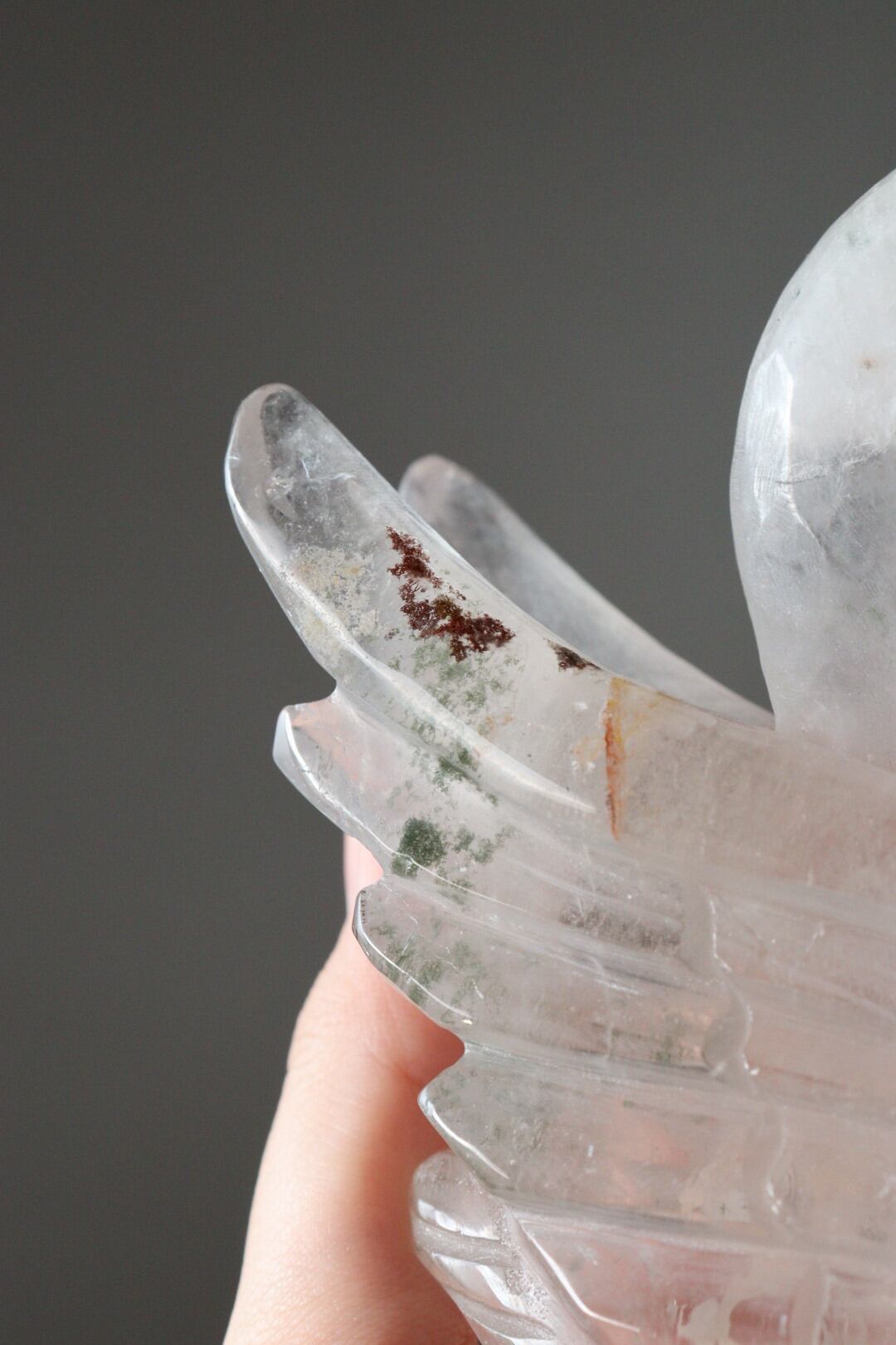 羽の部分には透明度の高いクォーツが広がり、その中にグリーンやブラウンのインクルージョンが点描のように浮かびます。
