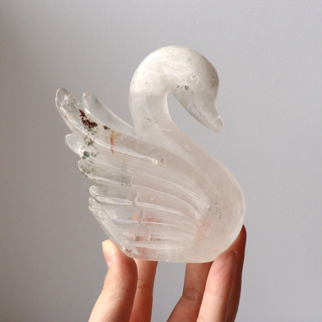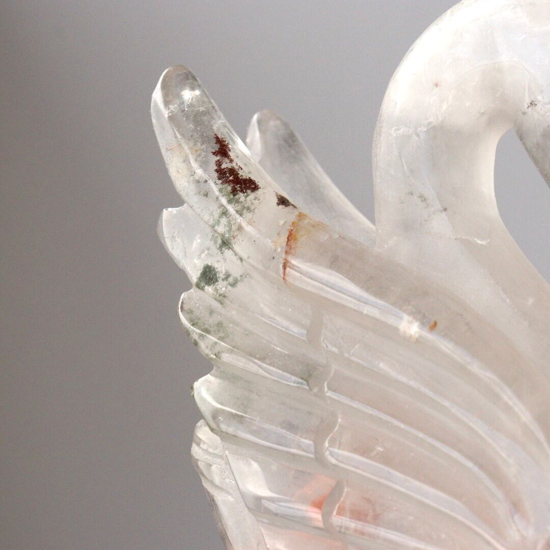 透明結晶とガーデンクォーツの景色が混ざり合い、伸びやかな白鳥のシルエットへと彫刻されています。