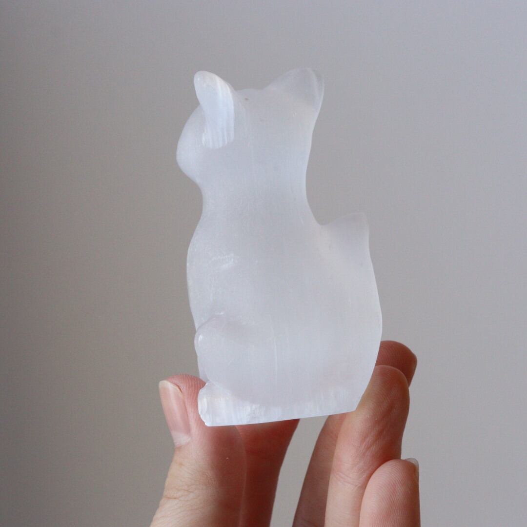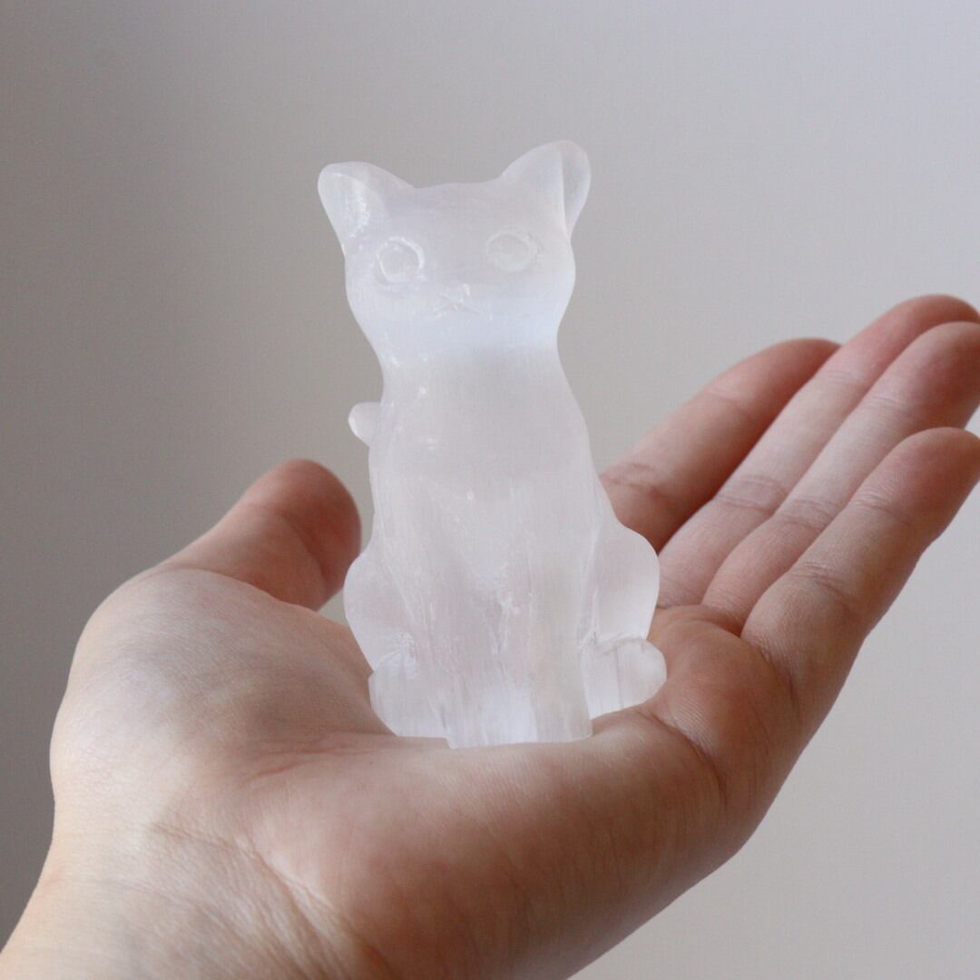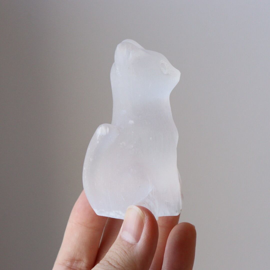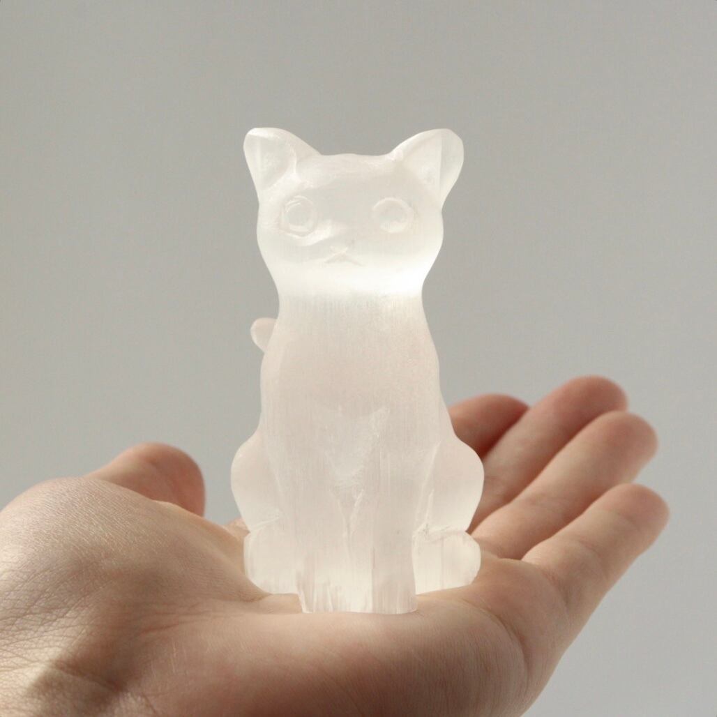 こちらは、半透明の結晶美が際立つセレナイトのねこ。