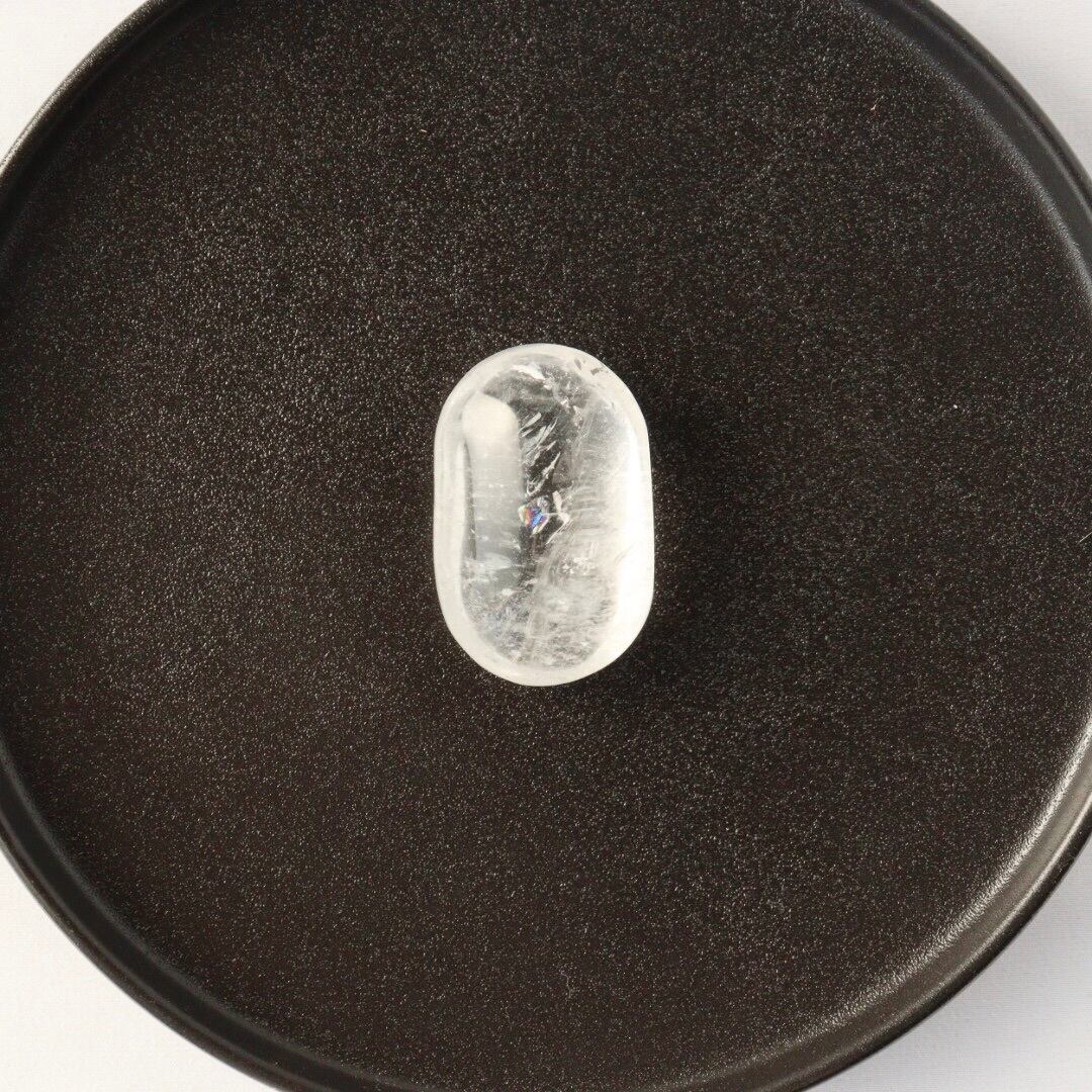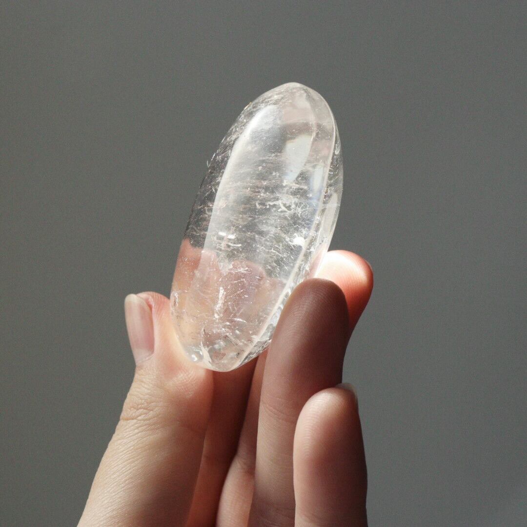 こちらは、ゆがみのある有機的な俵型が魅力的なクリアクォーツの握り石。
