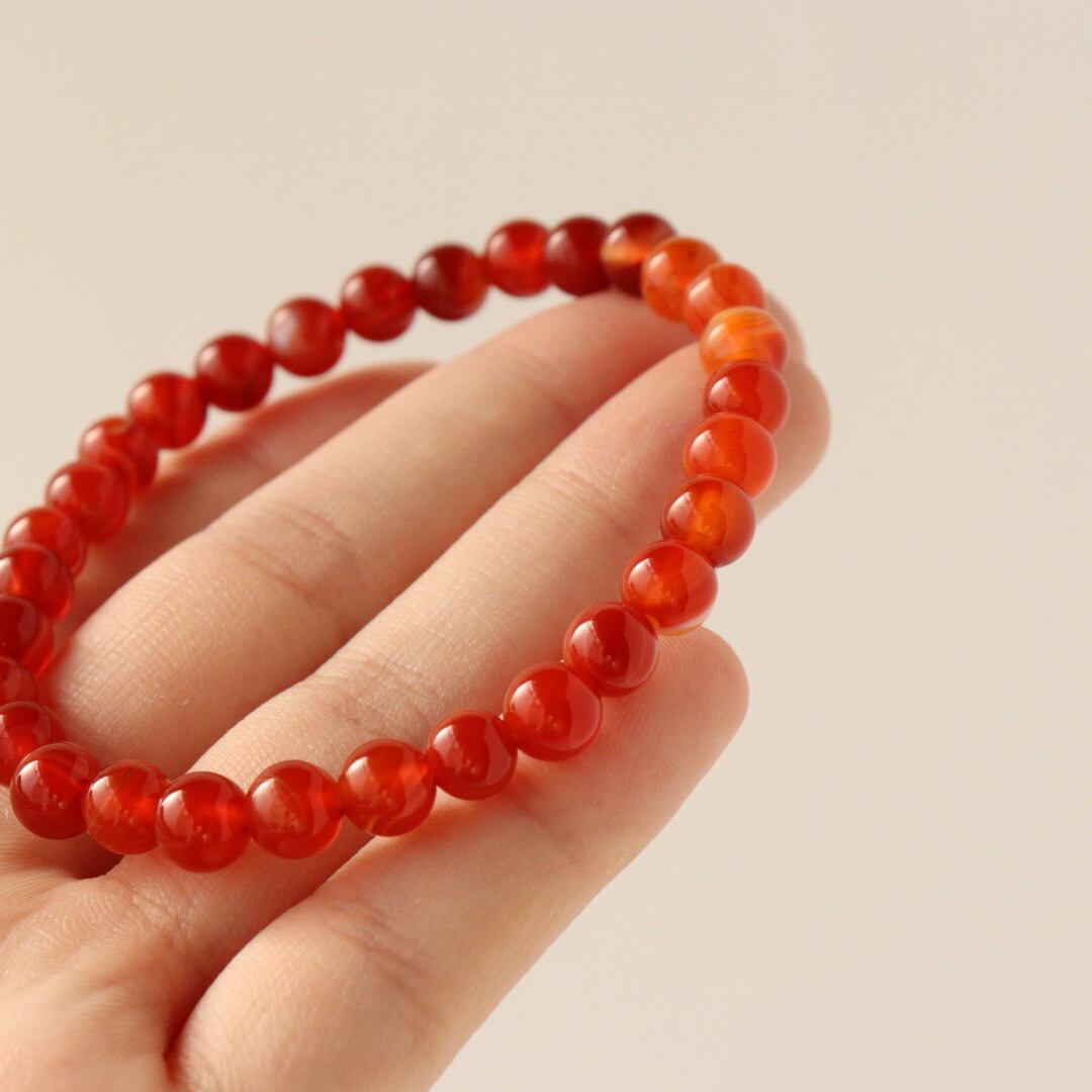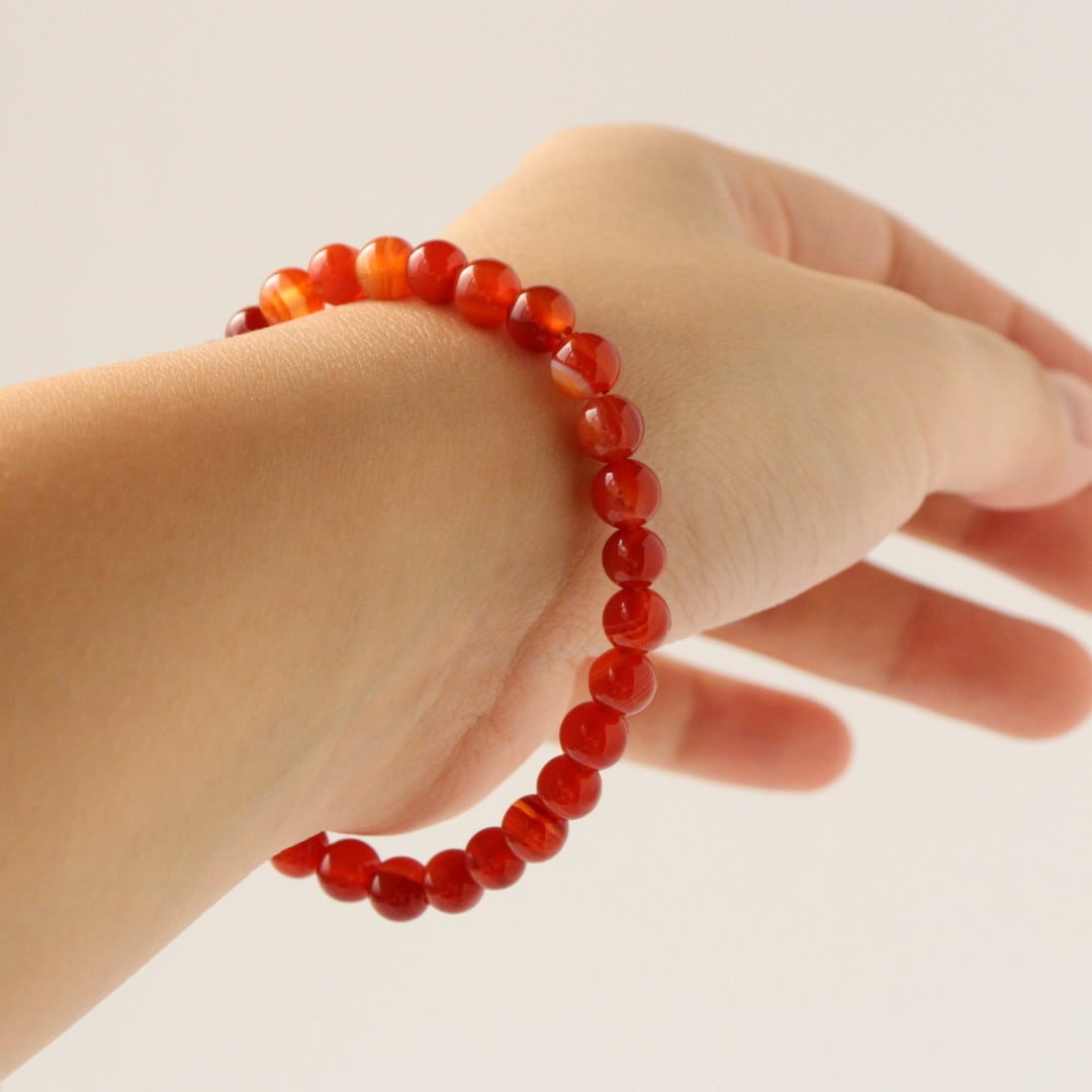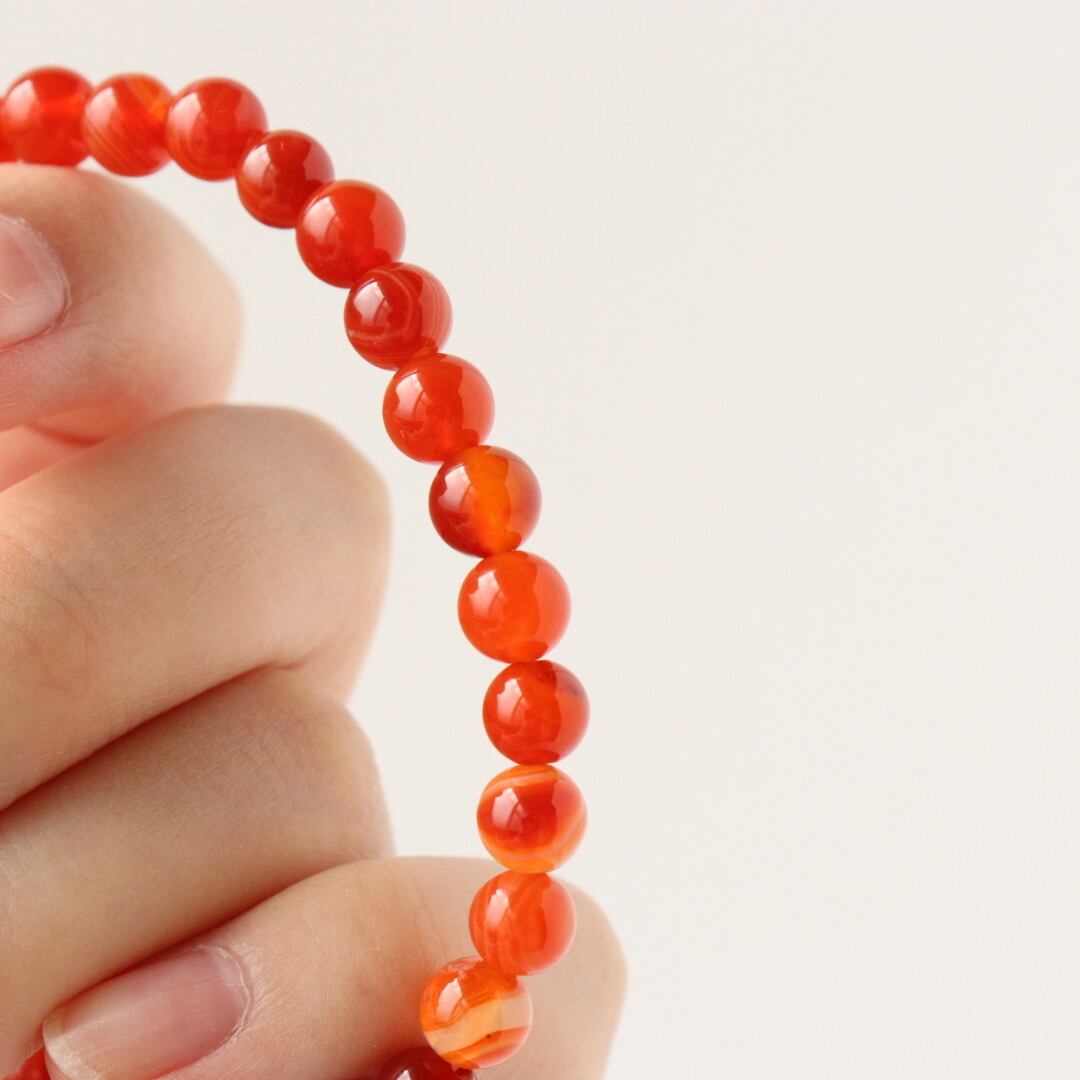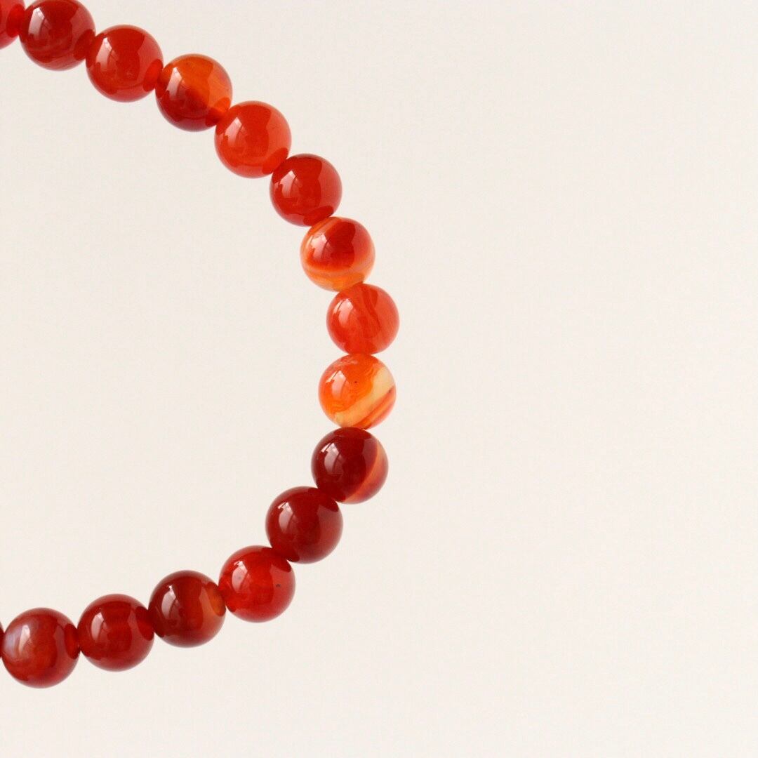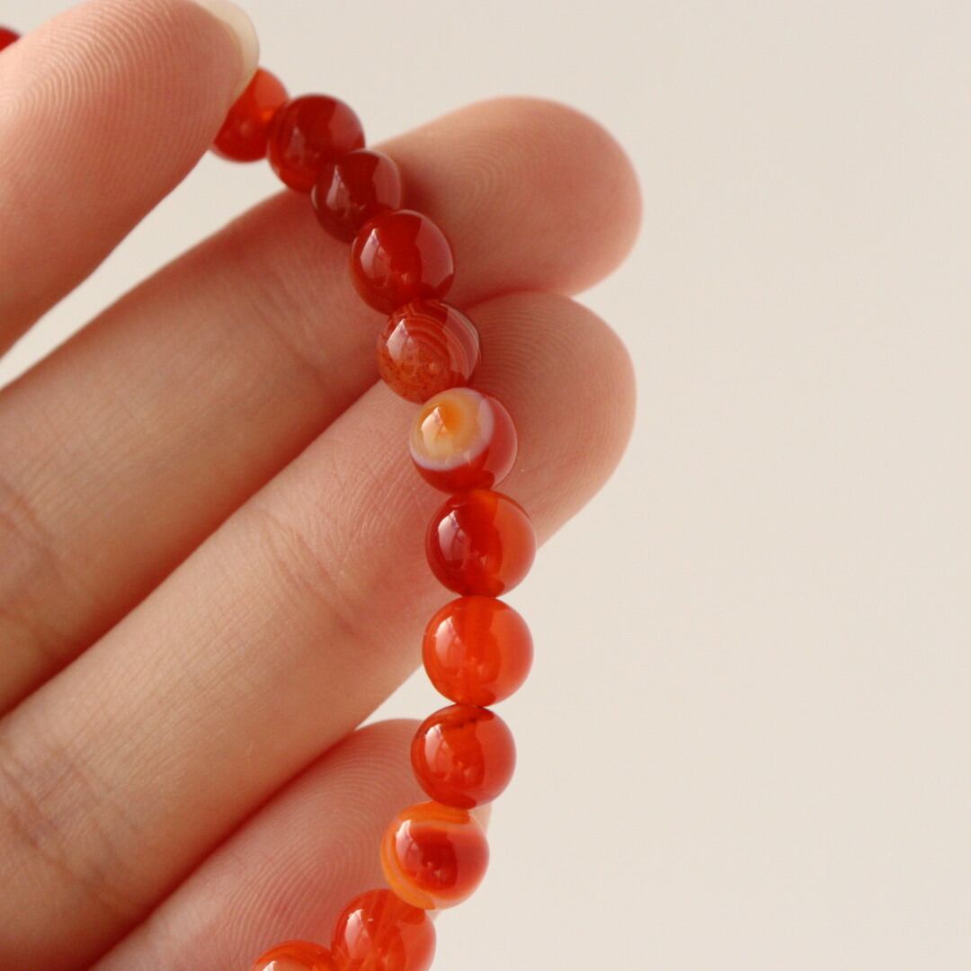 こちらは、濃いレッド、オレンジ、ホワイトの縞模様が自然に溶け合い、華やかな美しさを感じるレッドアゲートのブレスレット。見ていると明るさが湧いてくるような、力強い印象のひとつです。