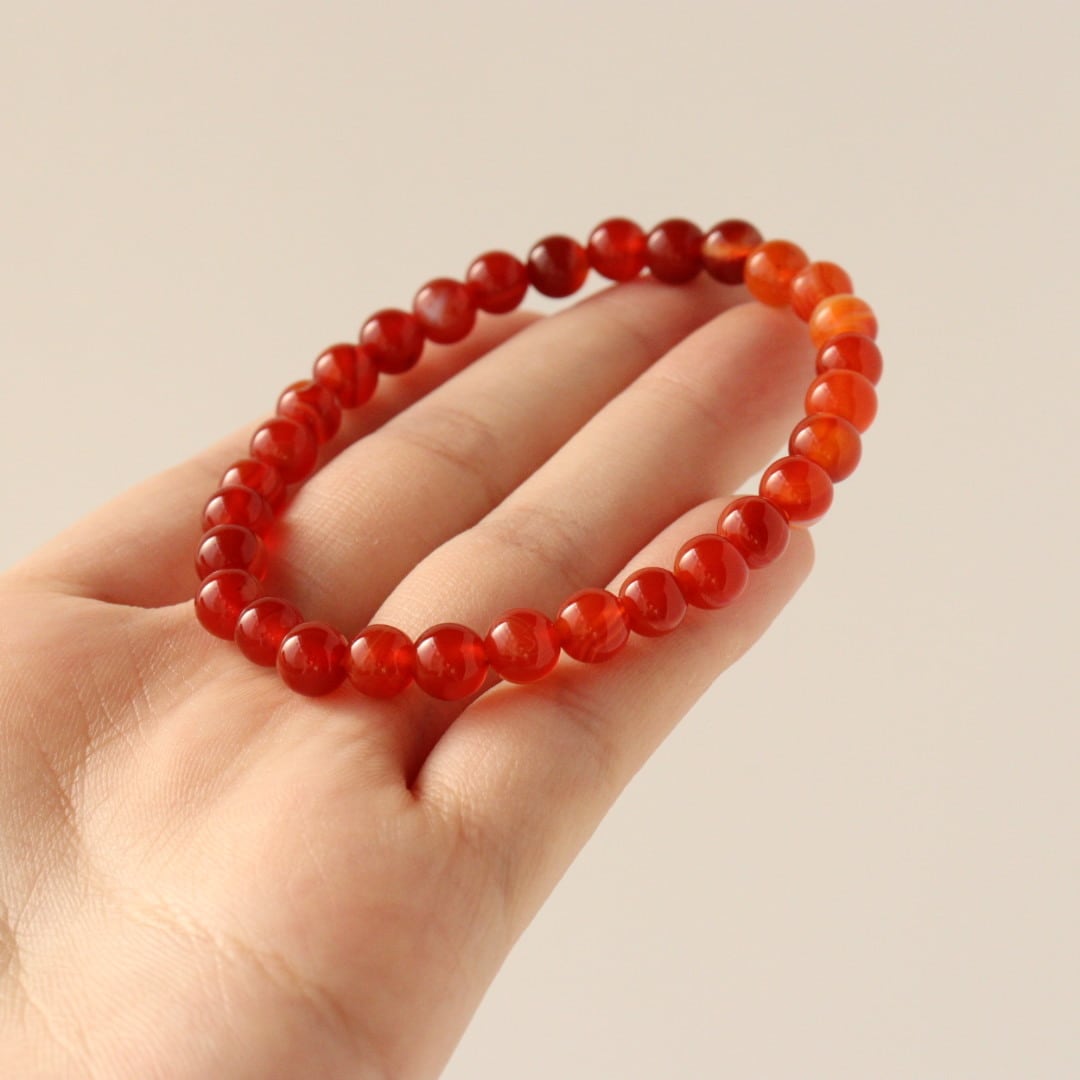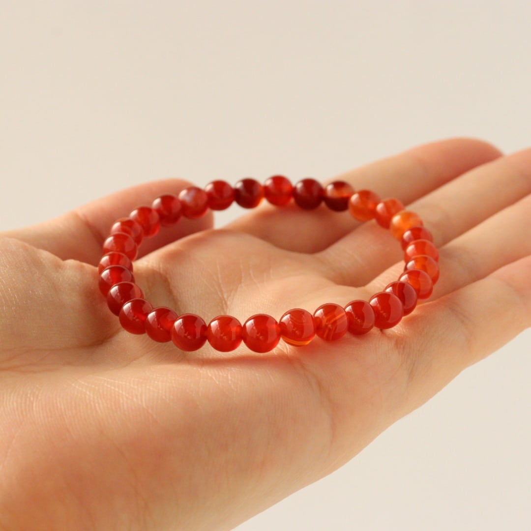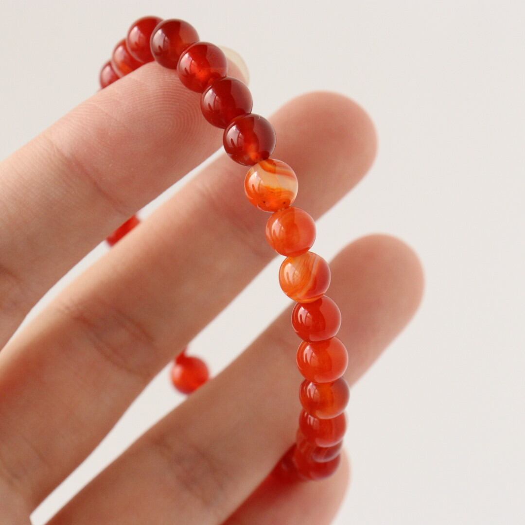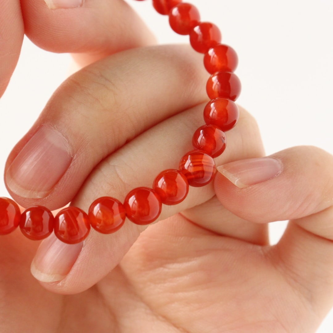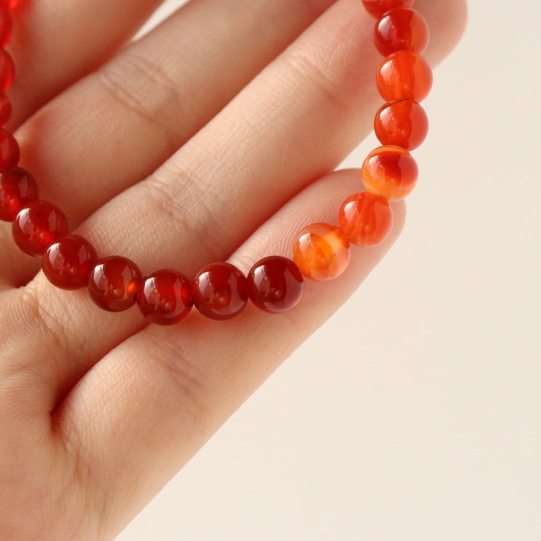 こちらは、濃いレッド、オレンジ、ホワイトの縞模様が自然に溶け合い、華やかな美しさを感じるレッドアゲートのブレスレット。見ていると明るさが湧いてくるような、力強い印象のひとつです。
