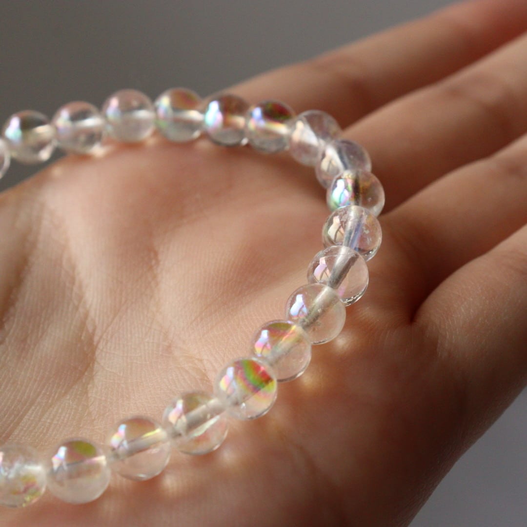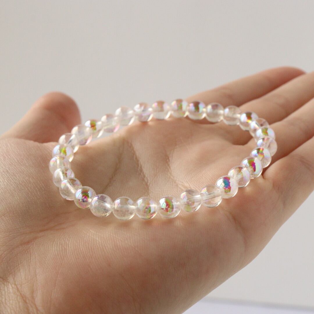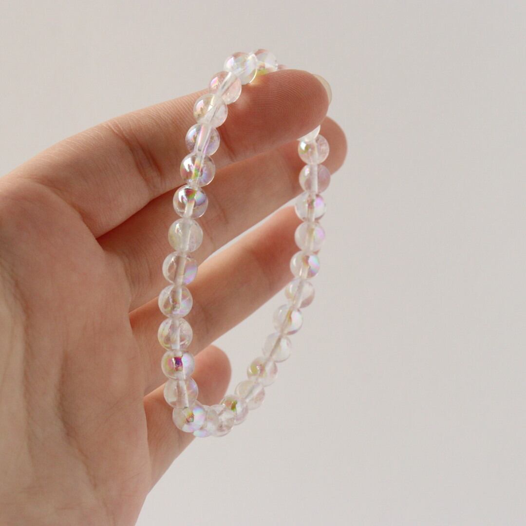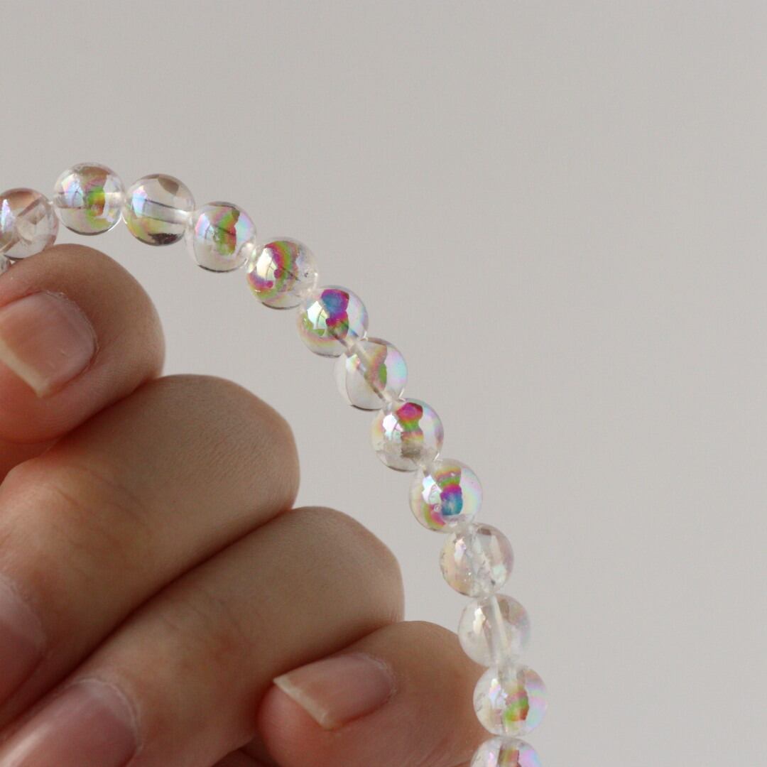 透明度の高いクリアクォーツにプリズムのようなオーラ加工を施した、エンジェルオーラクォーツのブレスレット。一粒一粒が虹色に輝き、光を受けるたびに幻想的な表情を見せます。