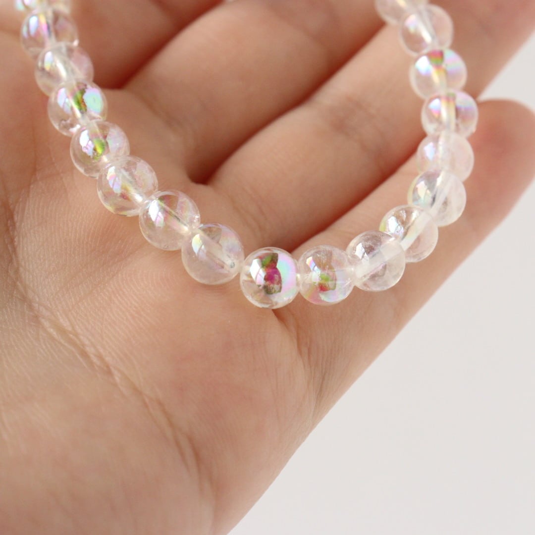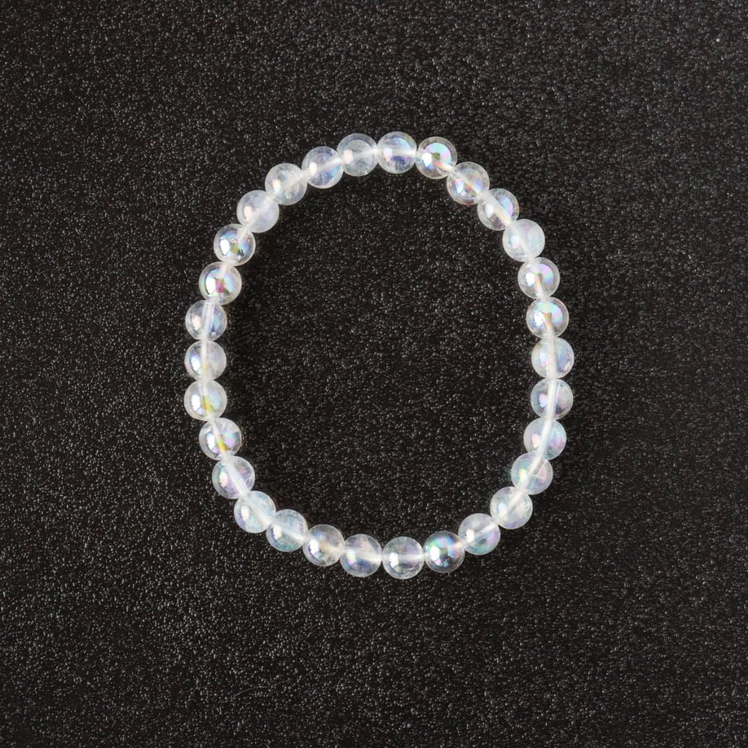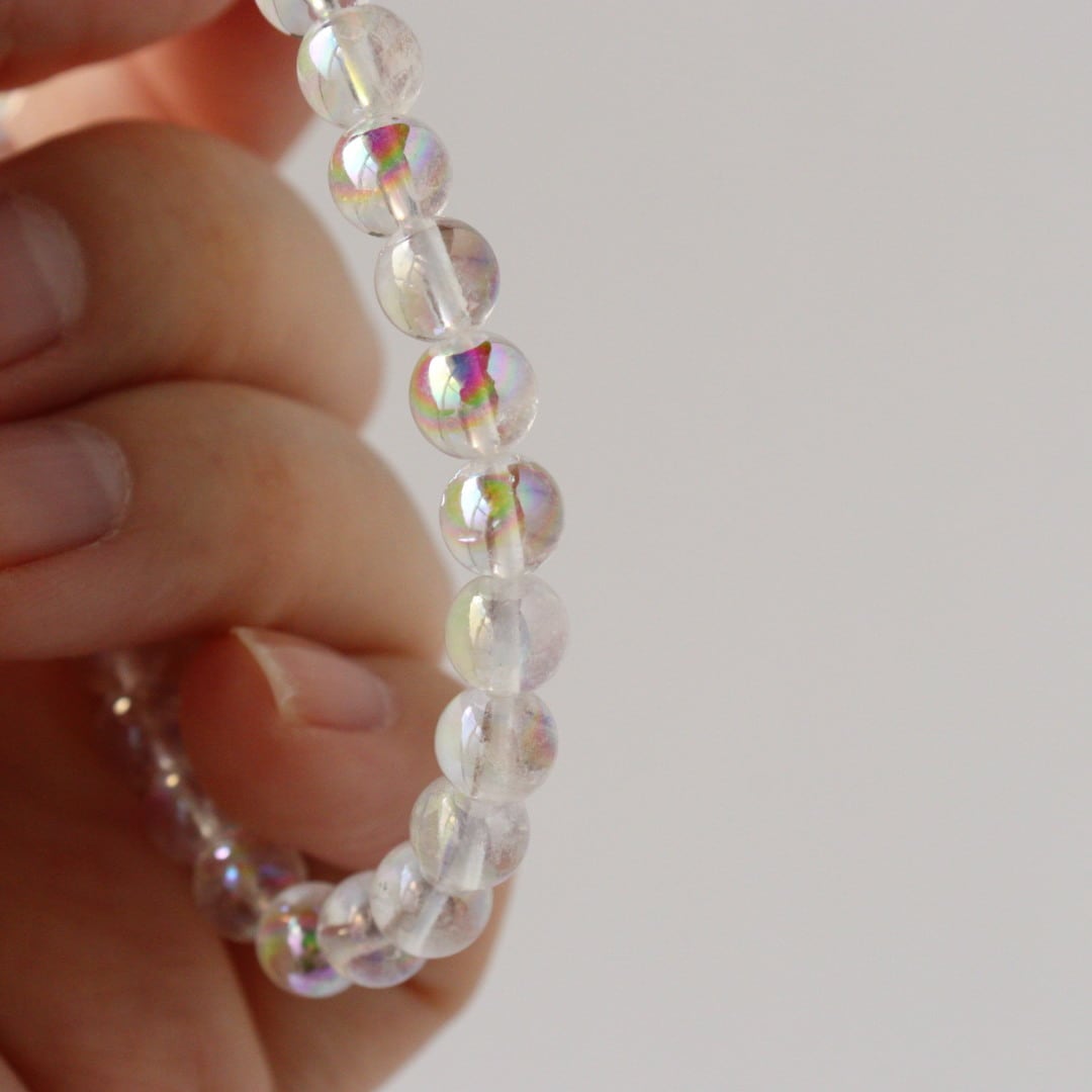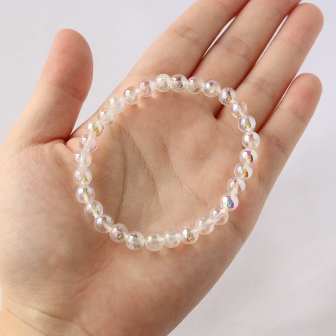 透明度の高いクリアクォーツにプリズムのようなオーラ加工を施した、エンジェルオーラクォーツのブレスレット。一粒一粒が虹色に輝き、光を受けるたびに幻想的な表情を見せます。