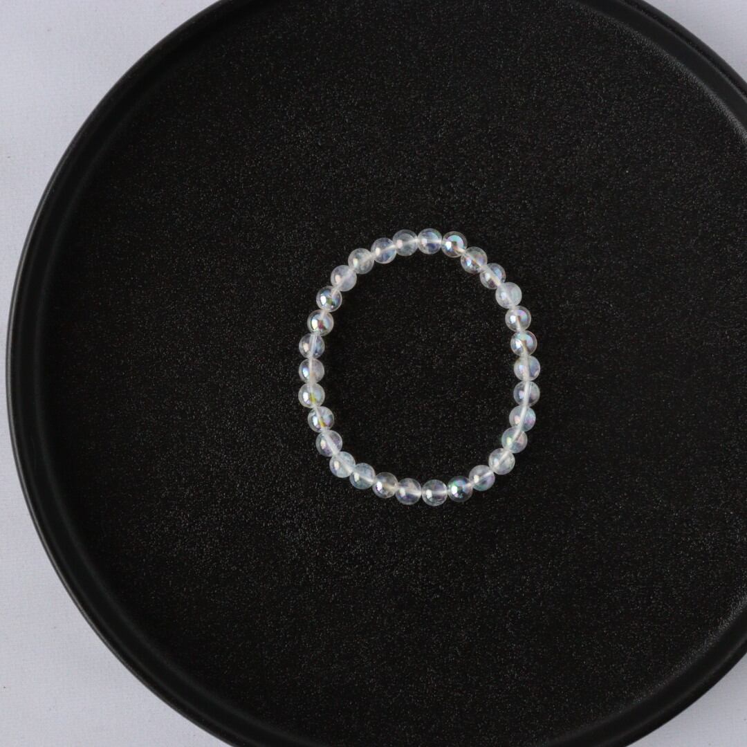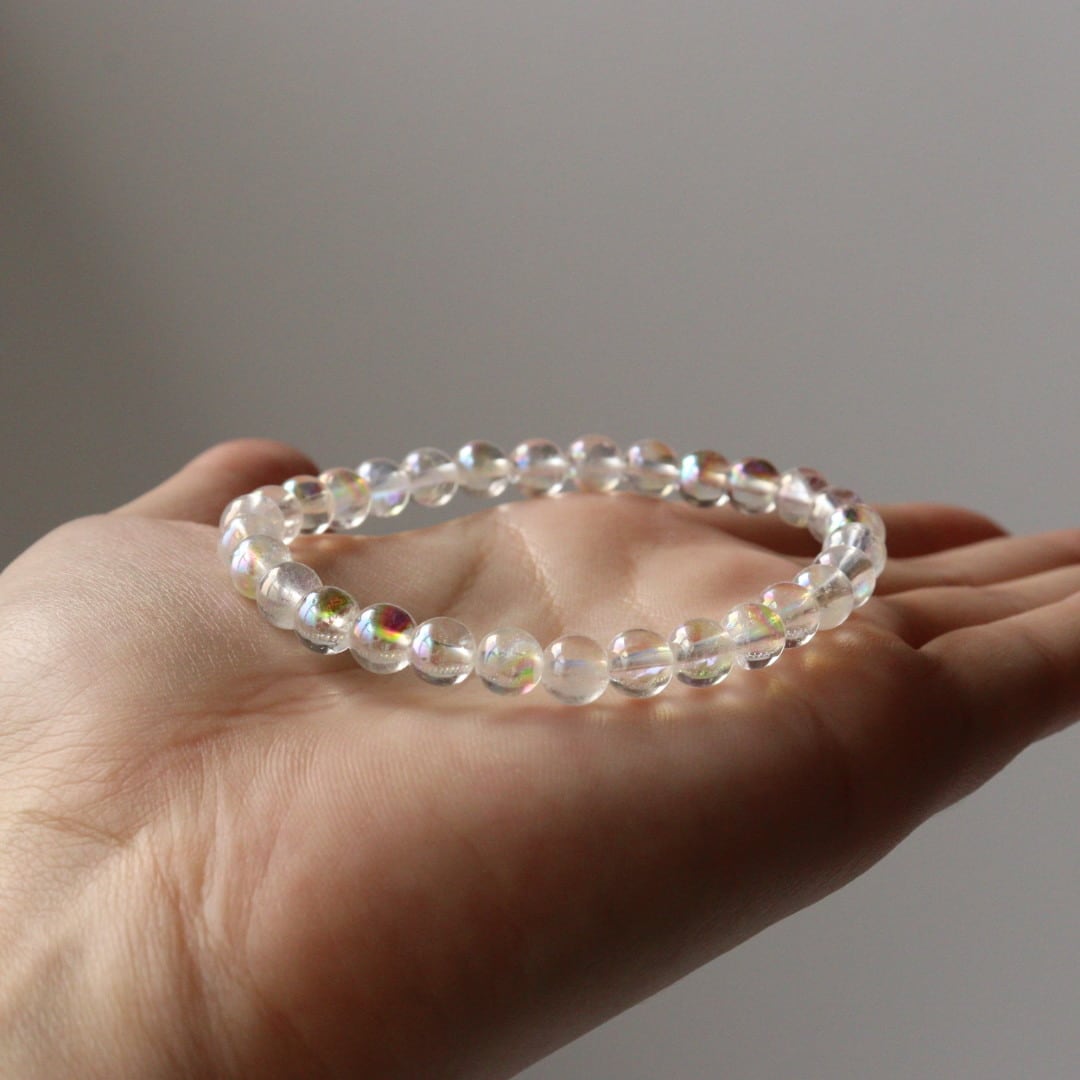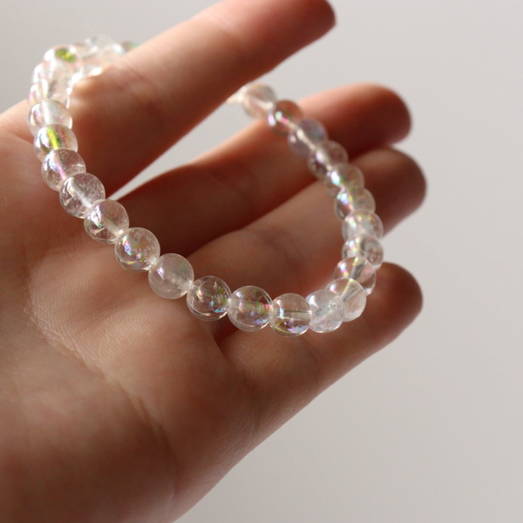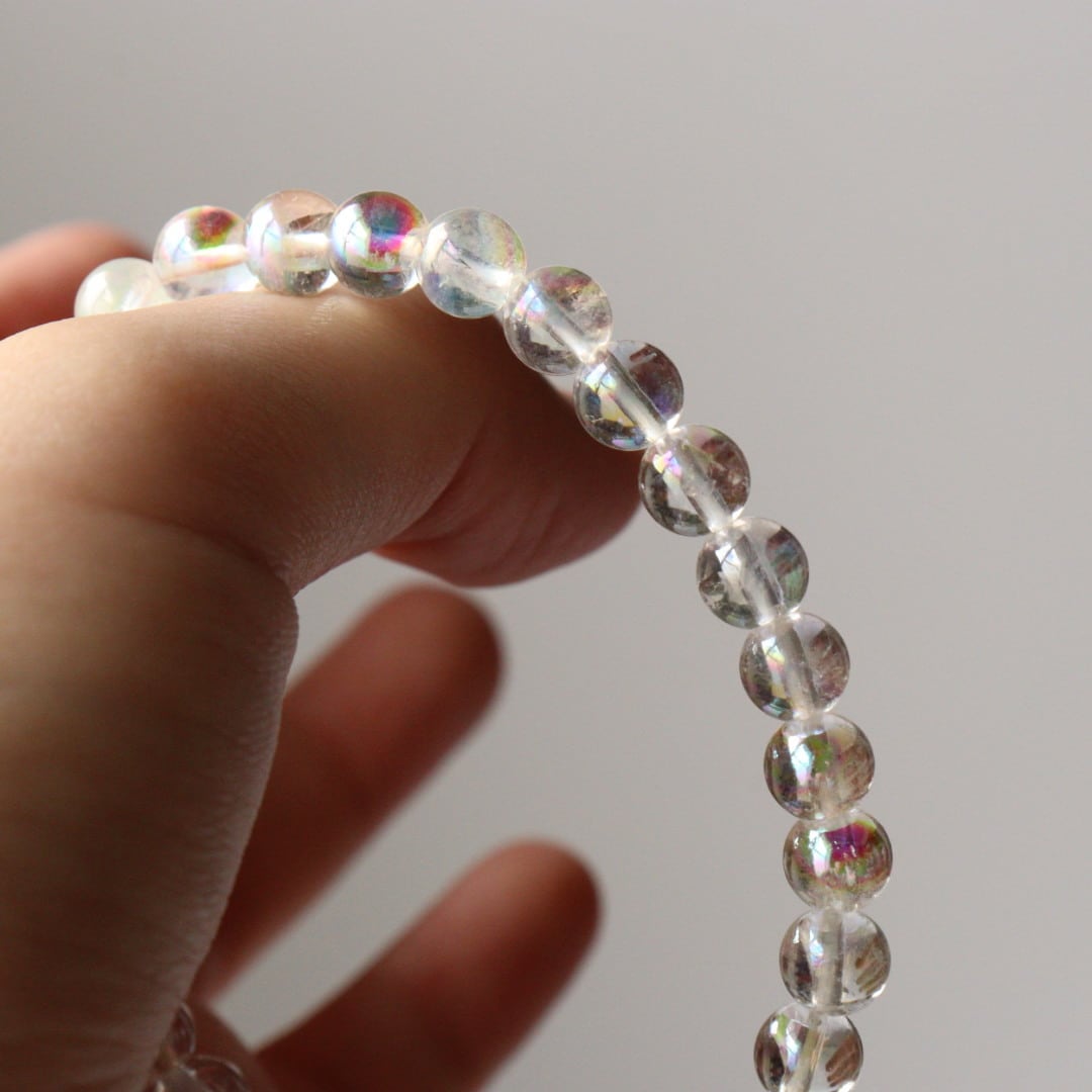 こちらは、透明なクリアクォーツの美しさに虹色の輝きが加わった、華やかで優雅なブレスレット。虹色のプリズムを纏ったエンジェルオーラのビースです。