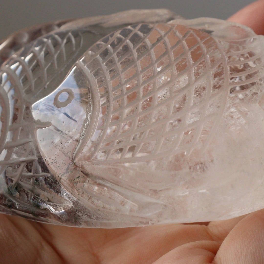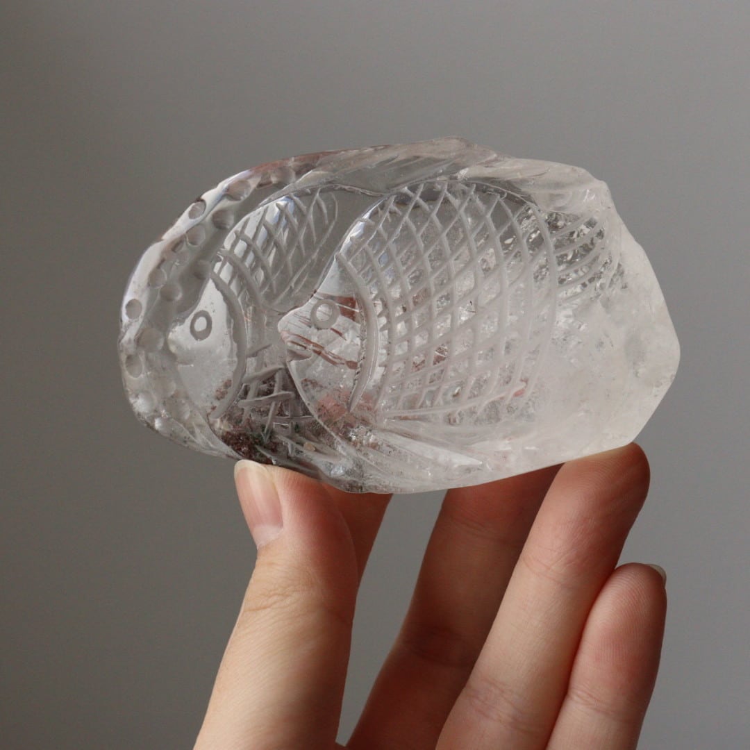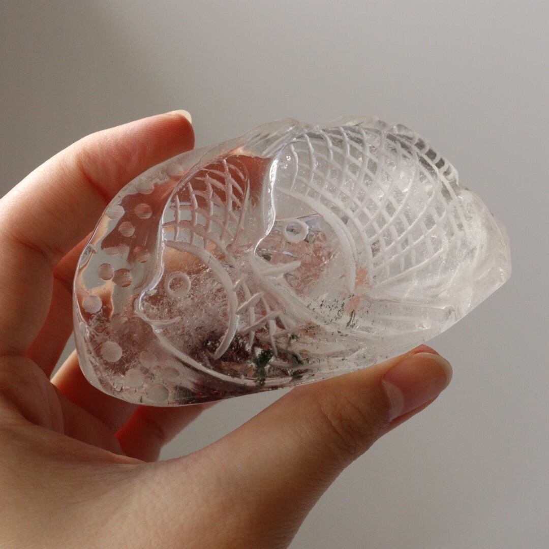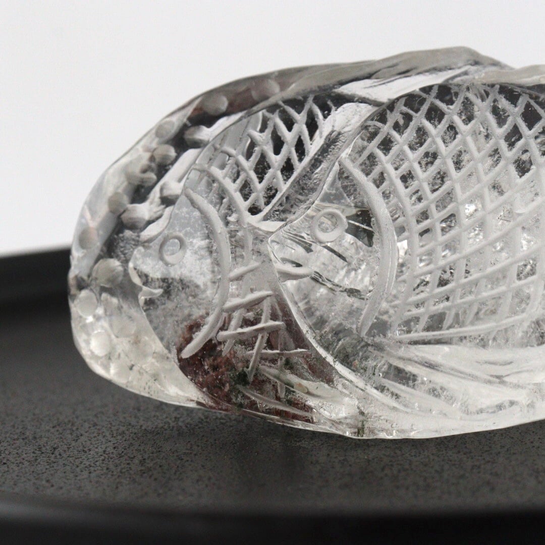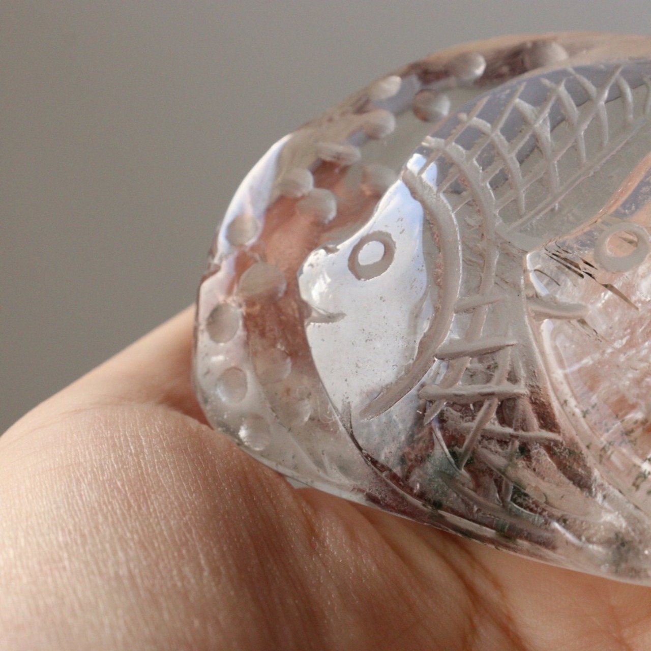 こちらは、透明度の高いクリアクォーツの中に広がるガーデン模様が美しい二匹のさかなのカービング。