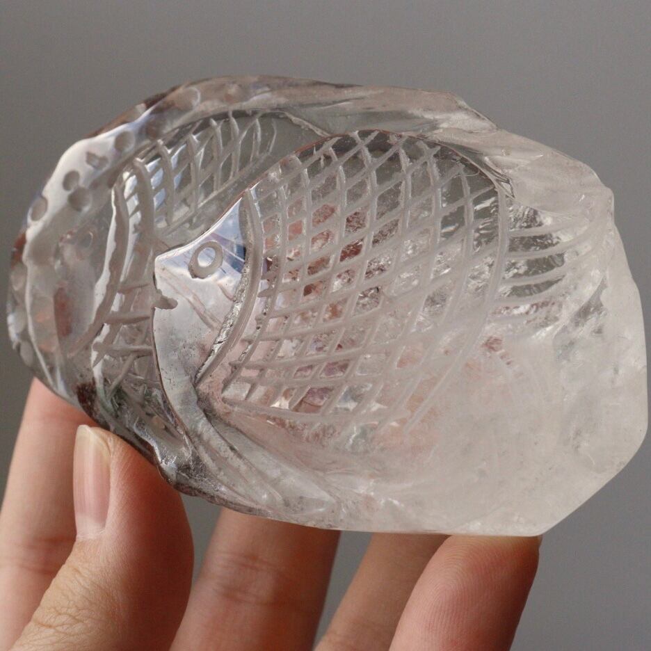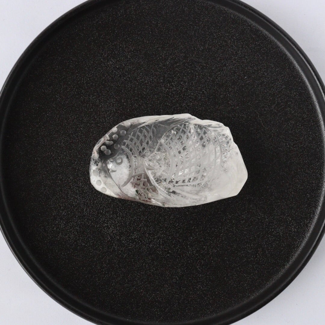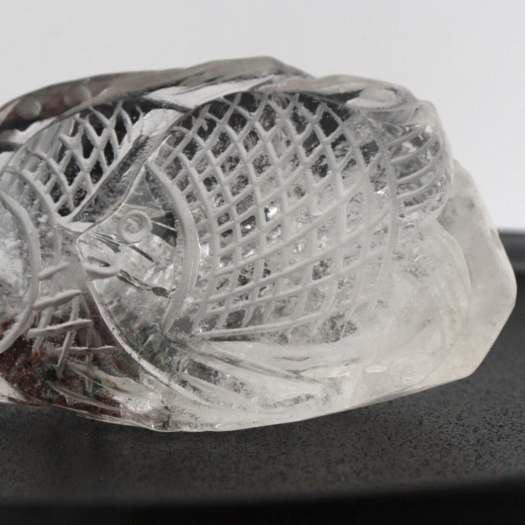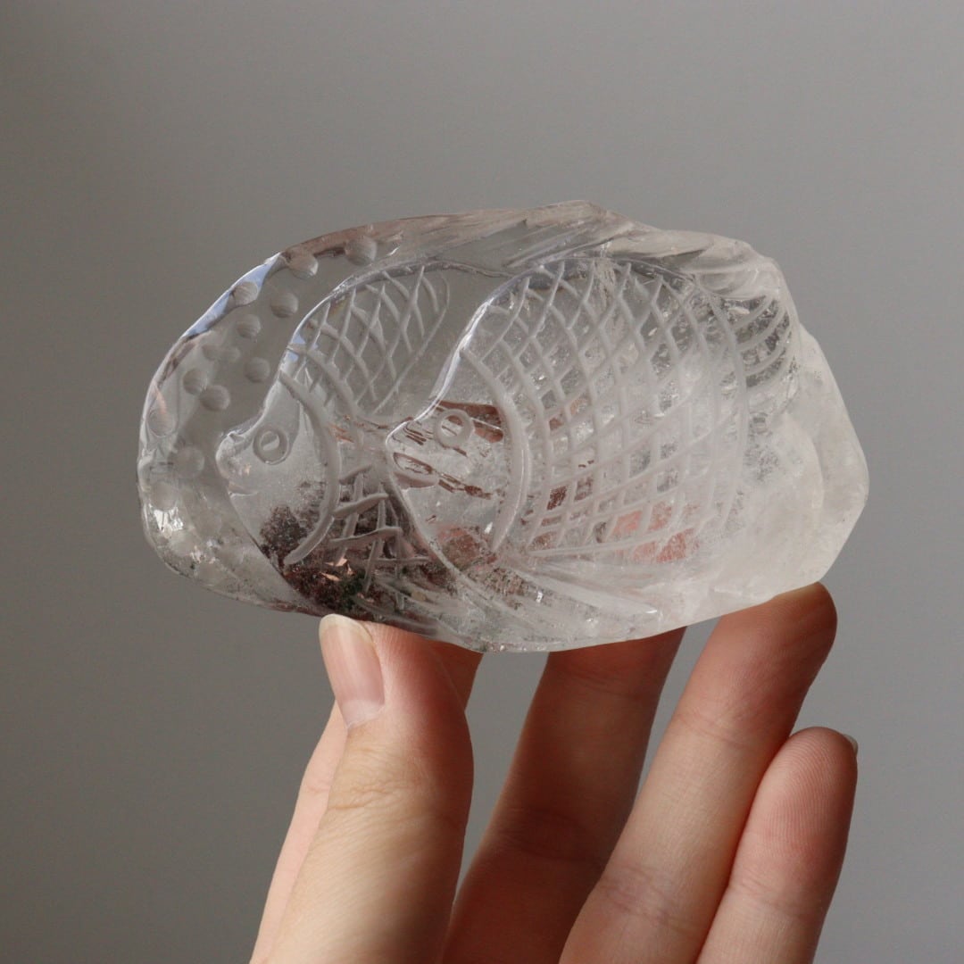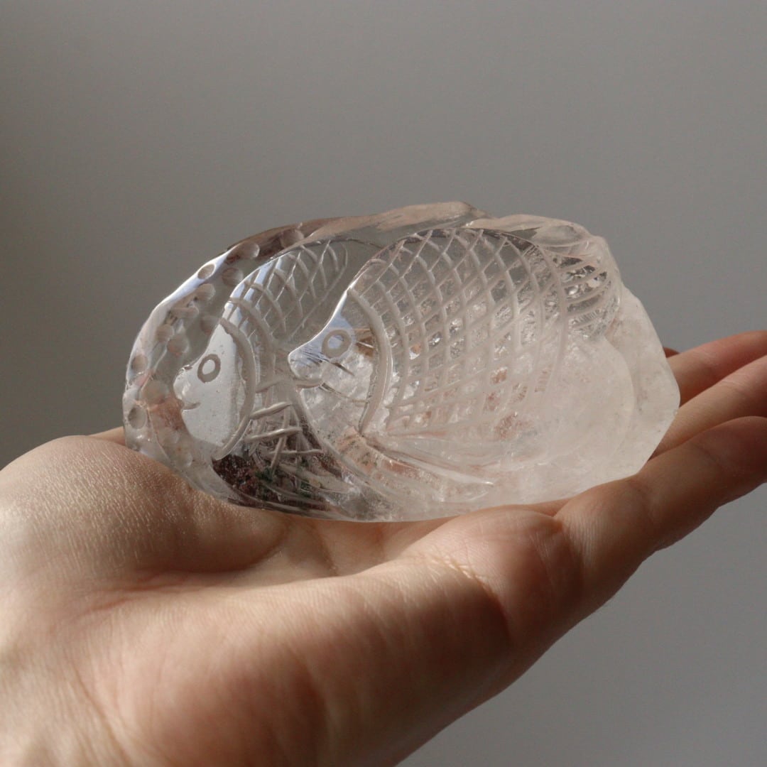 こちらは、透明度の高いクリアクォーツの中に広がるガーデン模様が美しい二匹のさかなのカービング。