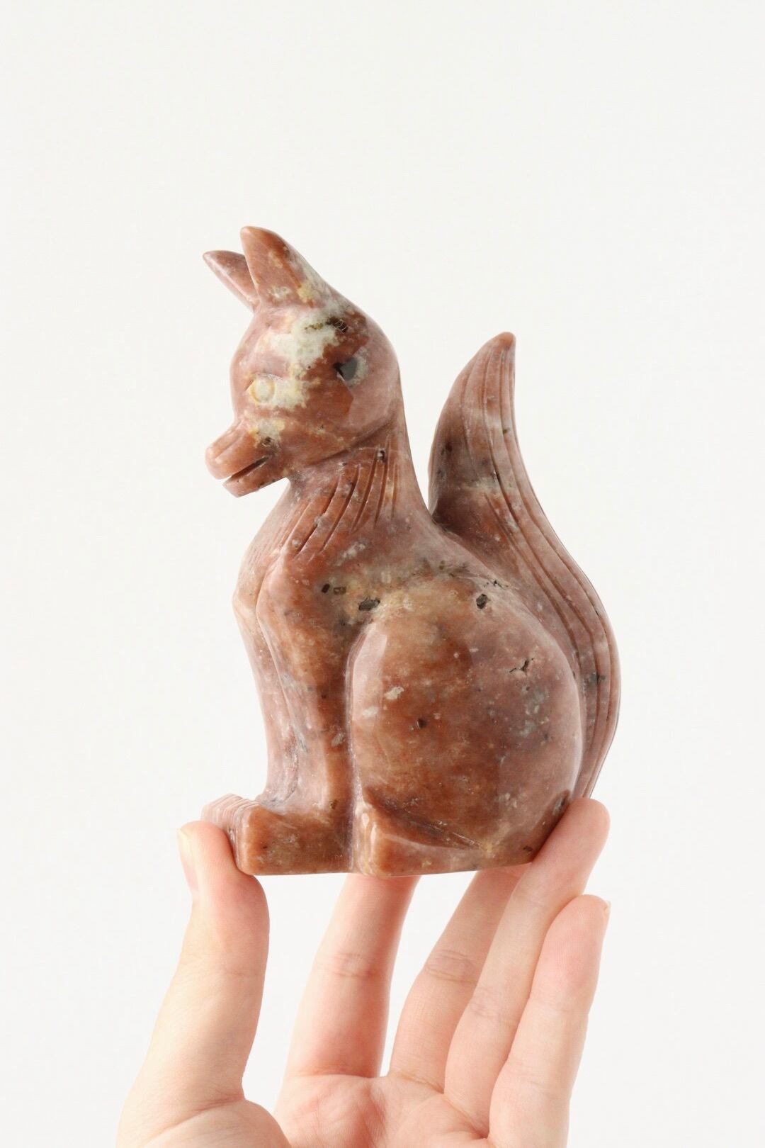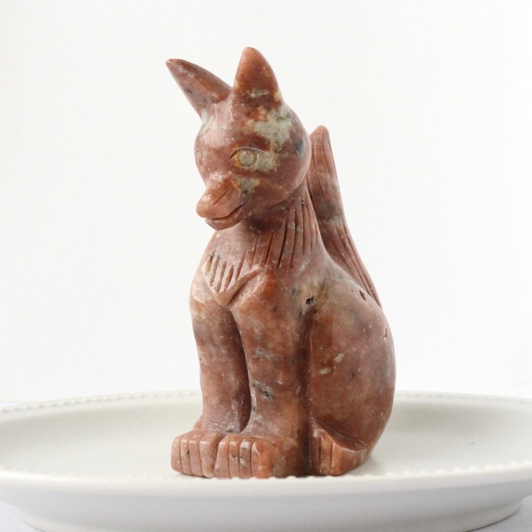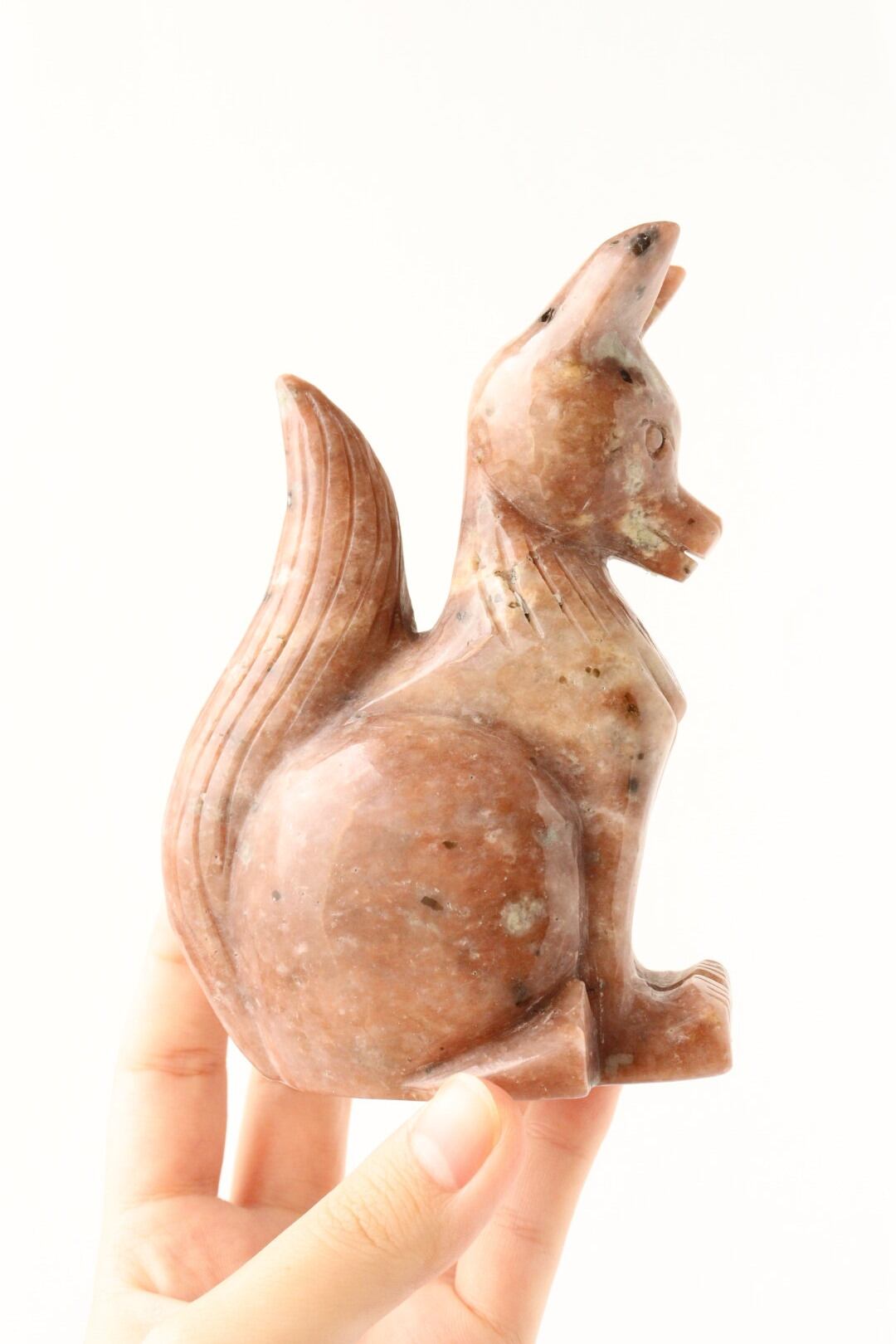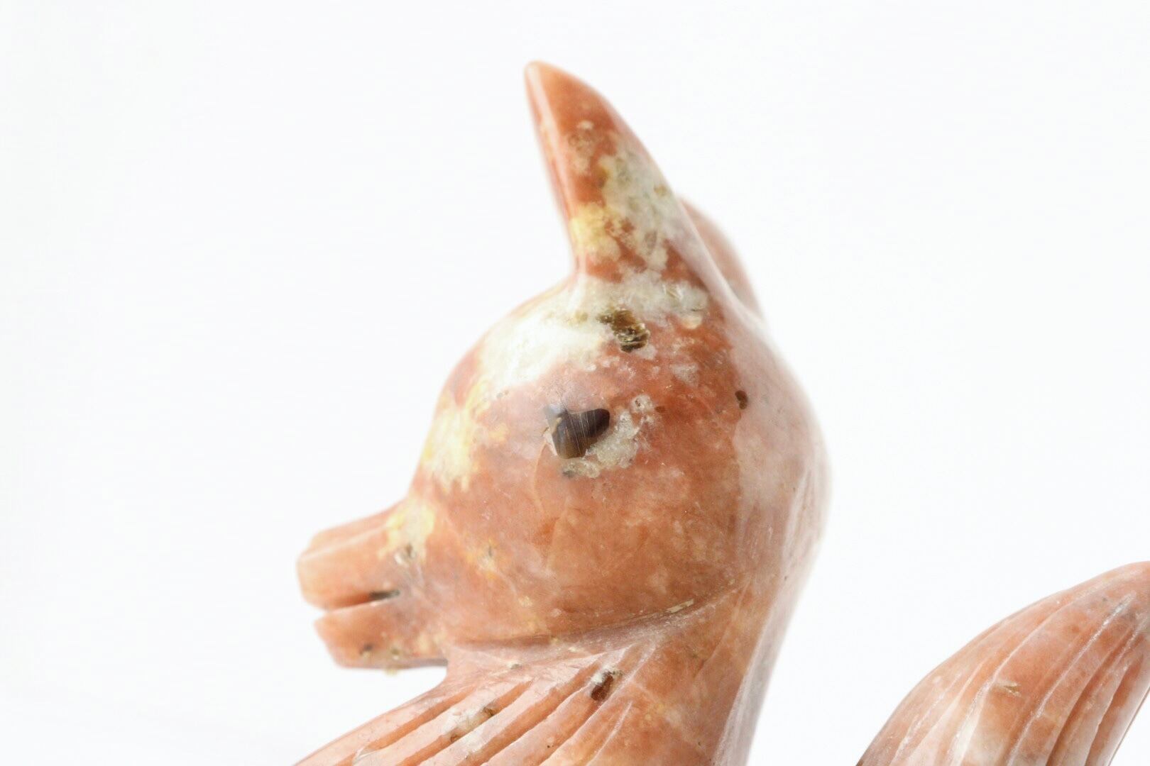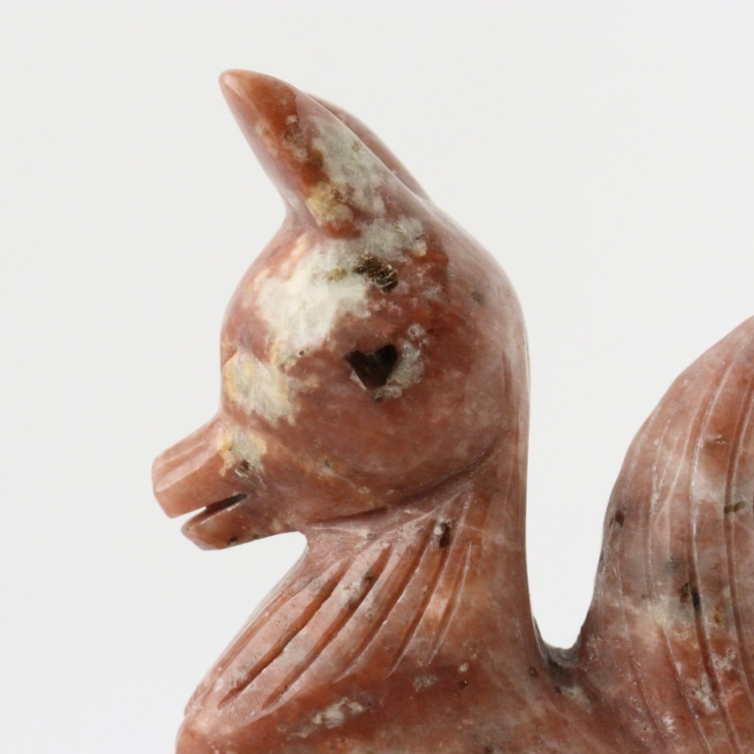 こちらは、淡い赤の層が柔らかく重なり、ところどころに深い緑のエピドートが入り込んだ表情豊かなキツネのカービングです。