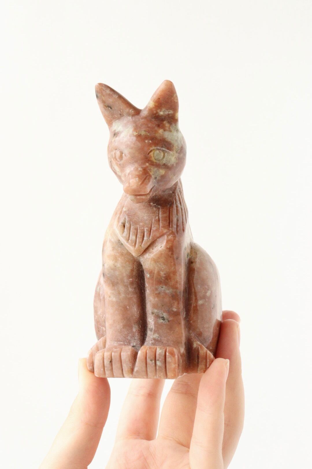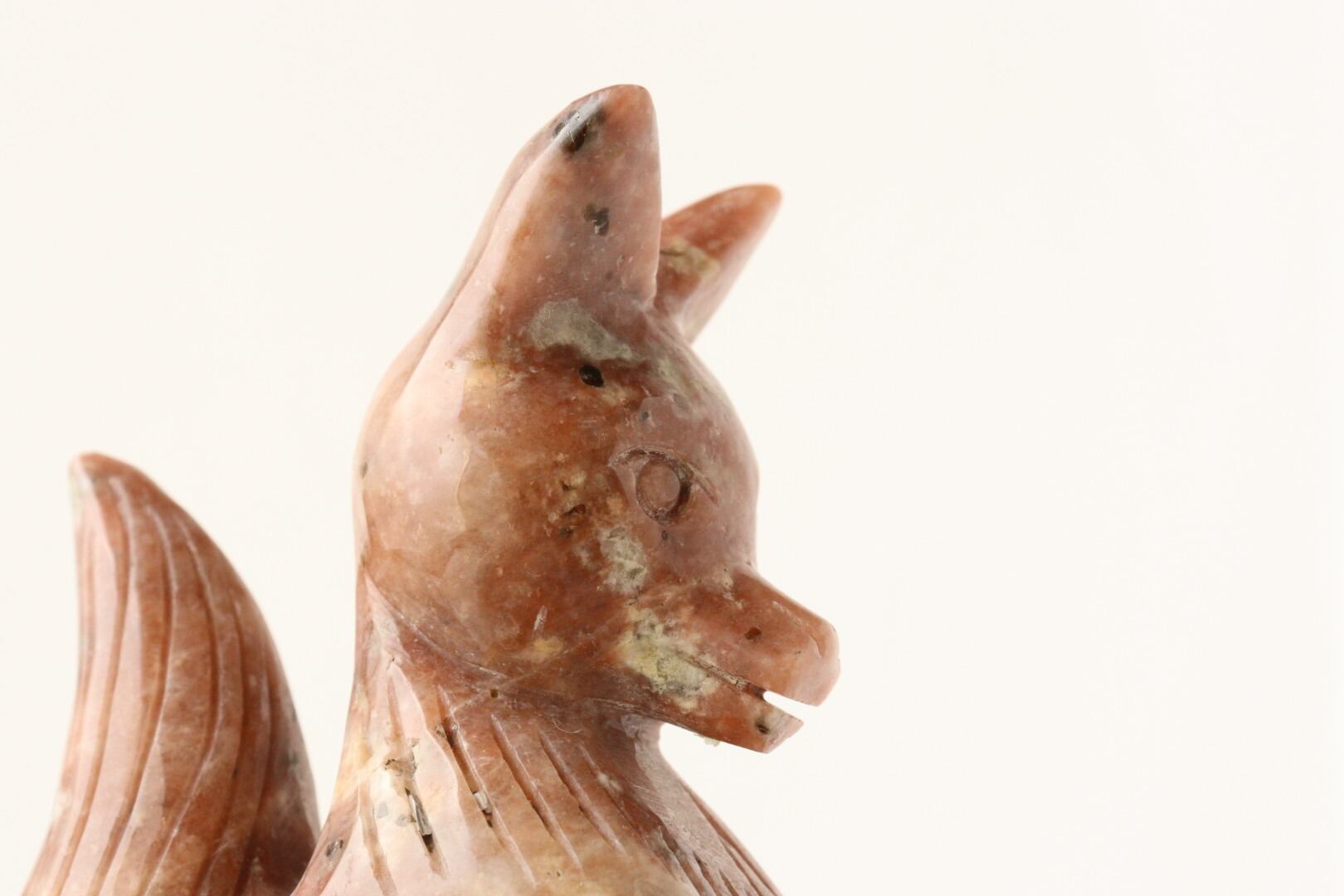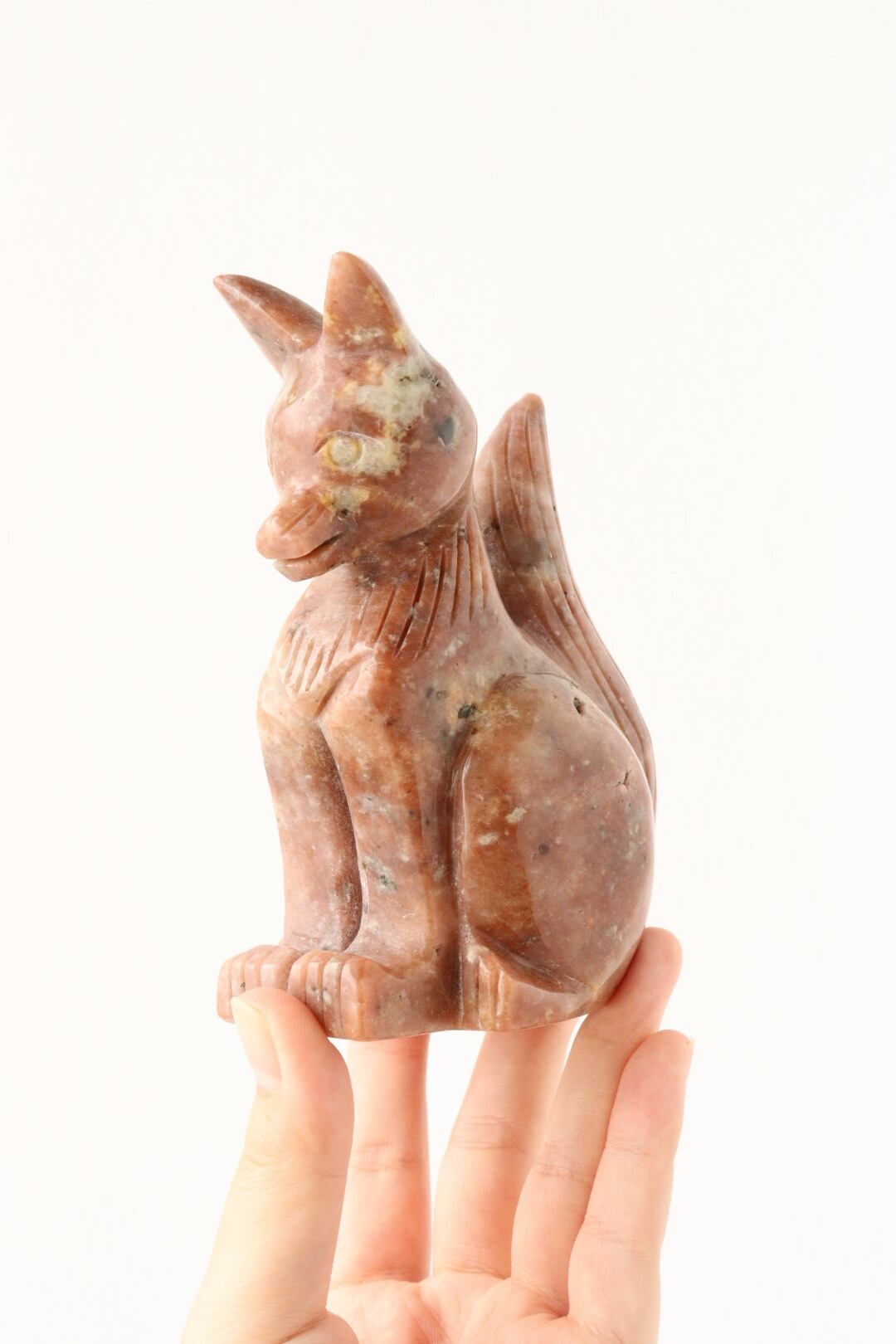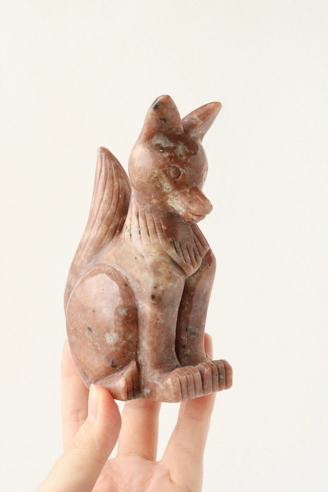 こちらは、淡い赤の層が柔らかく重なり、ところどころに深い緑のエピドートが入り込んだ表情豊かなキツネのカービングです。