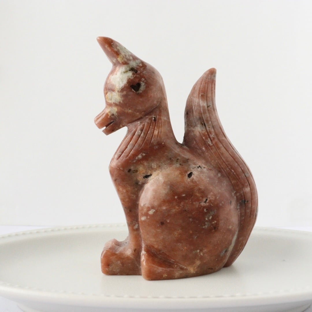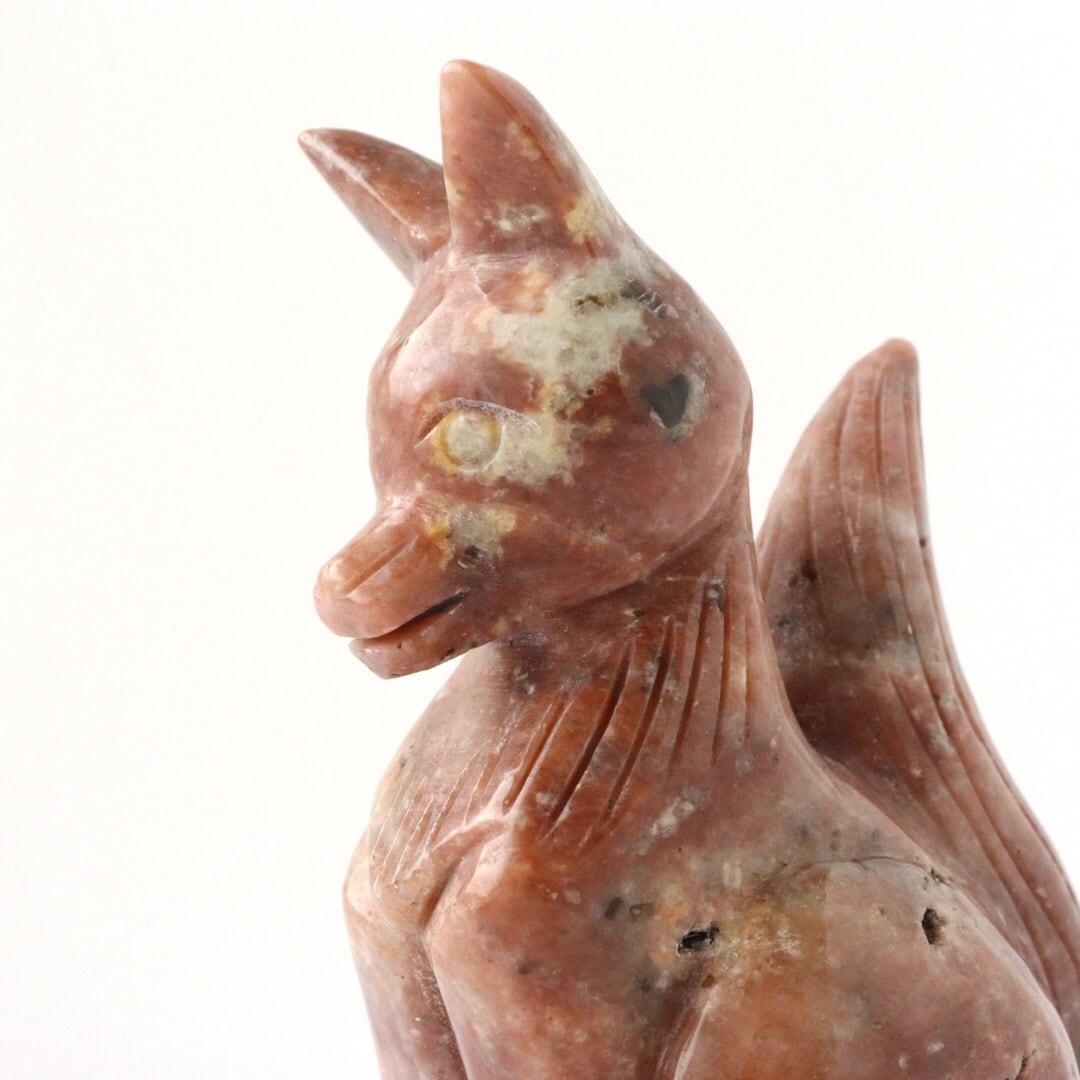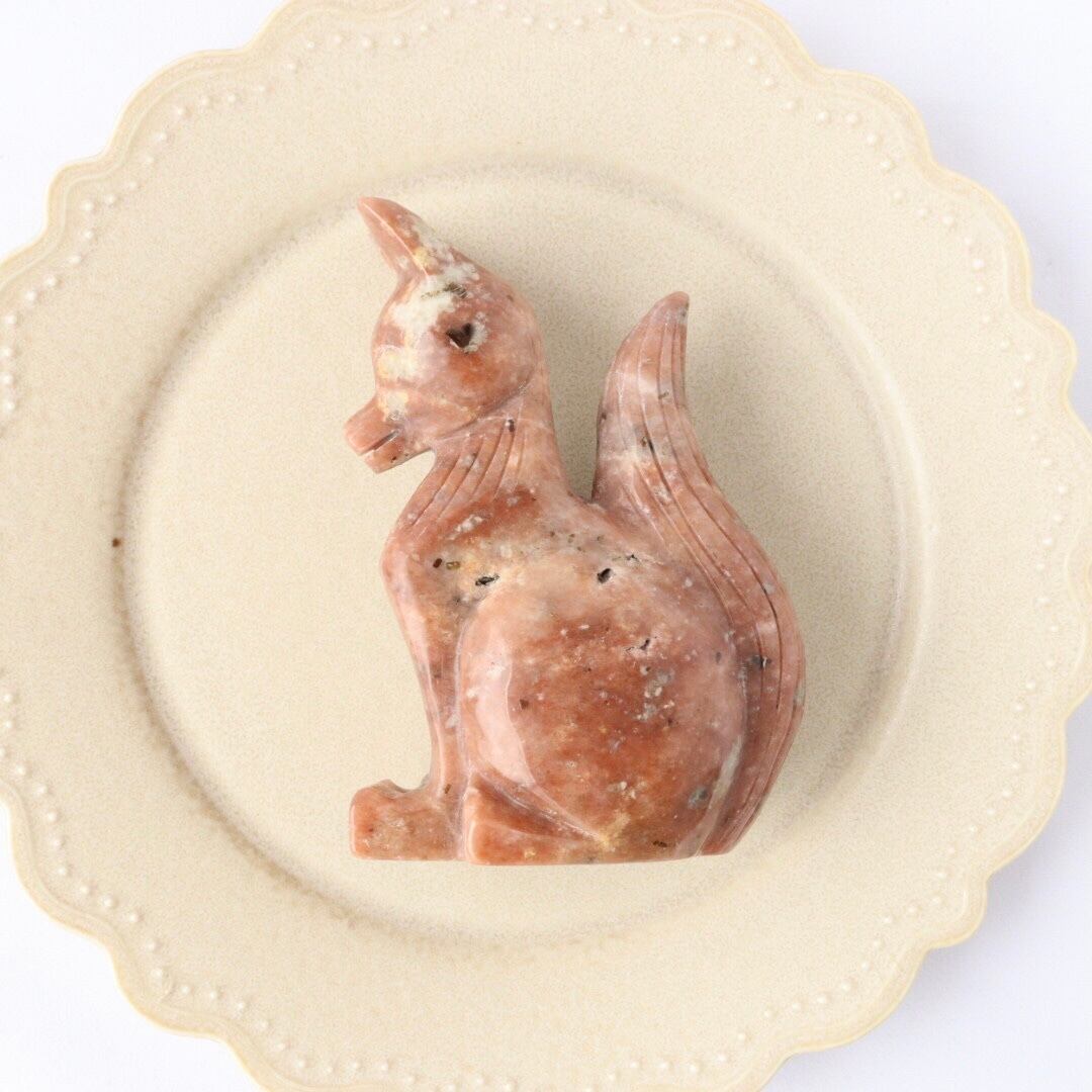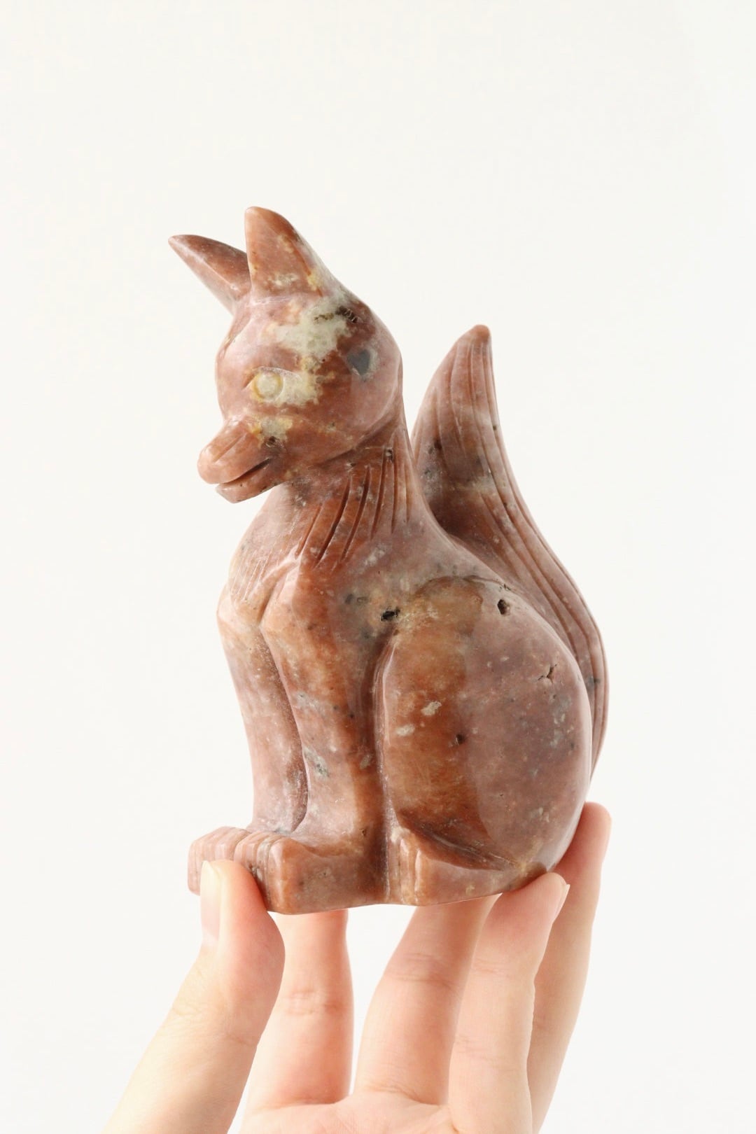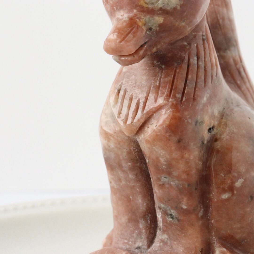こちらは、淡い赤の層が柔らかく重なり、ところどころに深い緑のエピドートが入り込んだ表情豊かなキツネのカービングです。