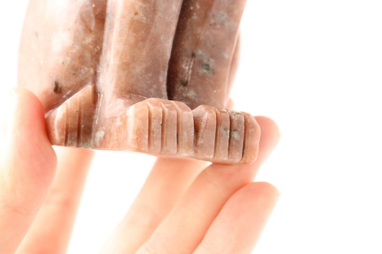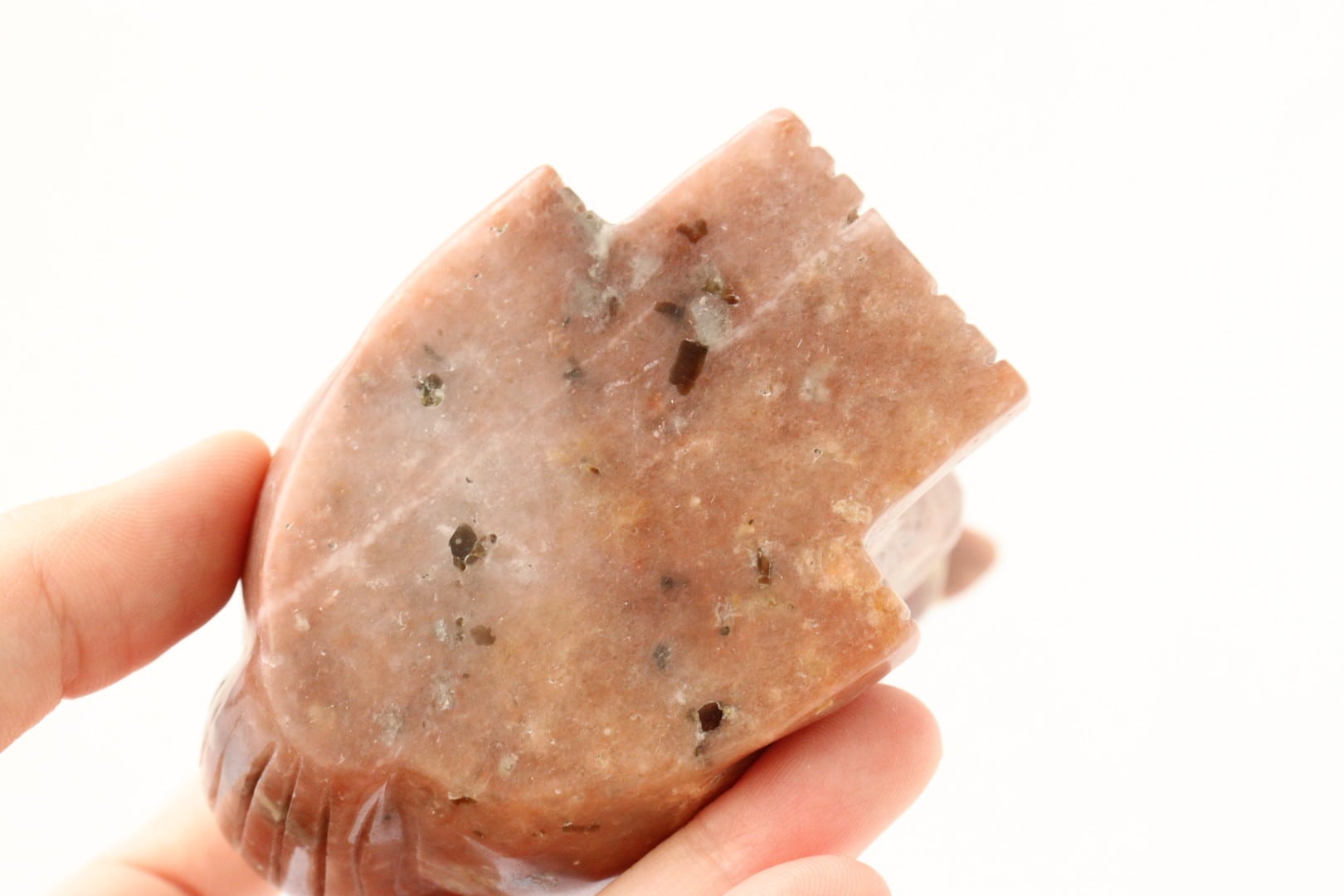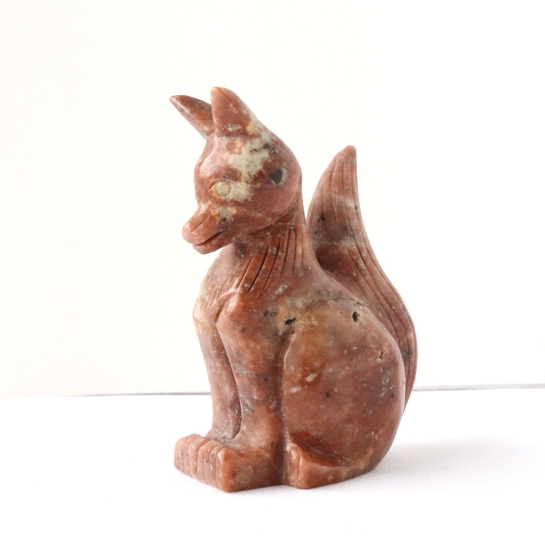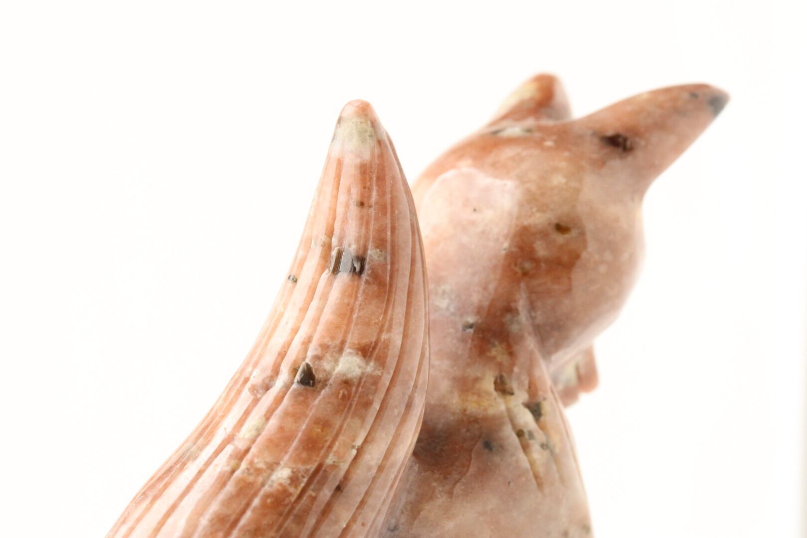 こちらは、淡い赤の層が柔らかく重なり、ところどころに深い緑のエピドートが入り込んだ表情豊かなキツネのカービングです。