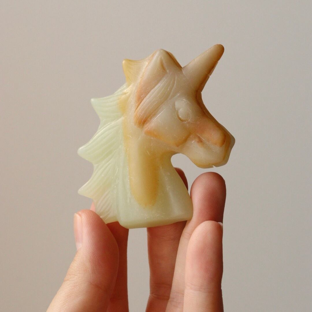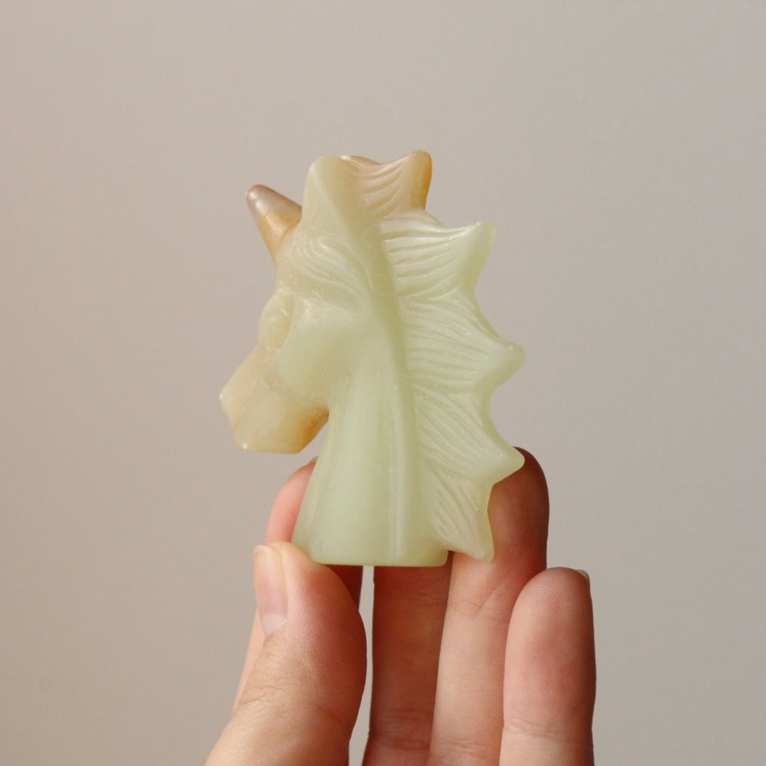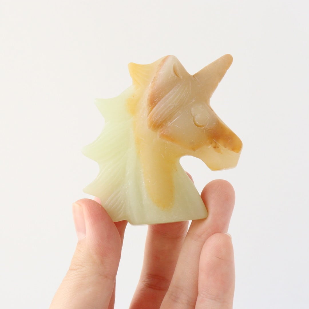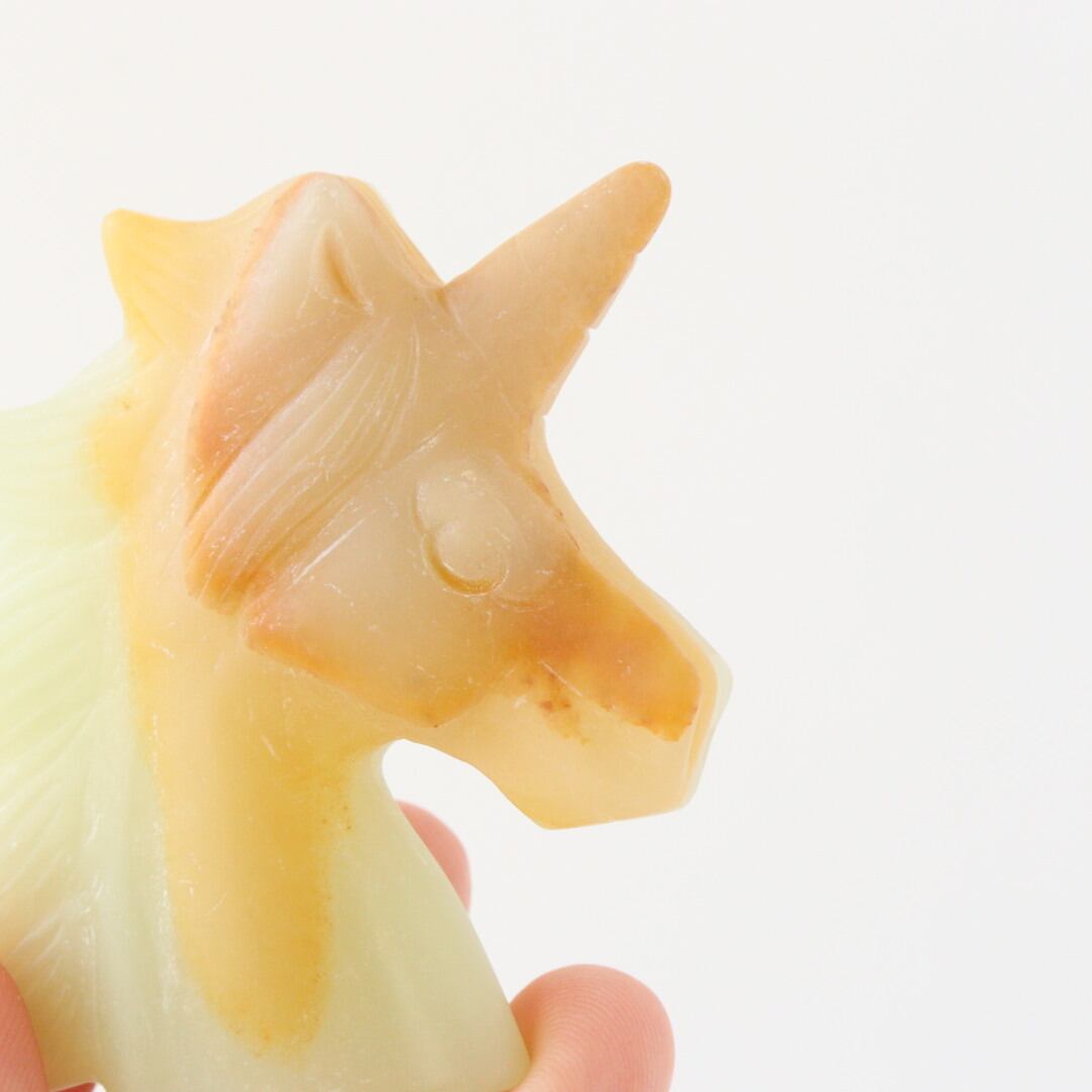 こちらは、淡いイエローグリーンと自然なオレンジが溶け合い、柔らかな姿で佇むユニコーンのカービング。