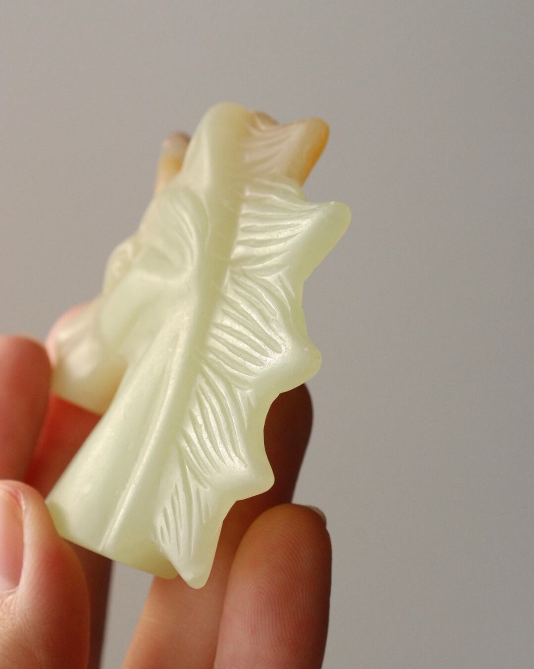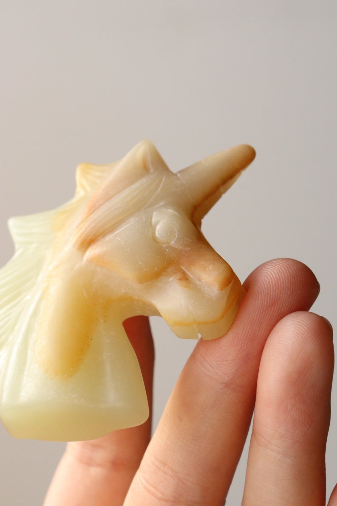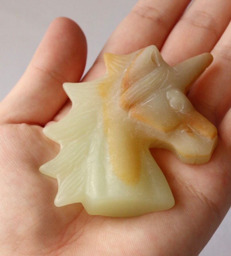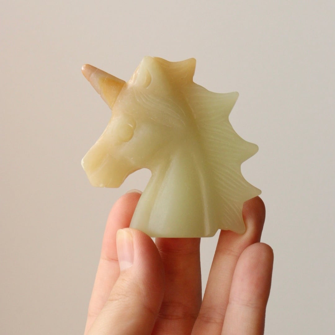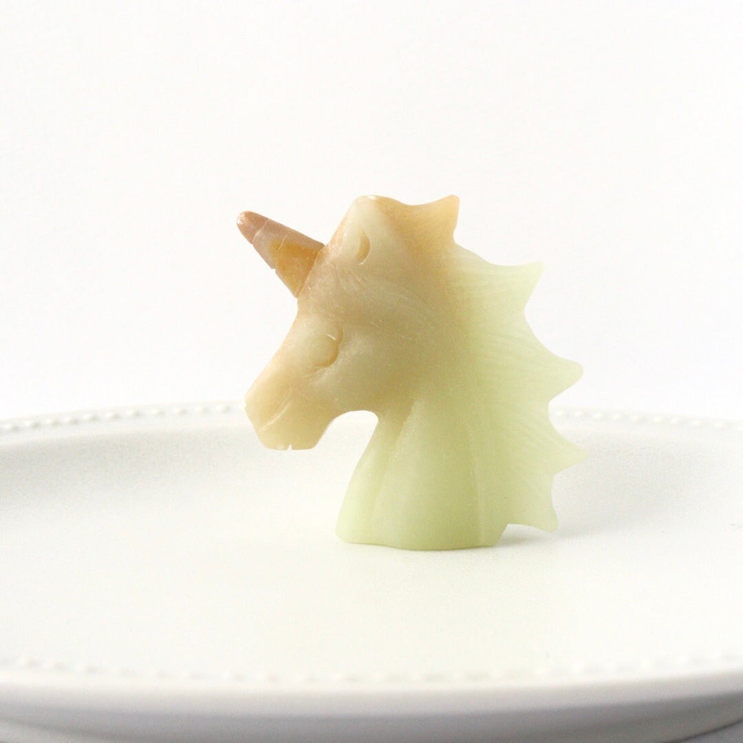 こちらは、淡いイエローグリーンと自然なオレンジが溶け合い、柔らかな姿で佇むユニコーンのカービング。