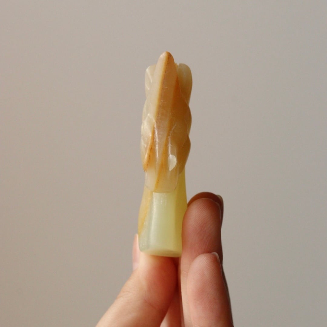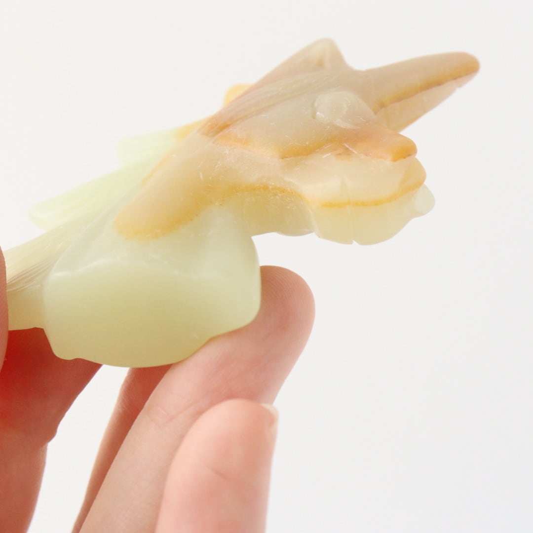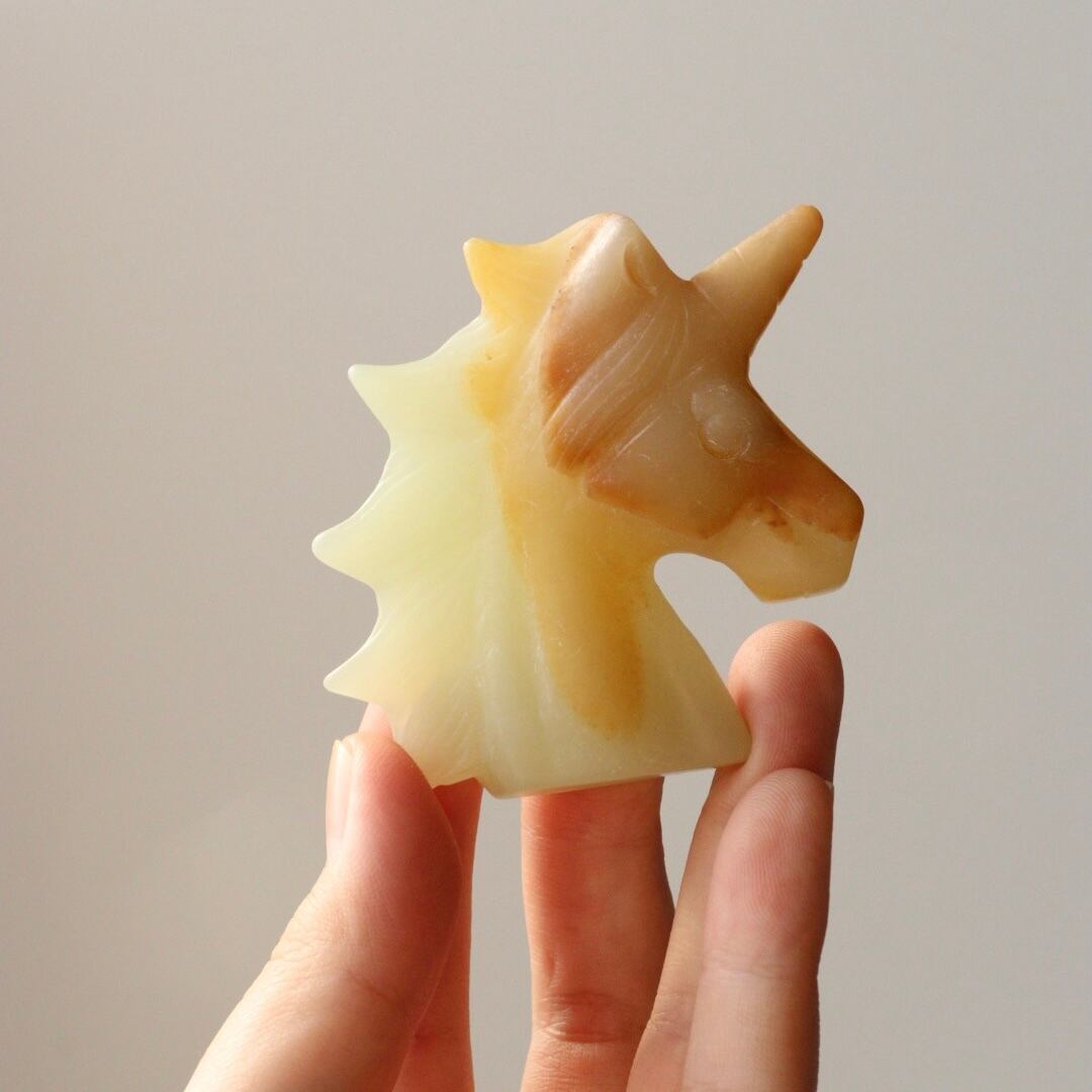 淡いイエローグリーンにほのかに滲むオレンジの色合いが魅力の、グリーンオニキスのユニコーン。角度によって柔らかい光をまとい、穏やかな気配が漂います。