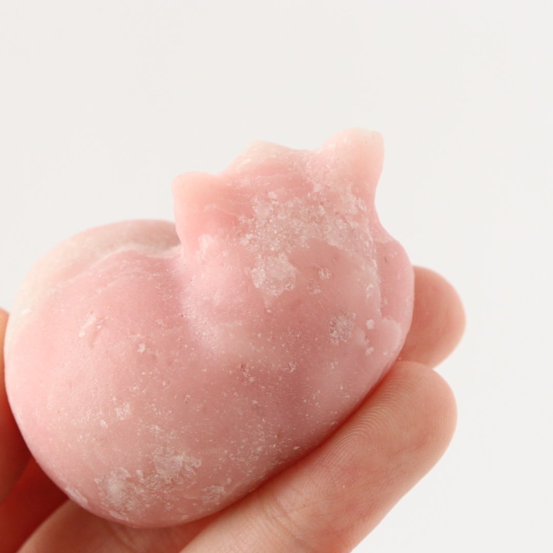 こちらは、ホワイトインクルージョンが淡く入り込み、自然のままのやわらかい模様が美しく浮かび上がったピンクオパール。柔らかな毛布にぬくぬくとくるまっているかのようなねこのリラックスした姿と、さらさらキラキラとしたピンクオパールの質感が魅力です。