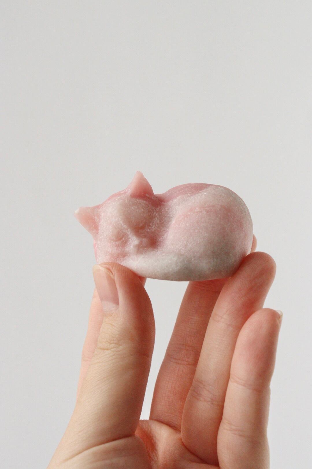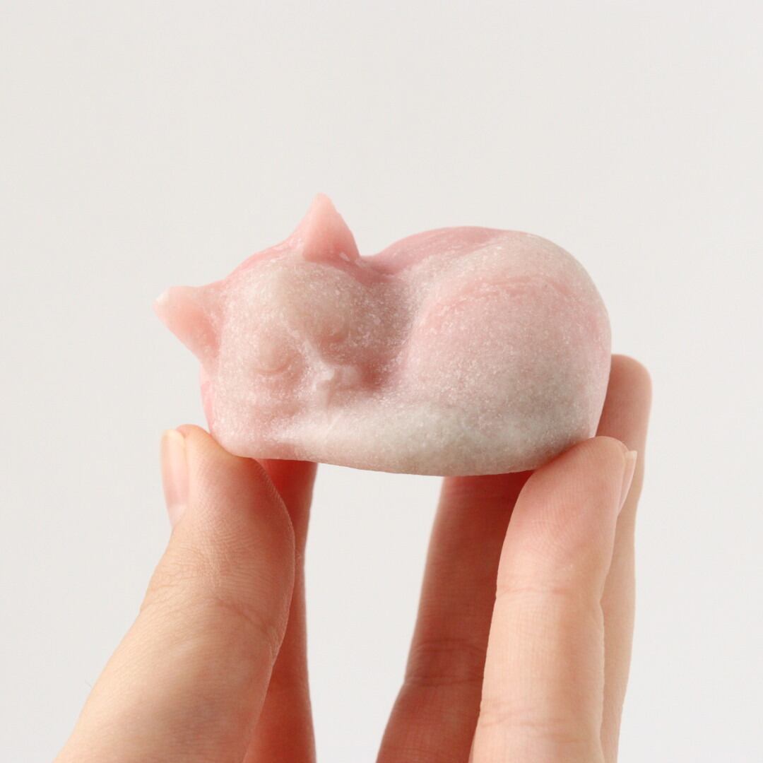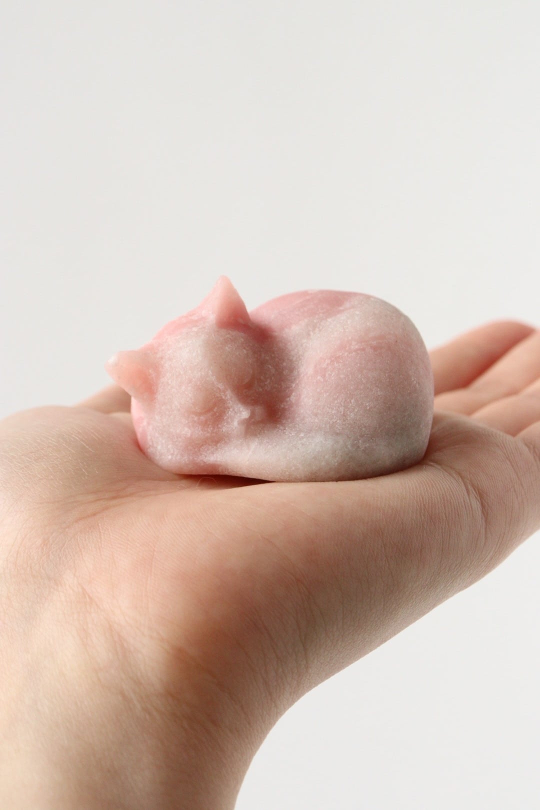 ふんわりとしたピンクとホワイトが柔らかく重なる、ピンクオパールの眠り猫。