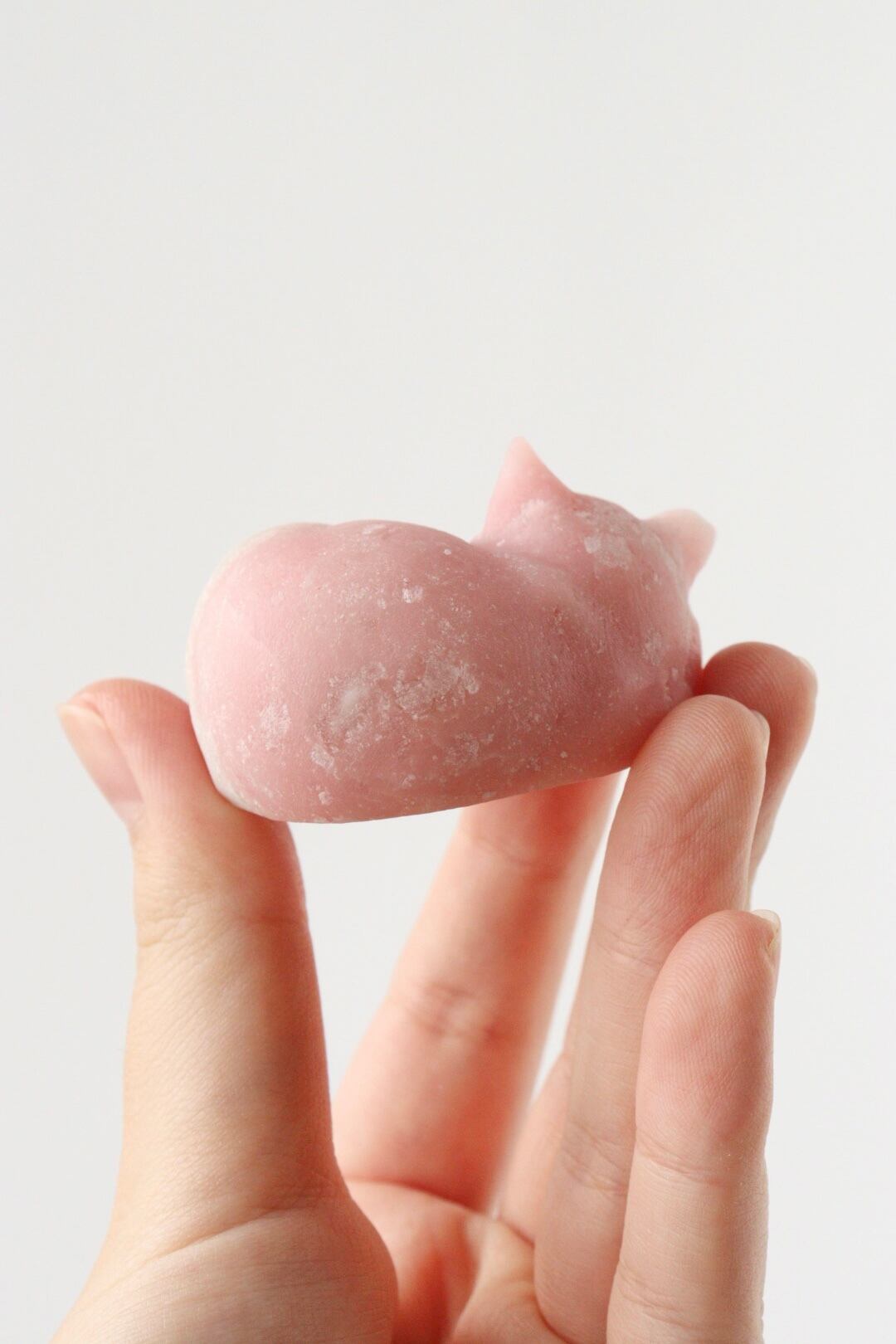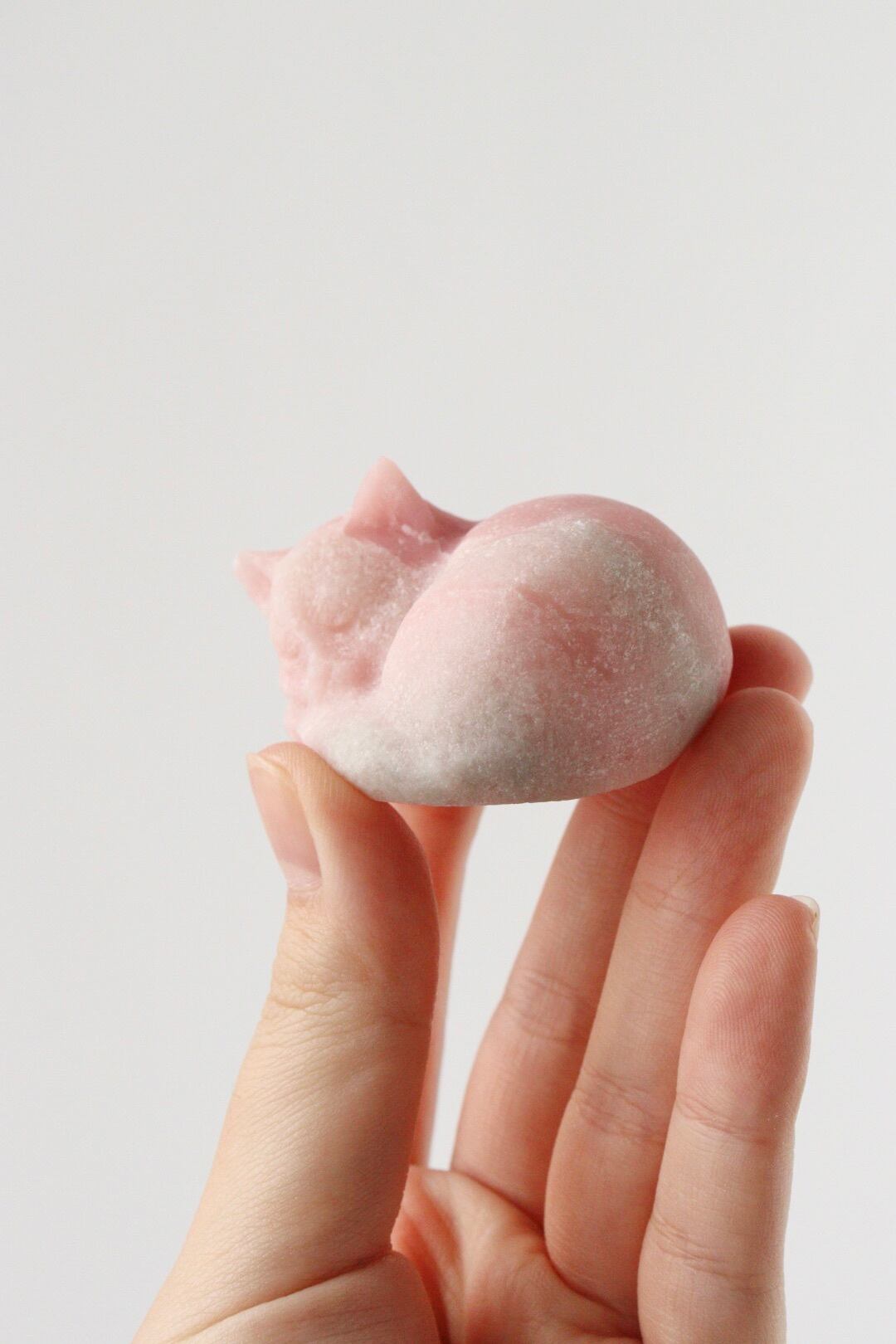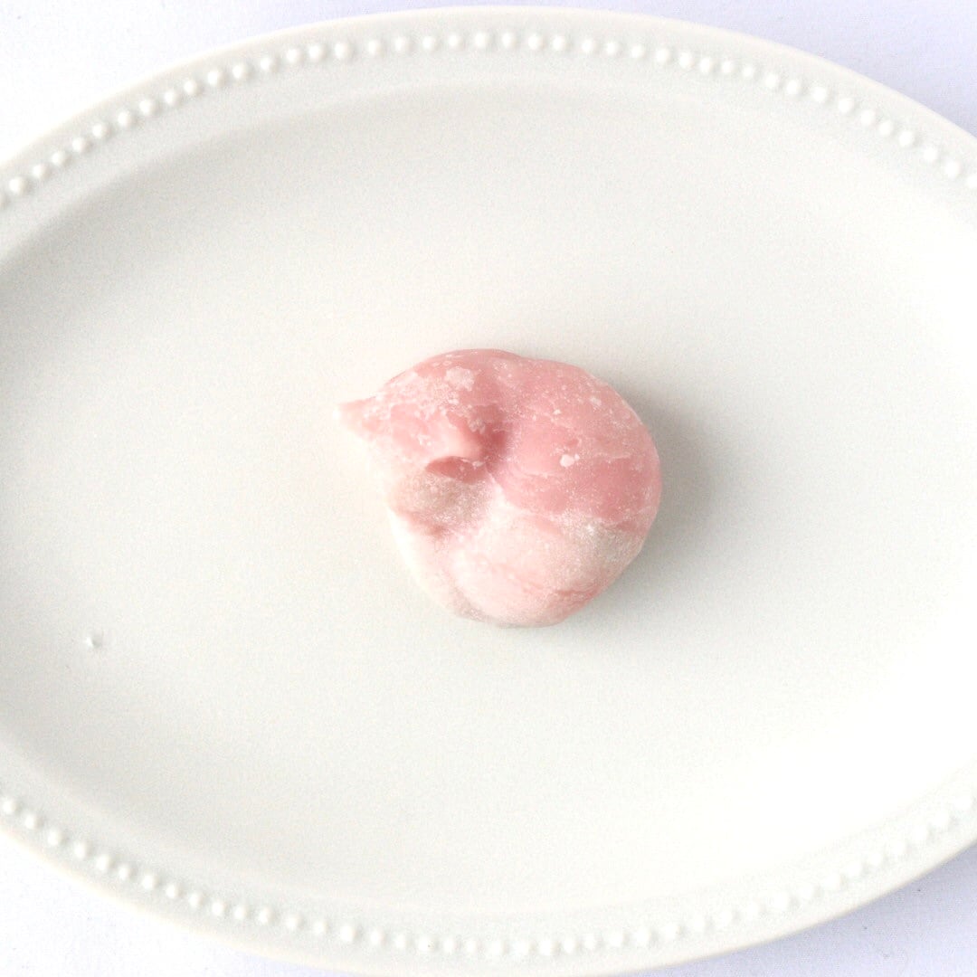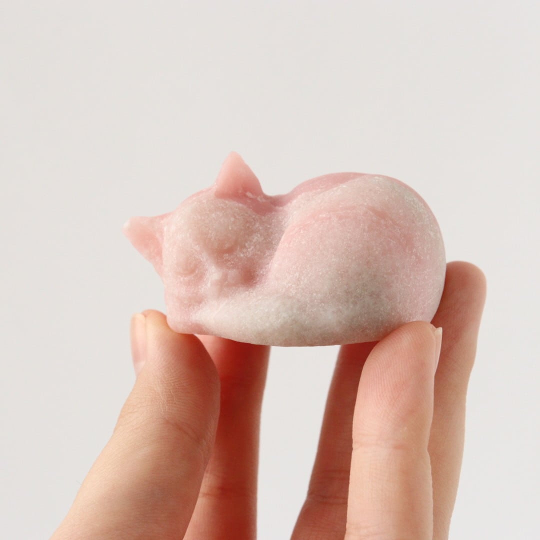 ふんわりとしたピンクとホワイトが柔らかく重なる、ピンクオパールの眠り猫。