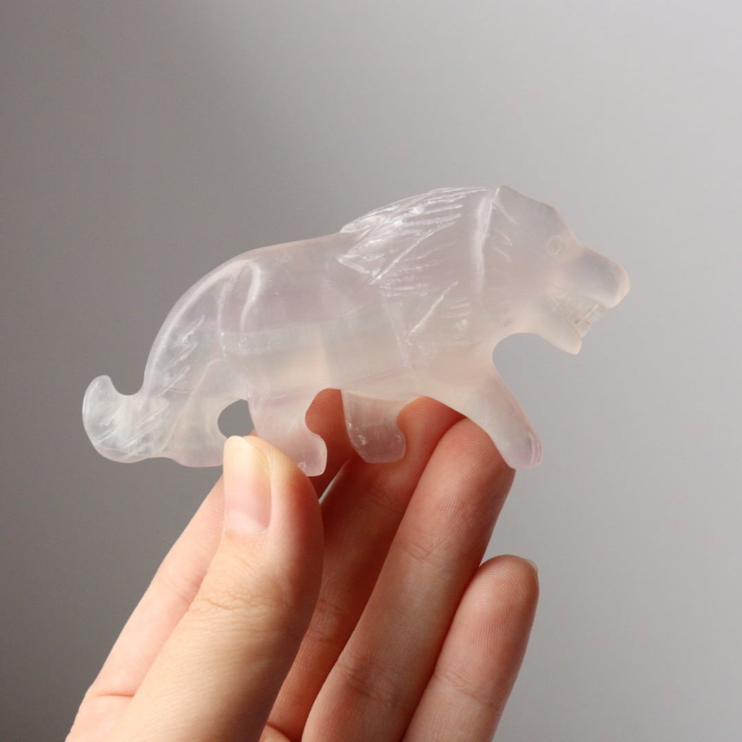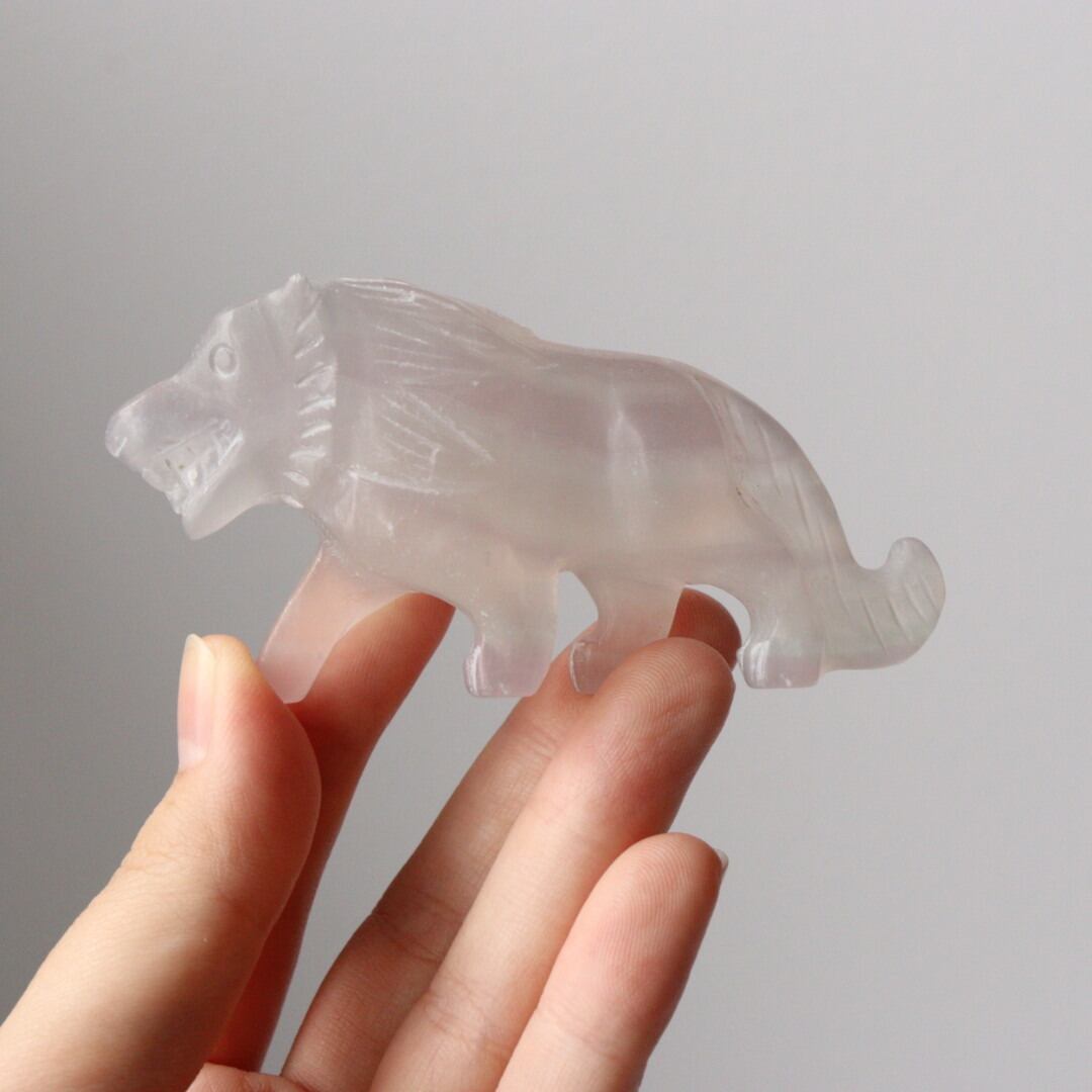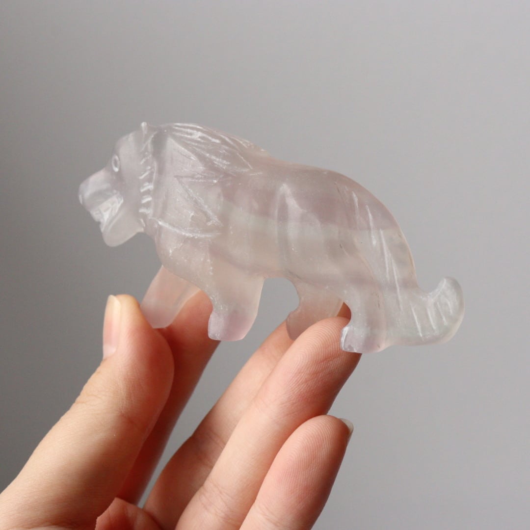 光を透過する美しい薄紫が美しい、パープルフローライトのライオン。
