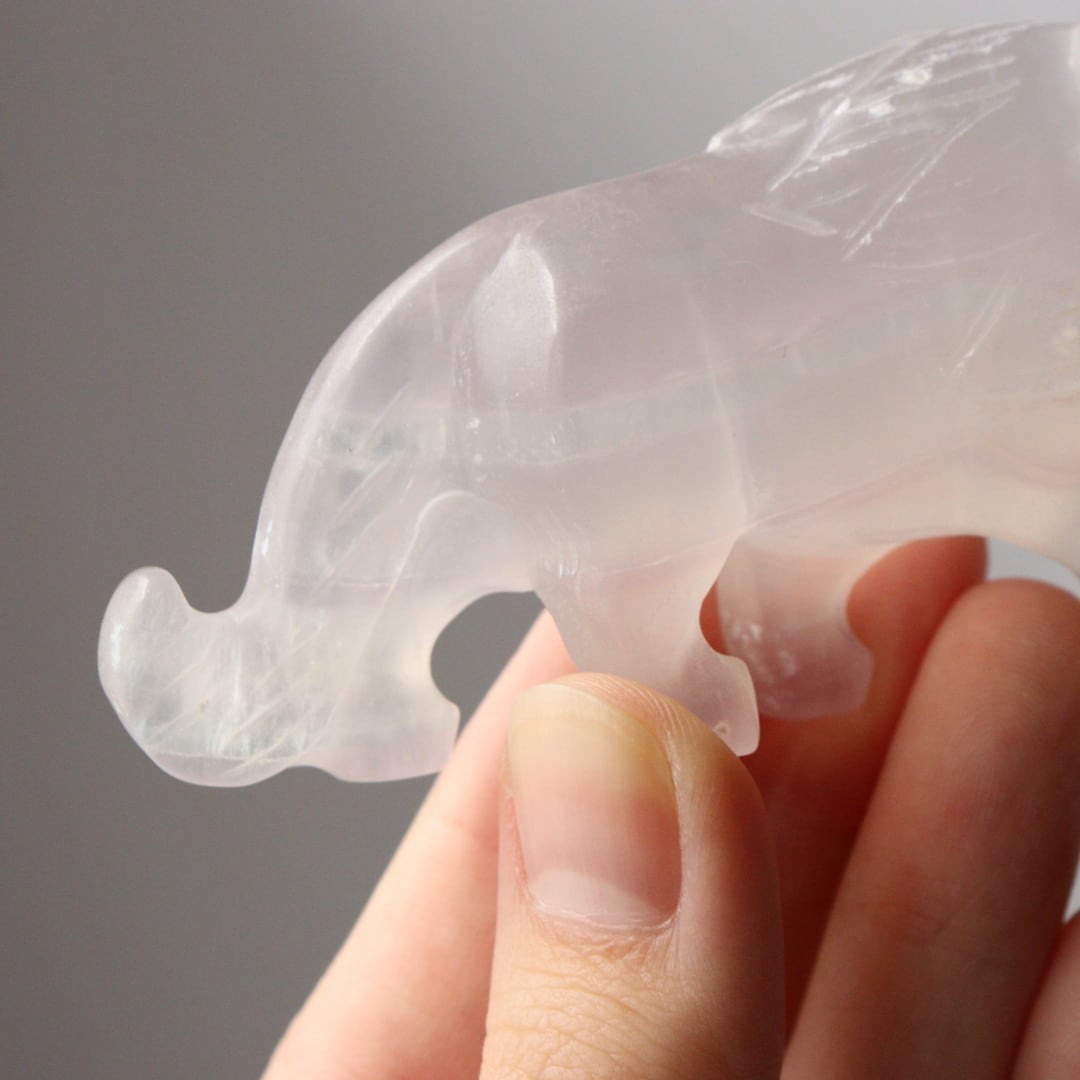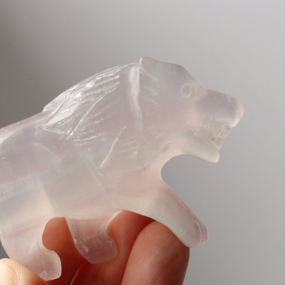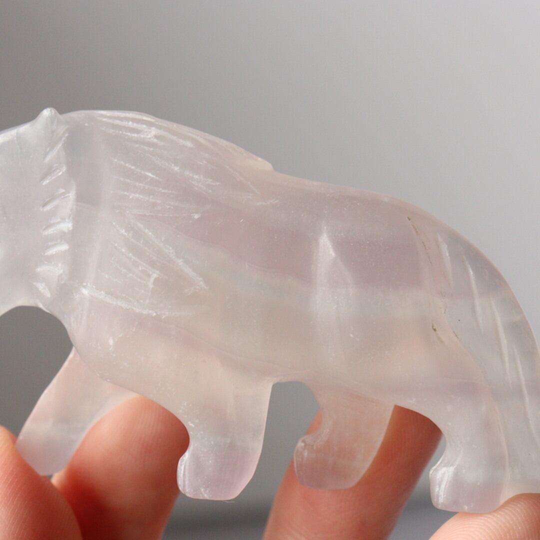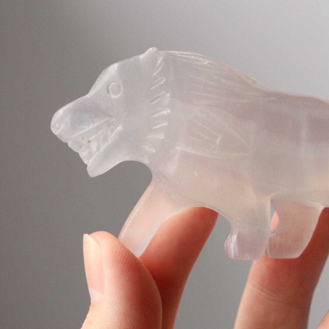 光を透過する美しい薄紫が美しい、パープルフローライトのライオン。