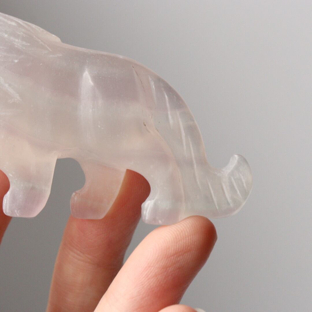 クリアな部分と紫の発色が角度によって異なる表情を見せ、眺める時間が楽しくなるようなライオンです。勇ましさと可愛らしさが同居した、味わい深いフローライトをお楽しみください。