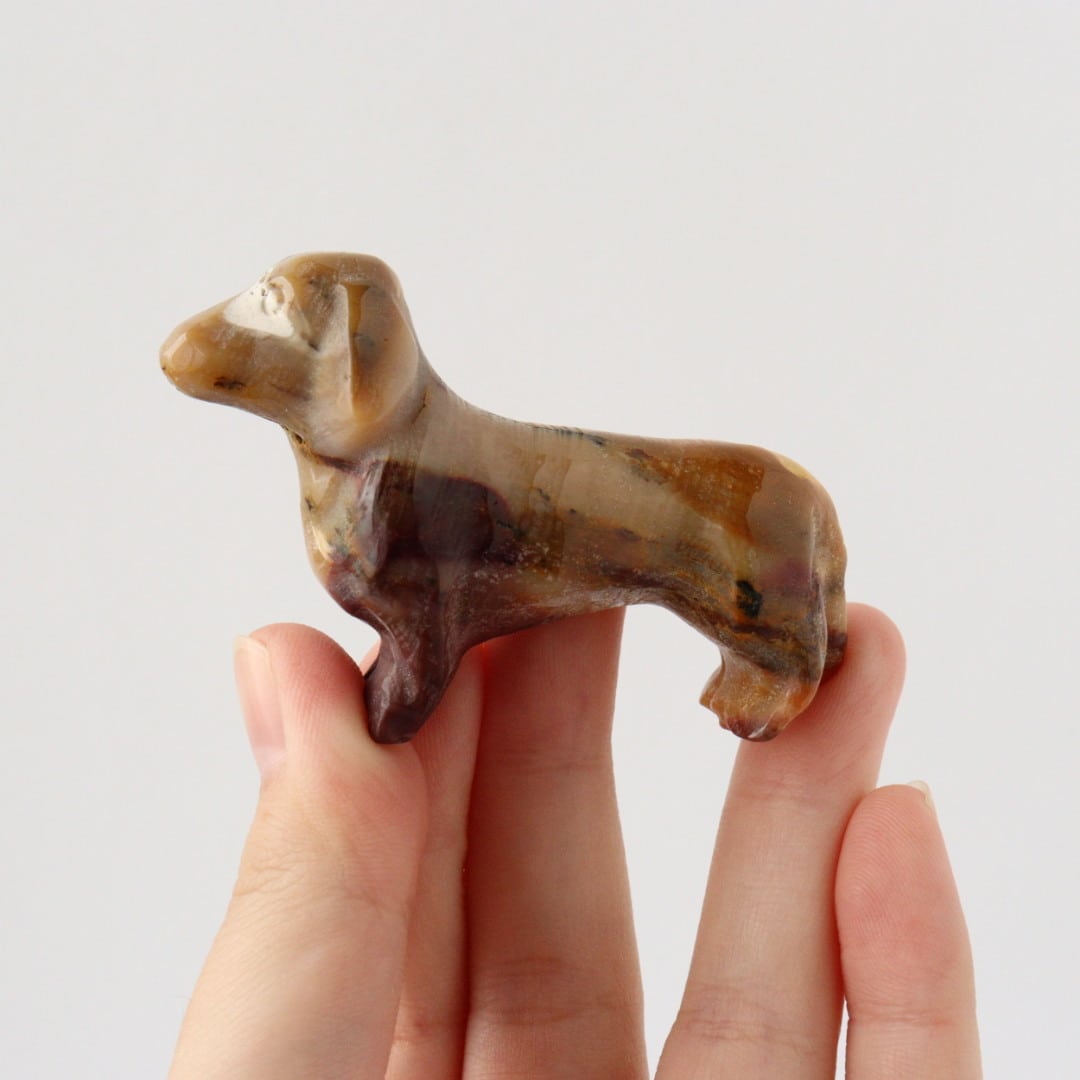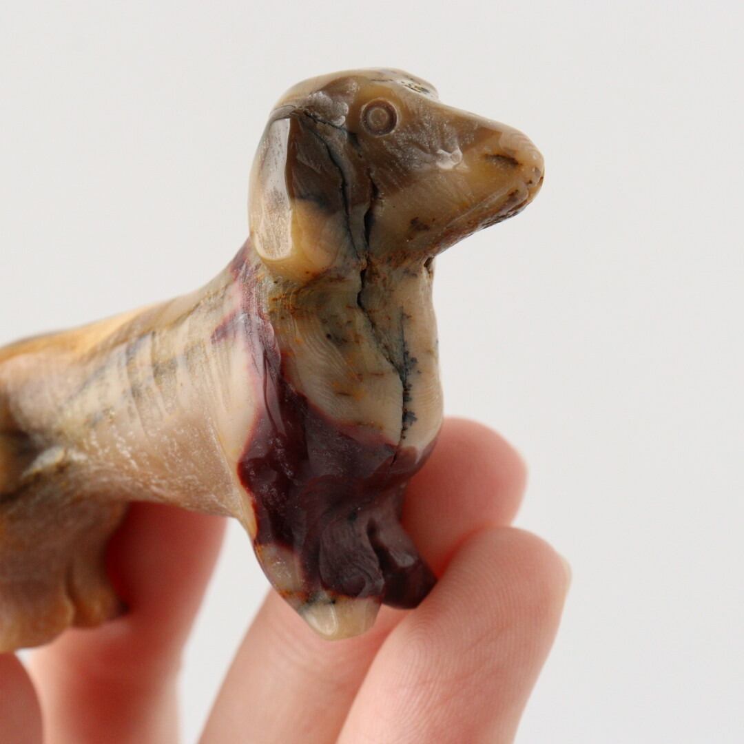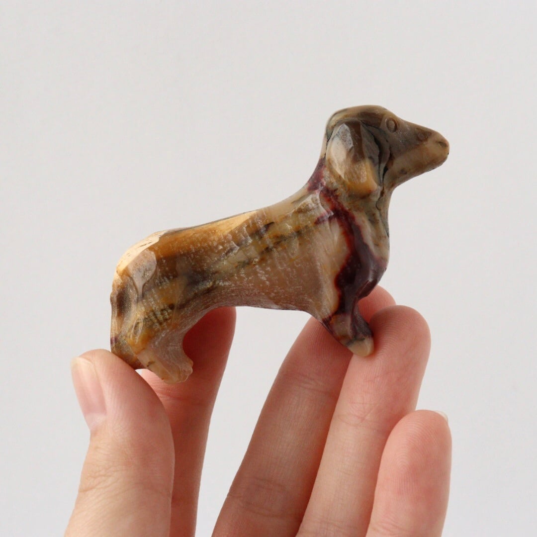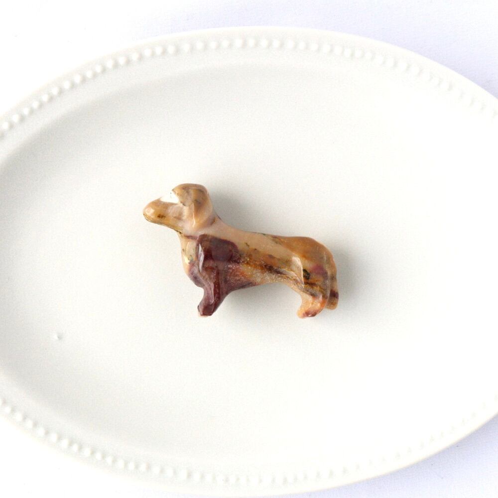 こちらは、イエロー、ブラウン、レッドが優しく入り混じり、ダックスフンドの形に磨かれたムーアカイト。ピクチャージャスパーのような自然の風合いがあり、素朴で温かな印象のひとつ です。